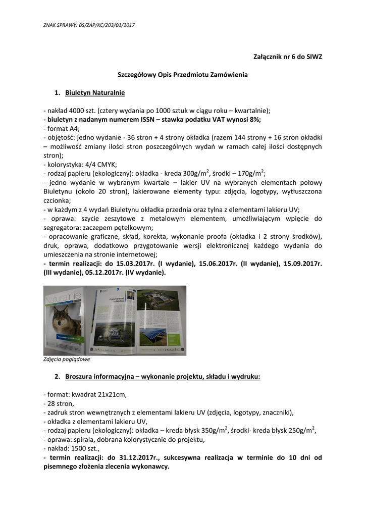 ZNAK SPRAWY: BS/ZAP/KC/203/01/2017 Załącznik nr 6 do SIWZ Szczegółowy Opis Przedmiotu Zamówienia 1. Biuletyn Naturalnie - nakład 4000 szt. (cztery wydania po 1000 sztuk w ciągu roku – kwartalnie); - biuletyn z nadanym numerem ISSN – stawka podatku VAT wynosi 8%; - format A4; - objętość: jedno wydanie - 36 stron + 4 strony okładka (razem 144 strony + 16 stron okładki – możliwość zmiany ilości stron poszczególnych wydań w ramach całej ilości dostępnych stron); - kolorystyka: 4/4 CMYK; - rodzaj papieru (ekologiczny): okładka - kreda 300g/m2, środki – 170g/m2; - jedno wydanie w wybranym kwartale – lakier UV na wybranych elementach połowy Biuletynu (około 20 stron), lakierowane elementy typu: zdjęcia, logotypy, wytłuszczona czcionka; - w każdym z 4 wydań Biuletynu okładka przednia oraz tylna z elementami lakieru UV; - oprawa: szycie zeszytowe z metalowym elementem, umożliwiającym wpięcie do segregatora: zaczepem pętelkowym; - opracowanie graficzne, skład, korekta, wykonanie proofa (okładka i 2 strony środków), druk, oprawa, dodatkowo przygotowanie wersji elektronicznej każdego wydania do umieszczenia na stronie internetowej; - termin realizacji: do 15.03.2017r. (I wydanie), 15.06.2017r. (II wydanie), 15.09.2017r. (III wydanie), 05.12.2017r. (IV wydanie). Zdjęcia poglądowe 2. Broszura informacyjna – wykonanie projektu, składu i wydruku: - format: kwadrat 21x21cm, - 28 stron, - zadruk stron wewnętrznych z elementami lakieru UV (zdjęcia, logotypy, znaczniki), - okładka z elementami lakieru UV, - rodzaj papieru (ekologiczny): okładka – kreda błysk 350g/m2, środki- kreda błysk 250g/m2, - oprawa: spirala, dobrana kolorystycznie do projektu, - nakład: 1500 szt., - termin realizacji: do 31.12.2017r., sukcesywna realizacja w terminie do 10 dni od pisemnego złożenia zlecenia wykonawcy. ZNAK SPRAWY: BS/ZAP/KC/203/01/2017 Zdjęcie poglądowe 3. Broszura informacyjna – wykonanie projektu, składu i wydruku (dwa wzory w trakcie trwania umowy): - format: kwadrat 21x21cm, - nakład: 3000 szt./po 1500 szt. w ramach jednego wzoru, - 2 wzory, - 8 stron, - zadruk z dwóch stron w kolorze, - papier kreda błysk 130g/m2, - okładka z elementami lakieru UV 170g/m2, - termin realizacji: do 31.12.2017, sukcesywna realizacja w terminie 10 dni od pisemnego złożenia zlecenia wykonawcy. Zdjęcie poglądowe 4. Broszura informacyjna – wykonanie projektu, składu i wydruku (trzy wzory w trakcie trwania umowy) - format: 2xDL łamany do DL, - nakład: 4500 szt./po 1500 szt. w ramach jednego wzoru, - 3 wzory, - papier: kreda błysk z elementami lakieru UV 130g/m2, - termin realizacji: do 31.12.2017, sukcesywna realizacja w terminie 10 dni od pisemnego złożenia zlecenia wykonawcy. ZNAK SPRAWY: BS/ZAP/KC/203/01/2017 Zdjęcia poglądowe 5. Wizytówki firmowe - ilość: 30 x 150 sztuk, dwustronne, - kolor: 4/0, - materiał: kreda błysk co najmniej 250g/m2, karton lub inny o zbliżonej gramaturze do akceptacji Zamawiającego, - format: 90x50 mm (szerokość x wysokość) lub inny dostosowany do formatu wizytówek, - wykończenie: powlekanie folią, ewentualnie delikatnie karbowany papier, elementy lakieru UV na obu stronach (po uzgodnieniu z Zamawiającym), - opracowanie graficzne: skład, korekta, druk, - termin realizacji: do 31.12.2017, sukcesywna realizacja w terminie 10 dni od pisemnego złożenia zlecenia wykonawcy. Zdjęcie poglądowe 6. Kalendarze książkowe na 2018 rok – format zbliżony do A4 - nakład: 500 sztuk, - narożniki kalendarium proste, - kalendarium tygodniowe, - wielkość bloku minimum 200x285mm (szerokość x wysokość), zaś maksimum 210x297mm (szerokość x wysokość), przy czym stosunek długości krótszej krawędzi do dłuższej musi wynosić między 0,69 a 0,72 po zaokrągleniu matematycznym, - perfor narożników kalendarium, - papier biały, - minimalna gramatura papieru 80g/m2, - nadruk – 2 kolory, - notes adresowy, - standardowa część informacyjna i mapy, w tym mapy Polski, - wykończenie: blok szyty, - pierwsze 4 kartki kalendarza w formie tzw. doklejki – papier kredowy co najmniej 100g/m2, druk kolorowy z przejściami tonalnymi, treść dostarczona Wykonawcy przez Zamawiającego, OKŁADKA: - okleina skóropodobna, miękka, matowa, o strukturze gładkiej i właściwościach termoprzebarwialnych, - kolor tworzywa: zielony jasny, błękit lub granatowy (2 warianty kolorystyczne - do akceptacji Zamawiającego), - okładka piankowa, - narożniki okładki zaokrąglone, ZNAK SPRAWY: BS/ZAP/KC/203/01/2017 - tłoczenie na okładce: rok 2018 oraz logotyp Zamawiającego (Zamawiający zaakceptuje propozycję wzoru tłoczenia dla roku), WSTĄŻKA - tkana z nazwą WFOŚiGW w Szczecinie – nadruk kolorowy, - szerokość 10mm, - kolor zielony, - termin realizacji: do 31.09.2017. Zdjęcie poglądowe 7. Kalendarz biurkowy tygodniowy stojący na 2018 rok - ilość sztuk: 500, - podstawa: 210x194mm; tektura lita 1,75mm, oklejona papierem typu kraft Eco lub równoważnym, - nadruk CMYK 4+0 (zadrukowany tylko tył kalendarza), - kalendarz: 205x100mm/12 kartek; nadruk 4+0, papier 80g/m2, - notesy: 100x75mm/50 kartek oraz 50x75/50 kartek; nadruk: 4+0 bez spadów, papier samoprzylepny ekologiczny offset 80g/m2 bez nadruku, - termin realizacji: do 31.09.2017. Zdjęcie poglądowe 8. Kalendarz ścienny jednodzielny na 2018 rok - ilość sztuk: 100, - druk: 4+4 (CMYK), - format kalendarza: około 310x420mm (szerokość x wysokość), - główka oraz plecy stanowiące jednorodną całość z linią bigowania powyżej kalendarium, dzięki czemu łatwo złożyć go na pół; główka z otworem umożliwiającym powieszenie kalendarza, drukowana z elementami lakieru UV na kartonie o gramaturze co najmniej 250g/m2, dodatkowo foliowana celem wydobycia głębi kolorów i zwiększająca trwałość kalendarza, ZNAK SPRAWY: BS/ZAP/KC/203/01/2017 - grafika główki zaprojektowana przez Wykonawcę w uzgodnieniu z Zamawiającym, - zrywalny - blok kale