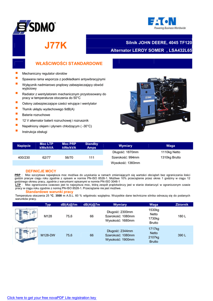Silnik JOHN DEERE, 4045 TF120 J77K Alternator LEROY SOMER , LSA432L65 WŁAŚCIWOŚCI STANDARDOWE Mechaniczny regulator obrotów Spawana rama wsporcza z podkładkami antywibracyjnymi Wyłącznik nadmiarowo prądowy zabezpieczający obwód wyjściowy Radiator z wentylatorem mechanicznym przystosowany do pracy w temperaturze otoczenia do 50°C Osłony zabezpieczające cześci wirujące i wentylator Tłumik ukłądu wydechowego 9dB(A) Baterie rozruchowe 12 V alternator baterii rozruchowej i rozrusznik Napełniony olejem i płynem chłodzącym ( -30°C) Instrukcja obsługi Napięcie 400/230 Moc LTP kWe/kVA 62/77 Moc PRP kWe/kVA 56/70 Standby Amps Wymiary Długość: 1870mm 1110kg Netto 111 Szerokość: 994mm 1310kg Brutto Waga Wysokość: 1360mm DEFINICJE MOCY PRP : Moc szczytowa największa moc możliwa do uzyskania w ramach zmieniających się wartości obciążeń bez ograniczania ilości godzin pracyw ciagu roku zgodnie z opisem w normie PN-ISO 8528-1. Możliwe 10% przeciążenie przez okres 1 godziny w ciągu 12 godzinego okresu pracy, zgodnie z warunkami opisanymi w normie PN-ISO 3046-1 LTP : Moc ograniczona czasowo jest to najwyższa moc, którą zespół prądotwórczy jest w stanie dostarczyć w ograniczonym czasie pracy w ciągu roku zgodnie z normą PN-ISO 8528-1. Przeciążanie nie jest możliwe. Standardowe warunki pracy Temperatura otoczenia 25 °C, 3500 m A.S.L. 60 % wilgotnośc względna. Wszystkie dane techniczne silnika odnoszą się do podanych warunków pracy. Typ M128 M128-DW dB(A)@1m 75,6 75,6 dB(A)@7m Wymiary Waga Zbiornik 66 Długość: 2300mm Szerokość: 1080mm Wysokość: 1680mm 1530kg Netto 1730kg Brutto 180 L 66 Długość: 2344mm Szerokość: 1080mm Wysokość: 1900mm 1717kg Netto 2107kg Brutto 390 L Click here to get your free novaPDF Lite registration key DANE SILNIKA Producent / Model DANE STANDARDOWE UKŁAD WYDECHOWY Układ Paliwa UKŁAD SMAROWANIA BILANS CIEPLNY UKŁAD DOLOTOWY UKŁAD CHŁODZENIA EMISJA SPALIN Układ cylindrów Pojemność Skok / Średnica Stopień sprężania Obroty znamionowe Prędkość tłoka Moc max. w trybie stand przy prędkości znamionowej Stabilność częstotliwości w stanie ustalonym BMEP Type regulatora obrotów Temperatura spalin Przepływ spalin na wydechu Max przeciwciśnienie na wydechu 110% (Stand By power ) 100% (mocy PRP) 75% (mocy PRP) 50% (mocy PRP) Całkowity wydatek pompy paliwa Pojemność całkowita Ciśnienie oleju przy wolnych obrotach Ciśnienie oleju przy obrotach znamionowych Zużycie oleju 100% obciązenia Pojemność miski olejowej Ciepło tracone w spalinach Ciepło promieniowane do otoczenia Ciepło tracone do ukłądu chłodzenia Max. dopuszczalne straty Zużycie powietrza Pojemność całkowita chłodnicy i silnika Max temperatura chlodziwa Temperatura cłodziwa na wyjściu Moc wentylatora Przepływ swobodny powietrza Dopuszczalne straty w przepływie powietrza Typ chłodziwa Termostat PM CO Nox HC Click here to get your free novaPDF Lite registration key JOHN DEERE 4045TF120 , 4-takt, Turbo , [N/A] 4 X L 4.48L [273.4C.I.] 106mm [4.2in.] X 127mm [5.0in.] 17 : 1 1500 Rpm 6.35m/s [20.8ft./s] 68kW [91BHP] +/- 2.5% 11.2bar [162psi] MECA 545°C [1013°F] 176L/s [373cfm] 750mm CE [30in. WG] 17.5L/h [4.6gal/hr] 16L/h [4.2gal/hr] 12L/h [3.2gal/hr] 8.5L/h [2.2gal/hr] 108L/h [28.5gal/hr] 13.5L [3.6gal] 1bar [14.5psi] 5bar [72.5psi] 0.016L/h [0.004gal/hr] 12.5L [3.3gal] 54kW [3070Btu/mn] 8kW [455Btu/mn] 35kW [1990Btu/mn] 625mm CE [25in. WG] 66L/s [140cfm] 23.6L [6.2gal] 105°C [221°F] 93°C [199°F] 2 kW 2.53m3/s [5361cfm] 20mm CE [0.8in. WG] Gencool 82-94 °C 60 mg/Nm3 190 mg/Nm3 3800 mg/Nm3 150 mg/Nm3 SPECIFIKACJA ALTERNATORA DANE OGÓLNE DANE PROJEKTOWE Producent Typ Ilość faz Współczynnik mocy (Cos Phi) Wysokość npm. Prędkośc maxymalna Ilośc biegunów Rodzaj wzbudzenia izolacja : Klasa, odporność temperaturowa Typ regulatora napięcia Całkowita zawarotść harmonicznych (TGH/THC) Kształt napięcia : NEMA = TIF – TGH/THC Kształt napięcia: CEI = FHT – TGH/THC Ilość łożysk Sprzęgło Regulacja napięcia 0 do 100% obciążenia Czas odbudowy napięcia (20% Volt dip) ms SkVA przy 90% nominalego napięcia (dla 0.4PF) Moc PRP @ 40°C Moc LTP @ 27°C Sprawność @ 4/4 obciązenia Przepływ powietrza Współczynnk zwarcia;50 (Kcc) Reaktancja sychroniczna podłużna (Xd) Reaktancja synchroniczna poprzeczna (Xq) Stała czas. przejściowa podł. przy otw obud. twornika;50 (T’do) Reaktancja przejściowa podłuzna (X’d) Stała czasowa przejsciowa podłużna (T’d) Reaktancja podprzejściowa podłuzna (X’’d) Stała czasowa podprzejściowa podłużna (T’’d) Reaktancja podprzejściowa poprzeczna (X’’q) Reaktancja dla składowej zerowej (Xo) Reaktancja dla składowej przeciwnej (X2) Stała czasowa aperiodyczna (Ta) Prąd wzbudzenia bez obciążenia (io) Prąd wzbudzenia przy pełnym obciążeniu (ic) Napięcie wzbudzenia przy pełnym obciązeniu (uc) Czas powrotu do stanu ust. (Delta U = 20% transitoire) Moc rozruchowa silnika (Delta = 20% perm. Or 50% trans.) Transient dip (4/4 charge) – PF : 1.8 AR Straty jałowe Emisja ciepła Click here to get your free novaPDF Lite registration key LEROY SOMER LSA432L65 3 0.8 < 1000 m 2250 rpm 4 SHUNT H /H R230 < 4% < 50 < 2% 1 Direct +/- 1% 500 ms N/A 80 kVA 77 kVA 90.5 % 0.27m3/s [572.09cfm] 0.41 290 % 174 % 1431 ms 10.1 % 50 ms 5% 5 ms 6.3 % 0.2 % 5.7 % 1 ms 0.4 A 1.6 A 29 V 500 ms 240 kVA 13.9 % 1.41kW [1.41Kw] 6.64 kW PANEL KONTROLNY Standard NEXYS Pomiar: Prądów, napięć, częstotliwości Wskażniki: Ostrzeżenie i alarm: o błednym ciśnieniu oleju, za wysoka temperatura chłodziwa, za wysokie obroty ( >60 kVA), Min/max alternator, niski poziom paliwa, wciśniety wyłącznik awaryjny Odczyt parametrów silnika: Ilośc godzin parcy, prędkośc obrotowa, napiecie baterii, poziom paliwa, podgrzewanie wstępne Opcja TELYS Właściwości standardowe: AC woltomierz, AC amperomierz, częstościomierz. Zabezpieczenia stopujące pracę silnika : Ci
