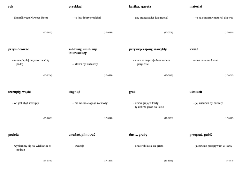 rok przyk¢ad – Szczìûliwego Nowego Roku – to jest dobry przyk¢ad (17-0055) przymocowa… kartka, gazeta – czy przeczyta¢eû juº gazetì? (17-0283) zabawny, ûmieszny, interesuj¿cy – muszì lepiej przymocowa… tì pó¢kì szczup¢y, w¿ski – mam w zwyczaju bra… ranem przysznic (17-0538) ci¿gn¿… – on jest zbyt szczup¢y (17-0803) podróº – wybieramy siì na Wielkanoc w podróº (17-1176) (17-0717) (17-0879) (17-0897) przegra…, gubi… – ona zrobi¢a siì za gruba (17-1254) – ona da¢a mu kwiat – jej uûmiech by¢ szczery t¢usty, gruby – uwaºaj! kwiat uûmiech – dzieci graj¿ w karty – ty dobrze grasz na flecie (17-0849) uwaºa…, pilnowa… (17-0412) (17-0602) gra… – nie wolno ci¿gn¿… za w¢osy! – to za obszerny materia¢ dla was (17-0339) przyzwyczajony, nawyk¢y – klown by¢ zabawny (17-0536) materia¢ – ja zawsze przegrywam w karty (17-1396) (17-1645