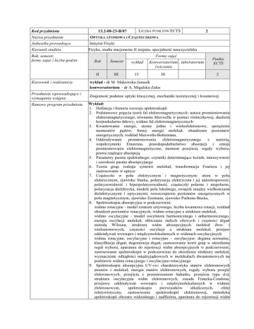 Kod przedmiotu 13.2-08-23-B/07 LICZBA PUNKTÓW ECTS Nazwa przedmiotu OPTYKA ATOMOWA I CZĄSTECZKOWA Jednostka prowadząca Instytut Fizyki Kierunek studiów Fizyka, studia stacjonarne II stopnia, specjalność nauczycielska Rok, semestr, formy zajęć i liczba godzin Kierownik i realizatorzy Przedmioty wprowadzające i wymagania wstępne Ramowy program przedmiotu Formy zajęć Rok Semestr wykład II III 15 Konwersatorium laboratorium ćwiczenia 30 2 Punkty ECTS 2 wykład - dr M. Makowska-Janusik konwersatorium – dr A. Migalska-Zalas Znajomość podstaw optyki klasycznej, mechaniki teoretycznej i kwantowej Wykład: 1. Definicja i historia rozwoju spektroskopii 2. Podstawowe pojęcia teorii fal elektromagnetycznych: natura promieniowania elektromagnetycznego, równania Maxwella w postaci róŜniczkowej, dualizm korpuskularno-falowy, widmo fal elektromagnetycznych 3. Kwantowanie energii, atomy jedno i wieloelektronowe, sprzęŜenie momentów pędów, formy energii molekuł, obsadzenie poziomów energetycznych, rozkład Maxwella-Boltzmana, 4. Oddziaływanie promieniowania elektromagnetycznego z materią, współczynniki Einsteina, prawdopodobieństwo absorpcji i emisji promieniowania elektromagnetyczne, moment przejścia, reguły wyboru, prawa rządzące absorpcją 5. Parametry pasma spektralnego; czynniki determinujące kształt, intensywność i szerokość pasma absorpcyjnego 6. Teoria grup, rodzaje symetrii molekuł, transformacja Fouriera i jej zastosowanie w optyce 7. Cząsteczki w polu elektrycznym i magnetycznym: atom w polu elektrycznym, zjawisko Starka, polaryzacja elektryczna i jej anizotropowość, polaryzowalność i hiperpolaryzowalność, cząsteczki polarne i niepolarne, polaryzacja dielektryka, modele pola lokalnego, związek między wielkościami dielektrycznymi i optycznymi, rozszczepienie poziomów energetycznych w polu magnetycznym, zjawisko Zeemana, zjawisko Pashena-Backa, 8. Spektroskopia absorpcyjna w podczerwieni: widmo rotacyjne - model rotatora sztywnego, liczba kwantowa rotacji, rozkład obsadzeń poziomów rotacyjnych, widmo rotacyjne a struktura molekuł, widmo oscylacyjne - model oscylatora harmonicznego i anharmonicznego, energia oscylacji molekuł, obliczanie stałych siłowych i częstości drgań metodą Wilsona, struktura widm absorpcyjnych molekuł dwu- i wieloatomowych, częstości oscylacji a struktura molekuł, przejaw oddziaływań wewnątrz i międzymolekularnych w widmach oscylacyjnych widma rotacyjne, oscylacyjne i rotacyjno – oscylacyjne: drgania normalne, klasyfikacja drgań, degeneracja drgań, zastosowanie teorii grup w określaniu reguł wyboru, aparatura do rejestracji widm absorpcyjnych w podczerwieni, zastosowanie spektroskopii w podczerwieni do określenia struktury molekuł, wyznaczenie odległości międzyjądrowych w molekułach dwuatomowych na podstawie widma rotacyjnego i oscylacyjno-rotacyjnego 9. Spektroskopia absorpcyjna UV-vis: charakterystyka stanów elektronowych atomów i molekuł, energia stanów elektronowych, reguły wyboru przejść elektronowych, przejścia z przeniesieniem ładunku, przejścia typu d-d, struktura oscylacyjna widm elektronowych, zasada Francka-Condona, przejawy oddziaływań wewnątrz i międzymolekularnych w widmie elektronowym, spektroskopia pierwiastków alkalicznych, efekt relatywistyczny, zastosowanie spektroskopii elektronowej, metodyka spektroskopii obszaru widzialnego i nadfioletu, aparatura do rejestracji widm elektronowych, fluorescencja, fosforescencja 10. Rozpraszanie promieniowania elektromagnetycznego: widmo Ramana, przejścia stokesowskie i antystokesowskie; prawdopodobieństwo rozpraszania ramanowskiego i reguły wyboru 11. Zjawiska optyki nieliniowej: fenomenologia zjawisk nieliniowo-optycznych; klasyfikacja zjawisk nieliniowo-optycznych; parametryczne zjawiska optyki nieliniowej 12. Spektroskopia laserowa: fizyczne zasady działania laserów; lasery gazowe, półprzewodnikowe i jonowe; zasady generacji akcji laserowej; inwersyjne obsadzenie poziomów; ujemny współczynnik absorpcji; pasywne i aktywne modulatory dobroci laserów, holografia 13. Kondensat Bosego-Einstaina, sieci optyczne. Zagadnienia nowoczesnej optyki i optoelektroniki Konwersatorium: Ćwiczenia rachunkowe obejmują rozwiązywanie zadań związanych tematycznie z zastosowaniami praktycznymi merytorycznych treści wykładów. Forma zaliczenia zajęć Ćwiczenia zaliczane na podstawie ustnych odpowiedzi i pisemnych kolokwiów. Zaliczenie przedmiotu odbywa się na podstawie zdanego egzaminu Wykład, ćwiczenia w rozwiązywaniu zadań i problemów związanych z treściami wykładu Metoda dydaktyczna Literatura podstawowa 1. 2. Z. Kęcki „Podstawy spektroskopii molekularnej”, PWN Warszawa 1992 „Fizyka Chemiczna – dynamika molekuł na tle róŜnych metod badawczych” pod red. J. Janik, PWN Warszawa 1989 P. W. Atkins, „Chemia fizyczna” PWN Warszawa 2001 H. Haken, H.C. Wolf, „Atomy i kwanty” PWN Warszawa 1997 H. Haken, H.C. Wolf, „Fizyka molekularna z elementami chemii kwantowej”, PWN Warszawa 1998 J. Sadlej, „Spektroskopia molekularna” Wydawnictwo Nukowo-Techniczne, Warszawa 2002 P. W. Atkins, „Chemia fizyczna, zbiór zadań z rozwiązaniami”, PWN Warszawa 2001 3. 4. 5. 6. 7. Literatura uzupełniająca 1. 2. 3. 4. 5. B. Ziętek „Lasery” Wydawnictwo Naukowe UMK, Toruń 2008 H. Günther, „Spektroskopia magnetycznego rezonansu jądrowego”, PWN Warszawa 1983 J. Stankowski, W. Hilczer, „Wstęp do spektroskopii rezonansów magnetycznych” PWN Warszawa 2005 W. Zieliński, A. Rajcy, „Metody spektroskopowe i ich zastosowanie do identyfikacji związków organicznych” Wydawnictwo Nukowo-Techniczne, Warszawa 2000 A. Bartecki „Spektroskopia elektronowa związków nieorganicznych i kompleksowych” PWN Warszawa 1971