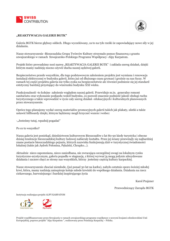 „REAKTYWACJA GALERII BGTK” Galeria BGTK bierze głębszy oddech. Długo wyczekiwany, za to na tyle rześki że zapowiadający nowe siły w jej działaniu. Nasze stowarzyszenie -Bieszczadzka Grupa Twórców Kultury otrzymało pomoc finansową z grantu szwajcarskiego w ramach Szwajcarsko-Polskiego Programu Współpracy -Alpy Karpatom. Projekt który prowadzimy nosi nazwę „REAKTYWACJA GALERII BGTK” i zakłada szereg działań, dzięki którym mamy nadzieję mocno ożywić ducha naszej sędziwej galerii. Bezpieczeństwo przede wszystkim, dla tego podstawowym założeniem projektu jest wymiana i renowacja instalacji elektrycznej w budynku galerii, która już od dłuższego czasu grymasi i groźnie na nas fuczy. W ramach tej części projektu galeria nie tylko zyska na bezpieczeństwie ale również podniesie się jej standard estetyczny bardziej przystający do wizerunku budynku XXI wieku. Funkcjonalność -to kolejne założenie względem naszej galerii. Przewiduje m.in. generalny remont sanitariatu oraz wykonanie podjazdu wokół budynku, co pozwoli znacznie podnieść jakość obsługi ruchu turystycznego a także wprowadzić w życie cały szereg działań edukacyjnych i kulturalnych planowanych przez stowarzyszenie. Oprócz tego planujemy wydać szereg materiałów promocyjnych galerii takich jak plakaty, ulotki a także ustawić billboardy dzięki, którym będziemy mogli krzyczeć wszem i wobec: -„Jesteśmy tutaj, wpadnij pogadać” Po co to wszystko? Nasza galeria jest poniekąd, dziedzictwem kulturowym Bieszczadów z lat 80-90 kiedy turystyka i obecne dzisiaj tendencje bieszczadzkiej kultury ludowej nabierały kształtu. Przez jej ściany przewinęły się najbardziej znane postacie bieszczadzkiego pejzażu, których nazwiska funkcjonują dziś w turystycznej świadomości lokalnej (takie jak Jędrek Połonina, Pękalski, Chrapko...). Aktualnie nieco zapomniana, nieco zaniedbana, nie zwracająca szczególnej uwagi na lokalnym rynku turystyczno-arystycznym, galeria popadła w stagnację, z której wyrwać ją mogą jedynie zdecydowane działania i szczere chęci ze strony nas wszystkich, którzy jesteśmy częścią kultury karpackiej. Nasze stowarzyszenie chociaż niemłode, (już ponad 30 lat na karku), nabyło ostatnio sporo świeżej młodej krwi, która, mamy nadzieję zainspiruje koleje młode krwinki do wspólnego działania. Działania na rzecz ciekawszego, barwniejszego i bardziej inspirującego życia Karol Prajzner Przewodniczący Zarządu BGTK Instytucja realizująca projekt ALPY KARPATOM Projekt współfinansowany przez Szwajcarię w ramach szwajcarskiego programu współpracy z nowymi krajami członkowskimi Unii Europejskiej, poprzez projekt "Alpy Karpatom ", realizowany przez Fundację Karpacką – Polska.