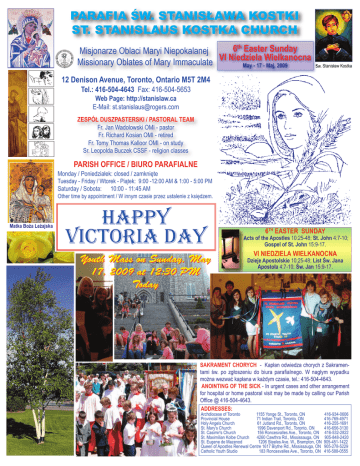 PARAFIA ŚW. STANISŁAWA KOSTKI ST. STANISLAUS KOSTKA CHURCH 6th Easter Sunday Misjonarze Oblaci Maryi Niepokalanej VI Niedziela Wielkanocna Missionary Oblates of Mary Immaculate May - 17 - Maj, 2009 Św. Stanisław Kostka 12 Denison Avenue, Toronto, Ontario M5T 2M4 Tel.: 416-504-4643 Fax: 416-504-5653 Web Page: http://stanislaw.ca E-Mail: [email protected] ZESPÓŁ DUSZPASTERSKI / PASTORAL TEAM Fr. Jan Wadolowski OMI - pastor Fr. Richard Kosian OMI - retired Fr. Tomy Thomas Kalloor OMI - on study Sr. Leopolda Buczek CSSF - religion classes PARISH OFFICE / BIURO PARAFIALNE Monday / Poniedziałek: closed / zamknięte Tuesday - Friday / Wtorek - Piątek: 9:00 -12:00 AM & 1:00 - 5:00 PM Saturday / Sobota: 10:00 - 11:45 AM Other time by appointment / W innym czasie przez ustalenie z księdzem. Matka Boża Leżajska HAPPY VICTORIA DAY Youth Mass on Sunday, May 17, 2009 at 12:30 PM Today 6TH EASTER SUNDAY Acts of the Apostles 10:25-48; St. John 4:7-10; Gospel of St. John 15:9-17. VI NIEDZIELA WIELKANOCNA Dzieje Apostolskie 10:25-48; List Św. Jana Apostoła 4:7-10; Św. Jan 15:9-17. SAKRAMENT CHORYCH - Kapłan odwiedza chorych z Sakramentami św. po zgłoszeniu do biura parafialnego. W nagłym wypadku można wezwać kapłana w każdym czasie, tel.: 416-504-4643. ANOINTING OF THE SICK - In urgent cases and other arrangement for hospital or home pastoral visit may be made by calling our Parish Office @ 416-504-4643. ADDRESSES: Archdiocese of Toronto 1155 Yonge St., Toronto, ON Provincial House 71 Indian Trail, Toronto, ON Holy Angels Church 61 Jutland Rd., Toronto, ON St. Mary's Church 1996 Davenport Rd., Toronto, ON St. Casimir's Church 156 Roncesvalles Ave., Toronto, ON St. Maximilian Kolbe Church 4260 Cawthra Rd., Mississauga, ON St. Eugene de Mazenod 1206 Steeles Ave. W., Brampton, ON Queen of Apostles Renewal Centre 1617 Blythe Rd., Mississauga, ON Catholic Youth Studio 183 Roncesvalles Ave., Toronto, ON 416-934-0606 416-769-4971 416-255-1691 416-656-3130 416-532-2822 905-848-2420 905-451-1422 905-278-5229 416-588-0555 VI NIEDZIELA WIELKANOCNA 6th SUNDAY OF EASTER PSALM: Wobec narodów objawił Zbawienie. PIERWSZA KOMUNIA ŚWIĘTA - już za tydzień w niedzielę, 24 maja, 2009 podczas Mszy św. o godz. 11:00 przed południem. W sobotę, 23 maja, odbędzie się generalna próba od godz. 10:00. Siostra Leopolda bardzo prosi wszystkich o obecność. W najbliższą sobotę dzieci Pierwszokomunijne przystąpią też do Pierwszej Spowiedzi św. Bardzo prosimy Rodziców, aby byli razem ze swymi dzieci podczas całej próby i Spowiedzi św. PIERWSZA & DRUGA ROCZNICA PIERWSZEJ KOMUNII ŚW. będziemy obchodzili w naszej Parafii w niedzielę, 7 czerwca, 2009 podczas Mszy św. dla dzieci o godz. 9:30 rano. Serdecznie zapraszamy rodziców z dziećmi, które przystąpiły do Pierwszej Komunii św. w latach 2007 i 2008. BÓG ZAPŁAĆ ... *** Uczniom z naszej Polskiej Szkoły i dzieciom z zespołu „Stokrotki” za trud włożony w przygotowanie się do akademii z okazji Dnia Matki i piękny występ; paniom kierowniczkom, nauczycielkom i rodzicom za przygotowanie występu oraz wszystkim osobom, które przyczyniły się do uświetnienia święta Matki. Parafianom Bóg zapłać za uczestnictwo w akademii. *** Pani Krystynie Sokol-Randell za przygotowanie kwiatów na Dzień Matki. *** Parafianom za dobre serce i za ofiary złożone w zeszłą na naprawy w budynkach parafialnych. Składka wyniosła $2,723.24. MSZA ŚW. RADIOWA Z NASZEGO KOŚCIOŁA - dzisiejsza Msza św. o godz. 11:00 rano będzie transmitowana w radiu KSM o godz. 20:00 na fali AM 530. Transmisję sponsoruje Sodalicja Mariańska. Bóg zapłać paniom Sodaliskom. Zachęcamy osoby starsze i chore do słuchania Mszy św. radiowej w każdą niedzielę. UROCZYSTOŚĆ ŚW. EUGENIUSZA DE MAZENOD, biskupa Marsylii i założyciela Zgromadzenia Misjonarzy Oblatów Maryi Niepokalanej przypada w czwartek, 21 maja. W czasie nabożeństw majowych w dniach 18, 19 i 20 maja będziemy odmawiać nowennę do Św. Eugeniusza de Mazenod. DRUGA SKŁADKA NA PAPIESKIE DZIEŁA CHARYTATYWNE – dzisiaj, 17 maja, podczas Mszy św. jest zbierana druga składka przeznaczona na Dzieła Papieskie. Ojciec Święty pomaga ludziom dotkniętym klęskami żywiołowymi, konfliktami i trudnościami życiowymi. Kopertki są wyłożone w wejściu do kościoła. Ofiary są wliczane do rozliczenia podatkowego. Bóg zapłać za złożone ofiary. KAWA I CIASTO – Komitet Parafialny zaprasza na kawę i ciasto do sali parafialnej po każdej Mszy św. „NIEDZIELA” – z dołączonym albumem pt. „Świadkowie cudów”. Album zawiera świadectwa ludzi, którzy doznali łask i cudów za przyczyną sługi Bożego Jana Pawła II. Czasopismo w cenie $5.00 jest do nabycia w kruchcie kościoła. TRZECIA I OSTATNIA KOLEKTA NA SHARE-LIFE będzie zbierana w niedzielę, 7 czerwca w czasie Mszy św. Serdeczne Bóg zapłać za składane ofiary. NOWENNĘ DO DUCHA ŚWIĘTEGO – będziemy odmawiać codziennie, przez kolejnych dziewięć dni, od piątku, 22 maja do soboty, 30 maja (włącznie) w czasie nabożeństw majowych. Uroczystość Zesłania Ducha Świętego przypada w 31 maja. *** ZA TYDZIEŃ PIERWSZA KOMUNIA ŚW. *** *** *** NEXT SUNDAY FIRST HOLY COMMUNION *** May 17 maja, 2009 URODZINY O. PROBOSZCZA: Sto Lat Ojcze Janie! Wczoraj, 16 maja nasz ks. Proboszcz, O. Jan Wądołowski, OMI obchodził swoje urodziny. Z tej okazji w imieniu Rady Parafialnej i członków wszystkich organizacji parafialnych oraz wszystkich wiernych parafian życzymy O. Janowi, aby Bóg darzył go zdrowiem i obfitością łask w każdym dniu posługi duszpasterskiej pośród nas, a Maryja Niepokalanie Poczęta kształtowała jego serce na wzór Serca swego Syna. Rada Parafialna PODZIĘKOWANIE DLA O. PROBOSZCZA Prezeska Koła Pań „Nadzieja” przy SPK Nr 20, pani Halina Drożdżal, i wszystkie członkinie z głębi serca dziękują swojemu opiekunowi O. Janowi Wądołowskiemu OMI za jego obecność i przewodniczenie 