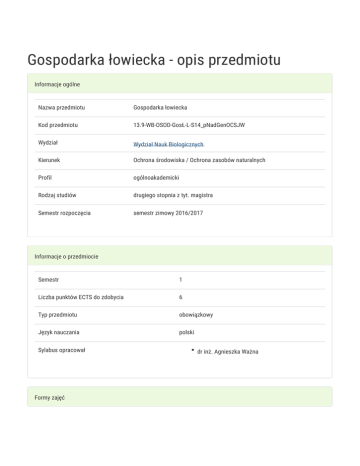 Gospodarka łowiecka - opis przedmiotu Informacje ogólne Nazwa przedmiotu Gospodarka łowiecka Kod przedmiotu 13.9-WB-OSOD-GosŁ-L-S14_pNadGenOCSJW Wydział Wydział Nauk Biologicznych Kierunek Ochrona środowiska / Ochrona zasobów naturalnych Profil ogólnoakademicki Rodzaj studiów drugiego stopnia z tyt. magistra Semestr rozpoczęcia semestr zimowy 2016/2017 Informacje o przedmiocie Semestr 1 Liczba punktów ECTS do zdobycia 6 Typ przedmiotu obowiązkowy Język nauczania polski Sylabus opracował Formy zajęć dr inż. Agnieszka Ważna Forma zajęć Laboratorium Liczba godzin Liczba godzin Liczba godzin w Liczba godzin w Forma w semestrze w tygodniu semestrze tygodniu zaliczenia (stacjonarne) (stacjonarne) (niestacjonarne) (niestacjonarne) 30 2 - - Zaliczenie na ocenę Wykład 15 1 - - Egzamin Cel przedmiotu Celem kształcenia jest zapoznanie studenta z podstawami biologii i ekologii zwierząt łownych w Polsce. Student pozna najważniejsze cechy pozwalające na oznaczanie zwierząt łownych oraz najważniejsze zagadnienia z zakresu prawa łowieckiego. Student nabędzie umiejętność wyceny trofeów łowieckich. Wymagania wstępne Znajomość zoologii kręgowców. Zakres tematyczny WYKŁAD Historia łowiectwa w Polsce i na świecie. Prawo łowieckie. Ekologia zwierzyny łownej w różnych typach środowisk. Charakterystyka krajowych gatunków zwierząt łownych. Gatunki introdukowane. LABORATORIUM Oznaczanie zwierząt łownych. Oznaczanie tropów i śladów zwierząt. Gospodarowanie zwierzyną łowną w kołach łowieckich. Trofea łowieckie i ich wycena. Tradycja łowiecka. Język łowiecki. Etyka łowiecka. Metody kształcenia WYKŁAD metoda podająca: prezentacja multimedialna. LABORATORIUM metoda podająca: prezentacja multimedialna metoda praktyczna: samodzielna praca studenta z preparatami Efekty kształcenia i metody weryfikacji osiągania efektów kształcenia Opis efektu Student objaśnia złożone zjawiska i Symbole efektów Metody weryfikacji KOS2A_W01 Forma zajęć test Wykład procesy zachodzące w środowisku Laboratorium przyrodniczym. Student dokonuje oceny swoich KOS2A_U10 umiejętności z ochrony środowiska w aktywność w Laboratorium trakcie zajęć kontekście swojej przyszłości naukowej i zawodowej. Student rozumie potrzebę uczenia się i KOS2A_K01 doskonalenia swoich umiejętności w aktywność w Laboratorium trakcie zajęć zakresie poznawania środowiska przyrodniczego i problemów ochrony przyrody. Warunki zaliczenia Na ocenę z przedmiotu składa się ocena zaliczeniowa z wykładu oraz ćwiczeń. Wykład - warunkiem zaliczenia jest zdanie pisemnego egzaminu (50 pytań – pozytywna odpowiedź 60%). Laboratorium - warunkiem zaliczenia jest uzyskanie pozytywne zaliczenie kolokwium zaliczeniowego (30 pytań– pozytywna odpowiedź 60%) oraz obecność i aktywność na zajęciach. Obciążenie pracą Obciążenie pracą Studia Studia niestacjonarne stacjonarne (w godz.) (w godz.) Godziny kontaktowe (udział w zajęciach; konsultacjach; egzaminie, itp.) 70 - Samodzielna praca studenta (przygotowanie do: zajęć, kolokwium, 80 - Łącznie 150 - Punkty ECTS Studia Studia niestacjonarne egzaminu; studiowanie literatury przygotowanie: pracy pisemnej, projektu, prezentacji, raportu, wystąpienia; itp.) stacjonarne Zajęcia z udziałem nauczyciela akademickiego 3 - Zajęcia bez udziału nauczyciela akademickiego 3 - Łącznie 6 - Literatura podstawowa 1. Okarma, H., Tomek A. Łowiectwo. Wydawnictwo edukacyjno-naukowe H2O. 2008. 2. Biały, K. (red.).: Podstawy łowiectwa, Wyd. Łowiec Polski, Warszawa, 1994. 3. Godlewski, S.: Vademecum myśliwego, Bellona, Warszawa, 2000. 4. Romanowski, J.: Śladami zwierząt, KAW, Warszawa, 1990. Literatura uzupełniająca Uwagi Zmodyfikowane przez dr inż. Agnieszka Ważna (ostatnia modyfikacja: 15-09-2016 21:44)