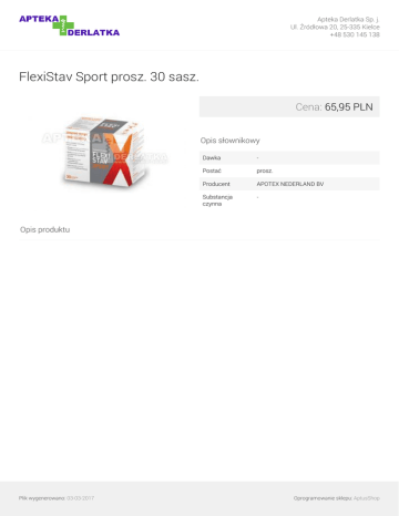 Apteka Derlatka Sp. j. Ul. Źródłowa 20, 25-335 Kielce +48 530 145 138 FlexiStav Sport prosz. 30 sasz. Cena: 65,95 PLN Opis słownikowy Dawka - Postać prosz. Producent APOTEX NEDERLAND BV Substancja czynna - Opis produktu Plik wygenerowano: 03-03-2017 Powered by TCPDF (www.tcpdf.org) Oprogramowanie sklepu: AptusShop