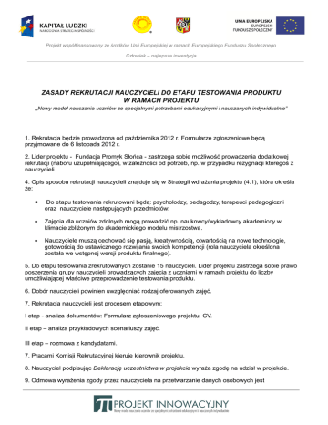 Projekt współfinansowany ze środków Unii Europejskiej w ramach Europejskiego Funduszu Społecznego Człowiek – najlepsza inwestycja ZASADY REKRUTACJI NAUCZYCIELI DO ETAPU TESTOWANIA PRODUKTU W RAMACH PROJEKTU „Nowy model nauczania uczniów ze specjalnymi potrzebami edukacyjnymi i nauczanych indywidualnie” 1. Rekrutacja będzie prowadzona od października 2012 r. Formularze zgłoszeniowe będą przyjmowane do 6 listopada 2012 r. 2. Lider projektu - Fundacja Promyk Słońca - zastrzega sobie możliwość prowadzenia dodatkowej rekrutacji (naboru uzupełniającego), w zależności od potrzeb, np. w przypadku rezygnacji któregoś z nauczycieli. 4. Opis sposobu rekrutacji nauczycieli znajduje się w Strategii wdrażania projektu (4.1), która określa że: Do etapu testowania rekrutowani będą: psycholodzy, pedagodzy, terapeuci pedagogiczni oraz nauczyciele następujących przedmiotów: Zajęcia dla uczniów zdolnych mogą prowadzić np. naukowcy/wykładowcy akademiccy w klimacie zbliżonym do akademickiego modelu mistrzostwa. Nauczyciele muszą cechować się pasją, kreatywnością, otwartością na nowe technologie, gotowością do ustawicznego rozwijania swoich kompetencji (rola nauczyciela określona została we wstępnej wersji produktu finalnego). 5. Do etapu testowania zrekrutowanych zostanie 15 nauczycieli. Lider projektu zastrzega sobie prawo poszerzenia grupy nauczycieli prowadzących zajęcia z uczniami w ramach projektu do liczby umożliwiającej właściwe przeprowadzenie testowania produktu. 6. Dobór nauczycieli powinien uwzględniać rodzaj oferowanych zajęć. 7. Rekrutacja nauczycieli jest procesem etapowym: I etap - analiza dokumentów: Formularz zgłoszeniowego projektu, CV. II etap – analiza przykładowych scenariuszy zajęć. III etap – rozmowa z kandydatami. 7. Pracami Komisji Rekrutacyjnej kieruje kierownik projektu. 8. Nauczyciel podpisując Deklarację uczestnictwa w projekcie wyraża zgodę na udział w projekcie. 9. Odmowa wyrażenia zgody przez nauczyciela na przetwarzanie danych osobowych jest Projekt współfinansowany ze środków Unii Europejskiej w ramach Europejskiego Funduszu Społecznego Człowiek – najlepsza inwestycja jednoznaczna z brakiem możliwości udziału w projekcie. 10. Efektem zakończonego procesu rekrutacji jest Lista nauczycieli zakwalifikowanych do projektu przez Komisję Rekrutacyjną. 11. Zasady rekrutacji zatwierdza Dyrektor Generalny Fundacji. Wrocław, 15 września 2012r.