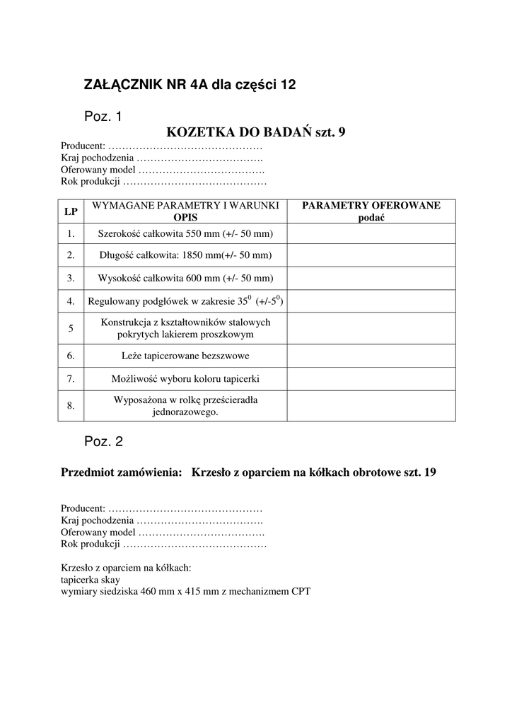 ZAŁĄCZNIK NR 4A dla części 12 Poz. 1 KOZETKA DO BADAŃ szt. 9 Producent: ……………………………………… Kraj pochodzenia ………………………………. Oferowany model ………………………………. Rok produkcji …………………………………… LP WYMAGANE PARAMETRY I WARUNKI OPIS 1. Szerokość całkowita 550 mm (+/- 50 mm) 2. Długość całkowita: 1850 mm(+/- 50 mm) 3. Wysokość całkowita 600 mm (+/- 50 mm) 4. Regulowany podgłówek w zakresie 350 (+/-50) 5 Konstrukcja z kształtowników stalowych pokrytych lakierem proszkowym 6. Leże tapicerowane bezszwowe 7. Możliwość wyboru koloru tapicerki 8. Wyposażona w rolkę prześcieradła jednorazowego. PARAMETRY OFEROWANE podać Poz. 2 Przedmiot zamówienia: Krzesło z oparciem na kółkach obrotowe szt. 19 Producent: ……………………………………… Kraj pochodzenia ………………………………. Oferowany model ………………………………. Rok produkcji …………………………………… Krzesło z oparciem na kółkach: tapicerka skay wymiary siedziska 460 mm x 415 mm z mechanizmem CPT Poz. 3 Przedmiot zamówienia: system siedzeń zespolonych szt. 54. Producent: ……………………………………… Kraj pochodzenia ………………………………. Oferowany model ………………………………. Rok produkcji …………………………………… System siedzeń zespolonych: wysokość 75,0 cm głębokość 48,6 cm Siedzenie plastikowe( różne warianty 2,3,4 pozycyjne) całkowita ilość siedzeń pojedynczych 54 Poz. 4 Przedmiot zamówienia: kanapa do siedzenia szt. 2 Producent: ……………………………………… Kraj pochodzenia ………………………………. Oferowany model ………………………………. Rok produkcji …………………………………… Kanapa do siedzenia 220 cm x 90 cm – tapicerka skay Poz. 5 Przedmiot zamówienia: kanapa do siedzenia szt. 1 Producent: ……………………………………… Kraj pochodzenia ………………………………. Oferowany model ………………………………. Rok produkcji …………………………………… Kanapa do siedzenia 220 cm x 90 cm rozkładana tapicerka skay Poz. 6 Przedmiot zamówienia: Szafki laminowane na kółkach pod blat szt. 7 Producent: ……………………………………… Kraj pochodzenia ………………………………. Oferowany model ………………………………. Rok produkcji …………………………………… Szafki laminowane na kółkach pod blat Wymiary: 40 cm x 65 cm x 54 cm Z 1 szufladą , półka , zamek w drzwiach ,blat Kółka 7,5 cm z hamulcem 2 szt klasy Brickle guma nie brudząca Poz. 7 Przedmiot zamówienia: Szafka laminowana wisząca szt. 14 (13.9mb) Producent: ……………………………………… Kraj pochodzenia ………………………………. Oferowany model ………………………………. Rok produkcji …………………………………… Szafka laminowana wisząca 100 cm x 70 cm x 30 cm z półką Poz. 8 Przedmiot zamówienia: zabudowa umywalki w szafie laminowanej szt. 2 Producent: ……………………………………… Kraj pochodzenia ………………………………. Oferowany model ………………………………. Rok produkcji …………………………………… Zabudowa umywalki w szafie laminowanej 80 cm x 50 cm x 180 cm. Umywalka wpuszczana w blat , ociekacz.. Poz. 9 Przedmiot zamówienia: Szafa biurowa szt. 9 Producent: ……………………………………… Kraj pochodzenia ………………………………. Oferowany model ………………………………. Rok produkcji …………………………………… Szafa biurowa 90 cm x 45 cm x 240 cm laminowana z nadstawką. Drzwi pełne zamykane na zamek, 6 półek. Poz. 10 Przedmiot zamówienia: Krzesło z oparciem szt. 19 Producent: ……………………………………… Kraj pochodzenia ………………………………. Oferowany model ………………………………. Rok produkcji …………………………………… Krzesło z oparciem: szer. 54,5 cm. głęb. 42,5 cm. wysk.82,0 cm. tapicerka skay podstawa chrom Poz. 11 Przedmiot zamówienia: Regał magazynowy ze stali nierdzewnej szt. 6 Producent: ……………………………………… Kraj pochodzenia ………………………………. Oferowany model ………………………………. Rok produkcji …………………………………… Regał magazynowy ze stali nierdzewnej Wymiary: 110 cm x 60 cm x 200cm, 6 półek. Poz. 12 Przedmiot zamówienia: Regał magazynowy na środki czystości szt. 1 Producent: ……………………………………… Kraj pochodzenia ………………………………. Oferowany model ………………………………. Rok produkcji …………………………………… Regał magazynowy na środki czystości Wymiary: 160 cm x 40 cm x 200 cm. Poz. 13 Przedmiot zamówienia: Biurko laminowane szt. 11 Producent: ……………………………………… Kraj pochodzenia ………………………………. Oferowany model ………………………………. Rok produkcji …………………………………… Biurko 130 cm x 70 cm laminowane blat pogrubiony z prawej strony szafka z szufladą, drzwi zamykane na zamek, z lewej box na komputer, półka wysuwana na klawiaturę. Poz. 14 Przedmiot zamówienia: Biurko kątowe laminowane szt. 1 Producent: ……………………………………… Kraj pochodzenia ………………………………. Oferowany model ………………………………. Rok produkcji …………………………………… Biurko kątowe Wymiary: 180 cm x 150 cm x 60 cm laminowane blat pogrubiony strona wewnętrzna blatu wykończona łukiem prawej strony szafka z szufladą ,drzwi zamykane na zamek , z lewej box na komputer , półka wysuwana na kl