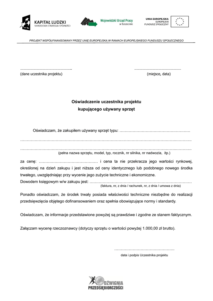 Oświadczenie uczestnika projektu kupującego używany sprzęt