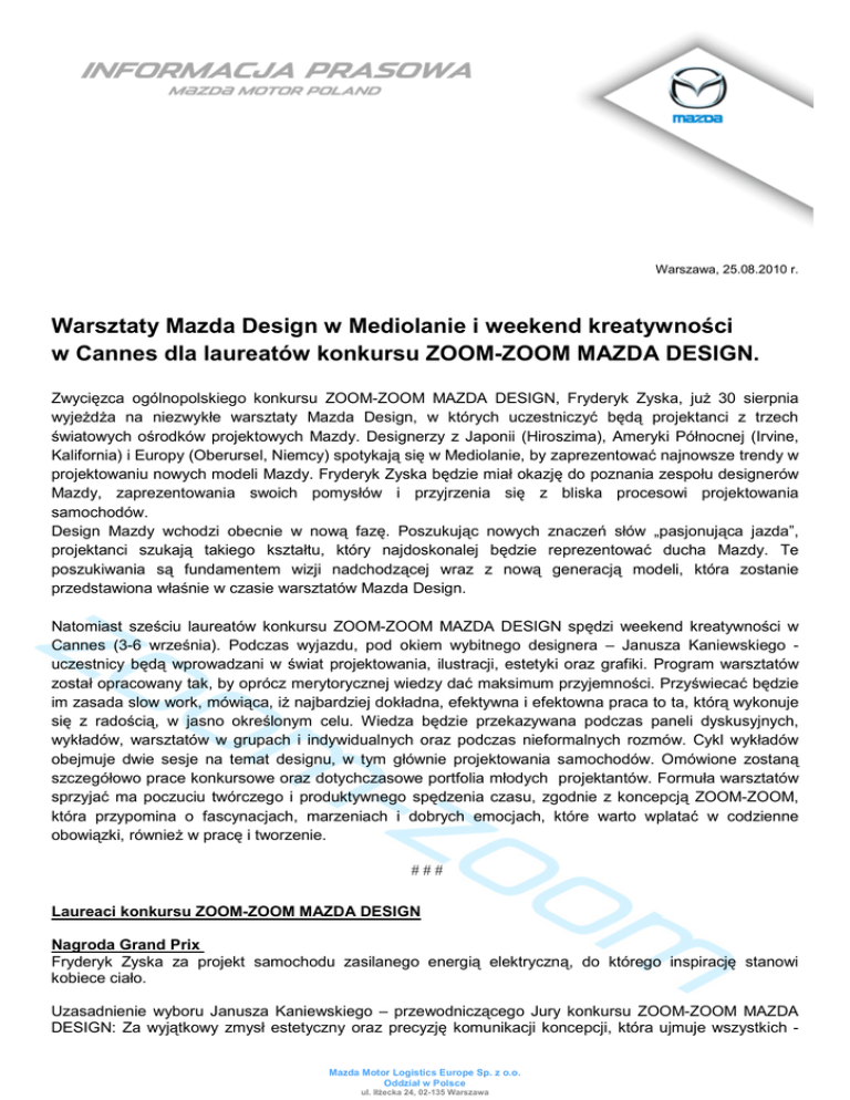 Warszawa, 25.08.2010 r. Warsztaty Mazda Design w Mediolanie i weekend kreatywno(ci w Cannes dla laureatów konkursu ZOOM-ZOOM MAZDA DESIGN. Zwyci zca ogólnopolskiego konkursu ZOOM-ZOOM MAZDA DESIGN, Fryderyk Zyska, ju* 30 sierpnia wyje*d*a na niezwyk,e warsztaty Mazda Design, w których uczestniczy/ b d1 projektanci z trzech 2wiatowych o2rodków projektowych Mazdy. Designerzy z Japonii (Hiroszima), Ameryki Pó,nocnej (Irvine, Kalifornia) i Europy (Oberursel, Niemcy) spotykaj1 si w Mediolanie, by zaprezentowa/ najnowsze trendy w projektowaniu nowych modeli Mazdy. Fryderyk Zyska b dzie mia, okazj do poznania zespo,u designerów Mazdy, zaprezentowania swoich pomys,ów i przyjrzenia si z bliska procesowi projektowania samochodów. Design Mazdy wchodzi obecnie w now1 faz . Poszukuj1c nowych znacze< s,ów „pasjonuj1ca jazda”, projektanci szukaj1 takiego kszta,tu, który najdoskonalej b dzie reprezentowa/ ducha Mazdy. Te poszukiwania s1 fundamentem wizji nadchodz1cej wraz z now1 generacj1 modeli, która zostanie przedstawiona w,a2nie w czasie warsztatów Mazda Design. Natomiast sze2ciu laureatów konkursu ZOOM-ZOOM MAZDA DESIGN sp dzi weekend kreatywno2ci w Cannes (3-6 wrze2nia). Podczas wyjazdu, pod okiem wybitnego designera – Janusza Kaniewskiego uczestnicy b d1 wprowadzani w 2wiat projektowania, ilustracji, estetyki oraz grafiki. Program warsztatów zosta, opracowany tak, by oprócz merytorycznej wiedzy da/ maksimum przyjemno2ci. Przy2wieca/ b dzie im zasada slow work, mówi1ca, i* najbardziej dok,adna, efektywna i efektowna praca to ta, któr1 wykonuje si z rado2ci1, w jasno okre2lonym celu. Wiedza b dzie przekazywana podczas paneli dyskusyjnych, wyk,adów, warsztatów w grupach i indywidualnych oraz podczas nieformalnych rozmów. Cykl wyk,adów obejmuje dwie sesje na temat designu, w tym g,ównie projektowania samochodów. Omówione zostan1 szczegó,owo prace konkursowe oraz dotychczasowe portfolia m,odych projektantów. Formu,a warsztatów sprzyja/ ma poczuciu twórczego i produktywnego sp dzenia czasu, zgodnie z koncepcj1 ZOOM-ZOOM, która przypomina o fascynacjach, marzeniach i dobrych emocjach, które warto wplata/ w codzienne obowi1zki, równie* w prac i tworzenie. ### Laureaci konkursu ZOOM-ZOOM MAZDA DESIGN Nagroda Grand Prix Fryderyk Zyska za projekt samochodu zasilanego energi1 elektryczn1, do którego inspiracj kobiece cia,o. stanowi Uzasadnienie wyboru Janusza Kaniewskiego – przewodnicz1cego Jury konkursu ZOOM-ZOOM MAZDA DESIGN: Za wyj1tkowy zmys, estetyczny oraz precyzj komunikacji koncepcji, która ujmuje wszystkich Mazda Motor Logistics Europe Sp. z o.o. Oddzia w Polsce ul. I ecka 24, 02-135 Warszawa profesjonalistów i internautów. Grand Prix w konkursie ZOOM-ZOOM MAZDA DESIGN przyznali2my z my2l1 o ogromnym potencjale Laureata, maj1c nadziej , *e nagroda ta przyczyni si do realizacji zwyci skiego projektu oraz stanie si zach t1 do rozwijania przysz,ych, równie twórczych koncepcji. Laureaci, którzy wyjad1 na warsztaty kreatywno(ci z Januszem Kaniewskim na Lazurowe Wybrze e: Kategoria samochód: 1. Maciej Meroniuk za projekt Coleopter, samochodu z mo*liwo2ci1 podzia,u na dwie mobilne cz 2ci 2. Emil Czuma,owski za projekt Mazda - Kisame 2, czyli „rekin-demon” 3. Mateusz Wowk za projekt pojazdu trójko,owego z nap dem elektrycznym Kategoria element u*ytkowy do samochodu: 1. Micha, Pilarczyk za pomys, inteligentnych lusterek 2. Tomasz Siemek za projekt roweru stworzonego z my2l1 o pojazdach typu coupe 3. Marcin Konicki za rozwi1zanie MY WORLD 1, które ,1czy w sobie funkcj kluczyka, telefonu komórkowego, GPS, odtwarzacz audio oraz modu, pami ci indywidualnych ustawie< samochodu. Szczegó,owe wyniki konkursu znajduj1 si na stronie www.mazdadesign.pl ### Konkurs ZOOM-ZOOM MAZDA DESIGN to ogólnopolski konkurs designu, którego celem by,o zach cenie jak najwi kszej liczby profesjonalistów i amatorów do podzielenia si swoimi pomys,ami na przedmiot u*ytkowy do samochodu, jak i na projekt wymarzonego pojazdu. G,ównym warunkiem z,o*enia pracy by,o uko<czone 18 lat i wys,anie swojego projektu mi dzy 26 kwietnia a 7 czerwca poprzez stron konkursow1 www.mazdadesign.pl Uczestnicy konkursu ZOOM-ZOOM MAZDA DESIGN mogli zg,osi/ dowoln1 liczb prac w dwóch kategoriach: samochód i element u*ytkowy do samochodu. W sumie nadesz,o 480 prac spe,niaj1cych warunki regulaminu. Ponad 80% z nich zg,oszono w kategorii samochód. Pozosta,e 20% to projekty przedstawiaj1ce ró*ne pomys,y na element u*ytkowy do samochodu. Organizatorem konkursu by,a Mazda Motor Poland, a Instytut Wzornictwa Przemys,owego obj1, patronat nad konkursem. ### ZOOM-ZOOM - uczucie jedyne w swoim rodzaju. Zoom-Zoom to emocje, m,odo2/ duszy, entuzjazm, ekspresja, dynamizm, sportowy duch oraz rado2/ z jazdy samochodem. Od 2002 roku Zoom-Zoom jest filozofi1 Mazdy. Ka*dy model w gamie Mazdy zosta, zaprojektowany po to, by zapewnia/ wyj1tkow1 przyjemno2/ jazdy. Wi cej o Zoom-Zoom: www.mazda.pl Kontakt prasowy: Magdalena W glewska tel. 022 318 19 80, kom. 606 600 260, e-mail: [email protected], Strona prasowa: www.mazda-press.pl 2/2