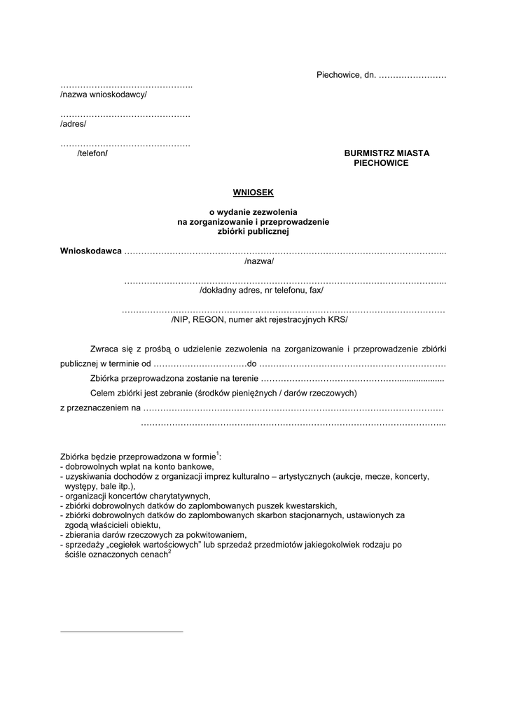 Piechowice, dn. …………………… ……………………………………….. /nazwa wnioskodawcy/ ………………………………………. /adres/ ………………………………………. /telefon/ BURMISTRZ MIASTA PIECHOWICE WNIOSEK o wydanie zezwolenia na zorganizowanie i przeprowadzenie zbiórki publicznej Wnioskodawca …………………………………………………………………………………………………... /nazwa/ …………………………………………………………………………………………………... /dokładny adres, nr telefonu, fax/ …………………………………………………………………………………………………… /NIP, REGON, numer akt rejestracyjnych KRS/ Zwraca się z prośbą o udzielenie zezwolenia na zorganizowanie i przeprowadzenie zbiórki publicznej w terminie od ……………………………do ………………………………………………………… Zbiórka przeprowadzona zostanie na terenie ………………………………………….................... Celem zbiórki jest zebranie (środków pieniężnych / darów rzeczowych) z przeznaczeniem na ……………………………………………………………………………………………. ……………………………………………………………………………………………... 1 Zbiórka będzie przeprowadzona w formie : - dobrowolnych wpłat na konto bankowe, - uzyskiwania dochodów z organizacji imprez kulturalno – artystycznych (aukcje, mecze, koncerty, występy, bale itp.), - organizacji koncertów charytatywnych, - zbiórki dobrowolnych datków do zaplombowanych puszek kwestarskich, - zbiórki dobrowolnych datków do zaplombowanych skarbon stacjonarnych, ustawionych za zgodą właścicieli obiektu, - zbierania darów rzeczowych za pokwitowaniem, - sprzedaży „cegiełek wartościowych” lub sprzedaż przedmiotów jakiegokolwiek rodzaju po 2 ściśle oznaczonych cenach UZASADNIENIE 3 ………………………………………………………………………………………………….............................. ………………………………………………………………………………………………….............................. ………………………………………………………………………………………………….............................. ………………………………………………………………………………………………….............................. ………………………………………………………………………………………………….............................. ………………………………………………………………………………………………….............................. ………………………………………………………………………………………………….............................. ………………………………………………………………………………………………….............................. ………………………………………………………………………………………………….............................. 4 Podpis/y Załączniki: 1. Statut wnioskodawcy lub akt organizacyjny komitetu zorganizowanego dla przeprowadzenia określonego celu, 2. Aktualny wyciąg z rejestru sądowego, 3. Plan przeprowadzenia zbiórki, 5 4. Wzory cegiełek w poszczególnych nominałach 3 W uzasadnieniu wniosku należy wykazać zgodność celów planowanej zbiórki z celami statusowymi wnioskodawcy i uzasadnić konieczność przeprowadzenia zbiórki. 4 Wniosek musi być podpisany przez osoby uprawnione do składania oświadczeń woli w imieniu instytucji, która jest wnioskodawcą. 5 Wpisuje tylko wnioskodawca ubiegający się o rozprowadzanie cegiełek wartościowych. Piechowice, dn. …………………… ……………………………………….. /nazwa wnioskodawcy/ ………………………………………. /adres/ ………………………………………. /telefon/ BURMISTRZ MIASTA PIECHOWICE PLAN PRZEPROWADZENIA ZBIÓRKI PUBLICZNEJ I. Cel (lub cele), na który mają być przeznaczone środki pochodzące z tej zbiórki - zgodne ze statutem lub aktem organizacyjnym wnioskodawcy ………………………………………………………………………………………………….............................. ………………………………………………………………………………………………….............................. ………………………………………………………………………………………………….............................. II. Formy przeprowadzenia zbiórki publicznej …………………………………………………………………………………………………............................. ………………………………………………………………………………………………….............................. ………………………………………………………………………………………………….............................. III. Termin rozpoczęcia i zakończenia zbiórki publicznej ………………………………………………………………………………………………….............................. IV. Miejsce przeprowadzenia zbiórki publicznej ………………………………………………………………………………………………….............................. ………………………………………………………………………………………………….............................. ………………………………………………………………………………………………….............................. V. Spos