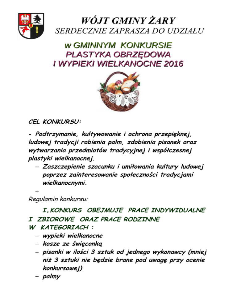 WÓJT GMINY ŻARY SERDECZNIE ZAPRASZA DO UDZIAŁU w GMINNYM KONKURSIE PLASTYKA OBRZĘDOWA I WYPIEKI WIELKANOCNE 2016 CEL KONKURSU: - Podtrzymanie, kultywowanie i ochrona przepięknej, ludowej tradycji robienia palm, zdobienia pisanek oraz wytwarzania przedmiotów tradycyjnej i współczesnej plastyki wielkanocnej. – Zaszczepienie szacunku i umiłowania kultury ludowej poprzez zainteresowanie społeczności tradycjami wielkanocnymi. – Regulamin konkursu: I.KONKURS OBEJMUJE PRACE INDYWIDUALNE I ZBIOROWE ORAZ PRACE RODZINNE W KATEGORIACH : – wypieki wielkanocne – kosze ze święconką – pisanki w ilości 3 sztuk od jednego wykonawcy (mniej niż 3 sztuki nie będzie brane pod uwagę przy ocenie konkursowej) – palmy – śmirgusy – inne formy plastyki obrzędowej (dekoracje, serwety, stroiki, świeczniki, witraże itp.) II. PRACE ZBIOROWE POWINNY SPEŁNIAĆ NASTĘPUJĄCE KRYTERIA: – liczba wykonawców nie większa niż 10 osób – zawartość i jakość ekspozycji powinna odzwierciedlać indywidualny wkład pracy wykonawców. III. KATEGORIA-PRACE RODZINNE obejmuje prace: – przygotowane przez dziecko przy pomocy osoby dorosłej – złożone z elementów wykonanych przez osobę dorosłą i elementów wykonanych przez dziecko. W obydwu przypadkach wkład pracy dziecka powinien być ewidentny. IV. WARUNKI KONKURSU: 1. Każdą pracę należy podpisać imieniem i nazwiskiem oraz podać dokładny adres i wiek wykonawcy (w latach)- prace niedokładnie opisane nie będą brane pod uwagę przy ocenie . 2.Uczestnik konkursu zobowiązany jest do złożenia prac w świetlicy wiejskiej w ŁAZIE w dniu 14 marca 2016 r. w godz. od 8.00 do 18.00 3. OCENY PRAC I PODZIAŁU NAGRÓD DOKONA KOMISJA POWOŁANA PRZEZ ORGANIZATORA W DNIU 16.03.2016 r. 4. W DNIU 17.03.2016r. W GODZINACH OD 8.00 DO 18.00 – zapraszamy na WYSTAWĘ PRAC BIORĄCYCH UDZIAŁ W KONKURSIE 5. OGŁOSZENIE WYNIKÓW KONKURSU I WRĘCZENIE NAGRÓD – w dniu 18.03.2016 r. o godz. 14.00 6. PRACE OCENIANE BĘDĄ W GRUPACH WIEKOWYCH: – do 16 lat – powyżej 16 lat 7. PISANKI BĘDĄ KLASYFIKOWANE I NAGRADZANE W GRUPACH: – pisanki o ludowych motywach zdobniczych – pisanki o współczesnych motywach zdobniczych 8.PRACE POWINNY BYĆ WYKONANE SAMODZIELNIE OD PRODUKTU DO WYROBU. WYKORZYSTYWANIE ELEMENTÓW GOTOWYCH OBNIŻY WARTOŚĆ PRACY. PRACE DO ODBIORU WYŁĄCZNIE W DNIU WRĘCZENIA NAGRÓD tj. 18.03.2016 r. do godz. 15.30- prace nie odebrane w terminie nie będą przechowywane! V. DODATKOWYCH INFORMACJI UDZIELAJĄ: Ewa Kusion-UG Żary, pok. 201, tel. 68 470 73 35 Katarzyna Marciniak tel. 68 470 73 32