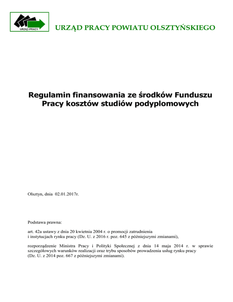 Regulamin finansowania ze środków Funduszu Pracy kosztów studiów podyplomowych Olsztyn, dnia 02.01.2017r. Podstawa prawna: art. 42a ustawy z dnia 20 kwietnia 2004 r. o promocji zatrudnienia i instytucjach rynku pracy (Dz. U. z 2016 r. poz. 645 z późniejszymi zmianami), rozporządzenie Ministra Pracy i Polityki Społecznej z dnia 14 maja 2014 r. w sprawie szczegółowych warunków realizacji oraz trybu sposobów prowadzenia usług rynku pracy (Dz. U. z 2014 poz. 667 z późniejszymi zmianami). §1 1. Starosta może finansować ze środków Funduszu Pracy koszty studiów podyplomowych podejmowanych na terenie kraju w systemie wieczorowym lub zaocznym bezrobotnemu. 2. Warunkiem pozytywnego rozpatrzenia wniosku jest min. uprawdopodobnienie przez bezrobotnego, że ukończenie wskazanych studiów zapewni uzyskanie odpowiedniej pracy lub podjęcie działalności gospodarczej. 3. Uprawdopodobnienie, o którym mowa w ust. 2 następuje: - w wyniku złożenia przez pracodawcę pisemnej deklaracji zatrudnienia bezrobotnego. - w wyniku złożenia przez bezrobotnego pisemnej deklaracji dotyczącej rozpoczęcia działalności gospodarczej lub - na podstawie prognoz dotyczących rynku pracy. §2 1. Finansowanie, o którym mowa w § 1 ust. 1 przysługuje osobie bezrobotnej zarejestrowanej w urzędzie pracy, która: 1) posiada wykształcenie wyższe, 2) nie przekroczyła wysokości dochodu na osobę w rodzinie w rozumieniu przepisów o pomocy społecznej, uprawniającego do świadczeń z pomocy społecznej, 3) w okresie 12 miesięcy przed dniem złożenia wniosku nie odrzuciła bez uzasadnionej przyczyny propozycji odpowiedniego zatrudnienia, innej pracy zarobkowej, szkolenia, przygotowania zawodowego dorosłych, wykonywania prac interwencyjnych lub robót publicznych, 4) złożyła przed dniem podjęcia studiów podyplomowych wniosek o finansowanie studiów podyplomowych, 5) uprawdopodobniła zatrudnienie, inną pracę zarobkową lub samozatrudnienie po zakończeniu nauki, 6) w dniu rozpoczęcia studiów podyplomowych była osobą bezrobotną. §3 1. Osoba bezrobotna składa wniosek o finansowanie kosztów studiów podyplomowych zawierający: 1) imię i nazwisko oraz numer PESEL osoby wnioskującej, a w przypadku cudzoziemca numer dokumentu stwierdzającego tożsamość, i adres zamieszkania tej osoby; 2) nazwę i termin realizacji studiów podyplomowych oraz nazwę i adres organizatora; 3) koszt studiów podyplomowych; 4) uzasadnienie potrzeby udzielenia tej formy pomocy. 2. Do wniosku o finansowanie studiów podyplomowych, o którym mowa w § 3 ust. 1 bezrobotny jest zobowiązany dołączyć: 1) zaświadczenie z uczelni potwierdzające termin rozpoczęcia studiów podyplomowych, kierunek, wysokość opłaty za studia oraz system i terminy płatności; 2) oświadczenie bezrobotnego, określające wysokość dochodu w rodzinie za miesiąc poprzedzający złożenie wniosku; 3) deklarację pracodawcy zapewniającego zatrudnienie po ukończeniu studiów podyplomowych. 3. Przy ocenie wniosku urząd bierze pod uwagę: 1) okres bezrobocia wnioskodawcy, 2) zapotrzebowanie pracodawców na pracowników posiadających kwalifikacje uzyskane po zakończeniu studiów, 3) sytuację materialną wnioskodawcy, 4) wielkość środków Funduszu Pracy przeznaczonych na finansowanie bezrobotnym studiów podyplomowych; 5) możliwość aktywizacji w ramach innych form pomocy, w tym posiadanych ofert pracy. 4. O uwzględnieniu lub odmowie uwzględnienia wniosku Urząd Pracy powiadamia bezrobotnego w formie pisemnej w terminie 30 dni od dnia złożenia wniosku. 5. Wnioski niekompletne lub nieprawidłowo wypełnione nie zostaną uwzględnione. §4 1. Starosta zawiera z bezrobotnym umowę na finansowanie kosztów studiów podyplomowych. 2. Zawierając umowę osoba bezrobotna zobowiązuje się m.in. do: 1) zwrotu finansowania kosztów studiów podyplomowych w przypadku nieukończenia lub przerwania studiów podyplomowych z winy osoby korzystającej z finansowania tych studiów; 2) powiadomienia urzędu pracy o podjęciu, kontynuowaniu na kolejnych semestrach i ukończeniu studiów podyplomowych oraz przedstawienia dyplomu ukończenia tych studiów. §5 1. Finansowanie studiów podyplomowych przyznaje się na wniosek osoby bezrobotnej w wysokości do 100% kosztów studiów podyplomowych, nie więcej jednak niż 300% przeciętnego wynagrodzenia. 2. Bezrobotnemu, któremu zostało przyznane finansowanie kosztów studiów podyplomowych, za okres uczestnictwa w zajęciach przewidzianych programem studiów przysługuje stypendium w wysokości 20 % zasiłku. 3. W przypadku podjęcia przez uczestnika studiów podyplomowych zatrudnienia, innej pracy zarobkowej lub działalności gospodarczej w trakcie ich odbywania, nie zawiesza się finansowania tych studiów, jak również nie zawiesza się wypłaty stypendium, o którym mowa w § 5 ust.2, do planowanego terminu ich ukończenia. 4. W przypadku przerwania studiów podyplomowych z winy uczestnika, kwota wydatkowana na ich finansowanie z Funduszu Pracy podlega zwrotowi. 5. Uczestnikowi studiów podyplomowych, który w trakcie ich trwania podjął zatrudnienie, inną pracę zarobkową lub działalność gospodarczą, przysługuje odszkodowanie z tytułu ubezpieczenia od następstw nieszczęśliwych wypadków powstałych w związku ze studiami podyplomowymi oraz w drodze do miejsca studiów i z powrotem, wypłacane przez instytucję ubezpieczeniową, w której uczestnik ten został ubezpieczony. 6. Starosta ubezpiecza ze środków Funduszu Pracy uczestnika studiów podyplomowych, o którym mowa w § 5 ust. 5 od następstw nieszczęśliwych wypadków, z wyłączeniem przypadku, gdy uczestnik posiada już takie ubezpieczenie. 7. W ramach przyznanego bezrobotnemu finansowania studiów podyplomowych, Urząd Pracy dokonuje wpłaty na wskazane konto uczelni, w uzgodnieniu z uczelnią (wpłaty ratalne lub jednorazowo). 8. Urząd nie finansuje kosztów przejazdu z miejsca zamieszkania do miejsca