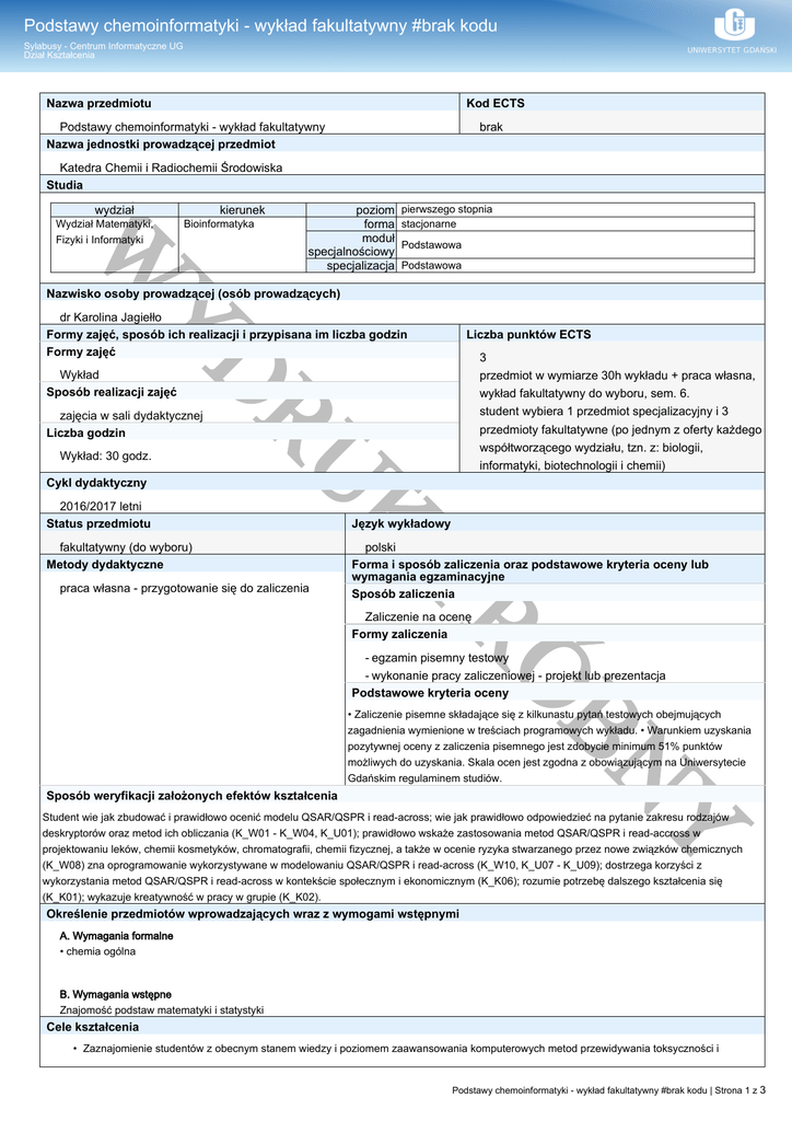 Podstawy chemoinformatyki - wykład fakultatywny #brak kodu Sylabusy - Centrum Informatyczne UG Dział Kształcenia Nazwa przedmiotu Kod ECTS Podstawy chemoinformatyki - wykład fakultatywny Nazwa jednostki prowadzącej przedmiot brak Katedra Chemii i Radiochemii Środowiska Studia wydział Wydział Matematyki, Fizyki i Informatyki kierunek Bioinformatyka W poziom forma moduł specjalnościowy specjalizacja pierwszego stopnia stacjonarne Podstawowa Podstawowa Nazwisko osoby prowadzącej (osób prowadzących) Y dr Karolina Jagiełło Formy zajęć, sposób ich realizacji i przypisana im liczba godzin Formy zajęć 3 przedmiot w wymiarze 30h wykładu + praca własna, wykład fakultatywny do wyboru, sem. 6. student wybiera 1 przedmiot specjalizacyjny i 3 przedmioty fakultatywne (po jednym z oferty każdego współtworzącego wydziału, tzn. z: biologii, informatyki, biotechnologii i chemii) D Wykład Sposób realizacji zajęć Liczba punktów ECTS Wykład: 30 godz. Cykl dydaktyczny fakultatywny (do wyboru) Metody dydaktyczne K 2016/2017 letni Status przedmiotu RU zajęcia w sali dydaktycznej Liczba godzin polski Forma i sposób zaliczenia oraz podstawowe kryteria oceny lub wymagania egzaminacyjne Sposób zaliczenia PR praca własna - przygotowanie się do zaliczenia Język wykładowy Zaliczenie na ocenę Formy zaliczenia Ó - egzamin pisemny testowy - wykonanie pracy zaliczeniowej - projekt lub prezentacja Podstawowe kryteria oceny BN • Zaliczenie pisemne składające się z kilkunastu pytań testowych obejmujących zagadnienia wymienione w treściach programowych wykładu. • Warunkiem uzyskania pozytywnej oceny z zaliczenia pisemnego jest zdobycie minimum 51% punktów możliwych do uzyskania. Skala ocen jest zgodna z obowiązującym na Uniwersytecie Gdańskim regulaminem studiów. Sposób weryfikacji założonych efektów kształcenia Y Student wie jak zbudować i prawidłowo ocenić modelu QSAR/QSPR i read-across; wie jak prawidłowo odpowiedzieć na pytanie zakresu rodzajów deskryptorów oraz metod ich obliczania (K_W01 - K_W04, K_U01); prawidłowo wskaże zastosowania metod QSAR/QSPR i read-accross w projektowaniu leków, chemii kosmetyków, chromatografii, chemii fizycznej, a także w ocenie ryzyka stwarzanego przez nowe związków chemicznych (K_W08) zna oprogramowanie wykorzystywane w modelowaniu QSAR/QSPR i read-across (K_W10, K_U07 - K_U09); dostrzega korzyści z wykorzystania metod QSAR/QSPR i read-across w kontekście społecznym i ekonomicznym (K_K06); rozumie potrzebę dalszego kształcenia się (K_K01); wykazuje kreatywność w pracy w grupie (K_K02). Określenie przedmiotów wprowadzających wraz z wymogami wstępnymi A. Wymagania formalne • chemia ogólna B. Wymagania wstępne Znajomość podstaw matematyki i statystyki Cele kształcenia • Zaznajomienie studentów z obecnym stanem wiedzy i poziomem zaawansowania komputerowych metod przewidywania toksyczności i Podstawy chemoinformatyki - wykład fakultatywny #brak kodu | Strona 1 z 3 Podstawy chemoinformatyki - wykład fakultatywny #brak kodu Sylabusy - Centrum Informatyczne UG Dział Kształcenia wybranych właściwości fizykochemicznych rekomendowanych w rozporządzeniu REACH jako metody alternatywne. • Zapoznanie studentów z metodologią QSAR, QSPR, read-across i ich współczesnymi wyzwaniami. • Zapoznanie studentów z dostępnym oprogramowaniem, które może być użyte w modelowaniu toksyczności i wybranych właściwości fizykochemicznych substancji chemicznych. Treści programowe BN Y 1. Najważniejsze komputerowe metody przewidywania toksyczności i wybranych właściwości fizykochemicznych. 2. Źródła danych eksperymentalnych do modelowania QSAR, QSPR i read-across. 3. Metody wstępnej kontroli danych: problem brakujących danych oraz tzw. punktów odbiegających, transformacje zmiennych, normalizacja rozkładu, badanie korelacji i kowariancji pomiędzy zmiennymi. 4. Idea i metody obliczania deskryptorów strukturalnych. 5. Wykorzystanie metod analizy podobieństwa oraz metod read-across do grupowania związków chemicznych. 6. Etapy budowania i walidacji modeli QSAR, QSPR i read-across. Wiarygodność modeli QSAR, QSPR i read-across. Kryteria jakości dla modeli QSAR i QSPR występujące w REACH oraz w regulacjach prawnych innych państw (Japonia, USA). 7. Kryteria jakości modelu QSAR/QSPR sugerowane przez OECD, które muszą być spełnione, aby wyniki zostały uznane za wiarygodne. 8. Wytyczne Wspólnotowego Centrum Badawczego w zakresie QSAR. Wykaz literatury RU Efekty kształcenia (obszarowe i kierunkowe) K PR Ó A.1. wykorzystywana podczas zajęć • Rozporządzenie (WE) nr 1907/2006 Parlamentu Europejskiego i Rady z dnia 18 grudnia 2006 r. w sprawie rejestracji, oceny, udzielania zezwoleń i stosowanych ograniczeń w zakresie chemikaliów (REACH) i utworzenia Europejskiej Agencji Chemikaliów, zmieniajace dyrektywe 1999/45/WE oraz uchylajace rozporzadzenie Rady (EWG) nr 793/93 i rozporzadzenie Komisji (WE) nr 1488/94, jak równiez dyrektywe Rady 76/769/EWG i dyrektywy Komisji 91/155/EWG, 93/67/EWG, 93/105/WE i 2000/21/WE. • OECD 2004: Guidance Document on the Use of Multimedia Models for Estimatig Overall Environmental Persistence and Long-Range Transprt, OECD Environment, Health and Safety Publications, Paris, France. A.2. studiowana samodzielnie przez studenta • G.W vanLoon, S.J. Duffy: Chemia środowiska. Wydawnictwo Naukowe PWN (2008). ISBN: 978-83-01-15324-3. • T. Puzyn, A. Mostrąg-Szlichtyng, N. Suzuki, M. Haranczyk. Metody chemometryczne w ocenie ryzyka: Ilościowe za-leżności pomiędzy strukturą chemiczną a właściwościami (QSPR) dla nowych rodzajów zanieczyszczeń chemicznych. W: Zuba D., Parczewski A. (Eds.): Chemometria w nauce i praktyce. Wydawnictwo Instytutu Ekspertyz Sądowych, Kraków (2009). ISBN: 978-83-87425-38-8. B. Literatura uzupełniająca: • J. B. Czermiński, A. Iwasiewicz i in.: „Metody statystyczne w doświadczalnictwie chemicznym”, Wydawni