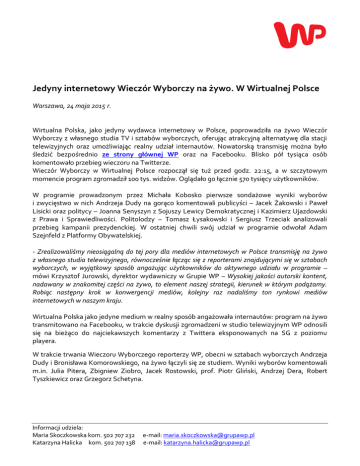 Jedyny internetowy Wieczór Wyborczy na żywo. W Wirtualnej Polsce Warszawa, 24 maja 2015 r. Wirtualna Polska, jako jedyny wydawca internetowy w Polsce, poprowadziła na żywo Wieczór Wyborczy z własnego studia TV i sztabów wyborczych, oferując atrakcyjną alternatywę dla stacji telewizyjnych oraz umożliwiając realny udział internautów. Nowatorską transmisję można było śledzić bezpośrednio ze strony głównej WP oraz na Facebooku. Blisko pół tysiąca osób komentowało przebieg wieczoru na Twitterze. Wieczór Wyborczy w Wirtualnej Polsce rozpoczął się tuż przed godz. 22:15, a w szczytowym momencie program zgromadził 100 tys. widzów. Oglądało go łącznie 570 tysięcy użytkowników. W programie prowadzonym przez Michała Kobosko pierwsze sondażowe wyniki wyborów i zwycięstwo w nich Andrzeja Dudy na gorąco komentowali publicyści – Jacek Żakowski i Paweł Lisicki oraz politycy – Joanna Senyszyn z Sojuszy Lewicy Demokratycznej i Kazimierz Ujazdowski z Prawa i Sprawiedliwości. Politolodzy – Tomasz Łysakowski i Sergiusz Trzeciak analizowali przebieg kampanii prezydenckiej. W ostatniej chwili swój udział w programie odwołał Adam Szejnfeld z Platformy Obywatelskiej. - Zrealizowaliśmy nieosiągalną do tej pory dla mediów internetowych w Polsce transmisję na żywo z własnego studia telewizyjnego, równocześnie łącząc się z reporterami znajdującymi się w sztabach wyborczych, w wyjątkowy sposób angażując użytkowników do aktywnego udziału w programie – mówi Krzysztof Jurowski, dyrektor wydawniczy w Grupie WP – Wysokiej jakości autorski kontent, nadawany w znakomitej części na żywo, to element naszej strategii, kierunek w którym podążamy. Robiąc następny krok w konwergencji mediów, kolejny raz nadaliśmy ton rynkowi mediów internetowych w naszym kraju. Wirtualna Polska jako jedyne medium w realny sposób angażowała internautów: program na żywo transmitowano na Facebooku, w trakcie dyskusji zgromadzeni w studio telewizyjnym WP odnosili się na bieżąco do najciekawszych komentarzy z Twittera eksponowanych na SG z poziomu playera. W trakcie trwania Wieczoru Wyborczego reporterzy WP, obecni w sztabach wyborczych Andrzeja Dudy i Bronisława Komorowskiego, na żywo łączyli się ze studiem. Wyniki wyborów komentowali m.in. Julia Pitera, Zbigniew Ziobro, Jacek Rostowski, prof. Piotr Gliński, Andrzej Dera, Robert Tyszkiewicz oraz Grzegorz Schetyna. Informacji udziela: Maria Skoczkowska kom. 502 707 232 Katarzyna Halicka kom. 502 707 138 e-mail: [email protected] e-mail: [email protected] - Wirtualna Polska konsekwentnie realizuje swój plan, stać się pierwszym źródłem informacji dla internautów. W trakcie całej kampanii prezydenckiej, oferowaliśmy rzetelną publicystykę wysokiej klasy, obiektywny, wyczerpujący i najświeższy kontent: analizy uznanych ekspertów, wywiady z najważniejszymi i najciekawszymi kandydatami w wyborach, a także autorskie materiały wideo – mówi Sławomir Cedzyński, redaktor naczelny Serwisów Informacyjnych WP.– Naturalną konsekwencją ciągłego podnoszenia jakości materiałów produkowanych w naszej redakcji było stworzenie pierwszego w Polsce wieczoru wyborczego na żywo, współtworzonego wraz z użytkownikami. Powyborcze podsumowania i analizy przedstawiano przygotowywanymi na bieżąco infografikami ilustrującymi m.in. poparcie dla obu polityków w poszczególnych częściach kraju czy preferencje mieszkańców wsi i miast. Już w poniedziałek, 25 maja, o godzinie 9.00, w programie #dziejesienazywo, prowadzonym przez Michała Kobosko, politycy – Michał Boni i Paweł Kowal oraz politolog i publicysta Michał Sutowski ocenią przebieg kampanii oraz skomentują wyniki wyborów. Reakcję zagranicznych mediów na wyniki II tury wyborów prezydenckich w Polsce przedstawią korespondenci zagraniczni Wirtualnej Polski w Stanach Zjednoczonych, Wielkiej Brytanii i Niemczech. Źródło: dane wewnętrzne Grupy WP Informacji udziela: Maria Skoczkowska kom. 502 707 232 Katarzyna Halicka kom. 502 707 138 e-mail: [email protected] e-mail: [email protected]