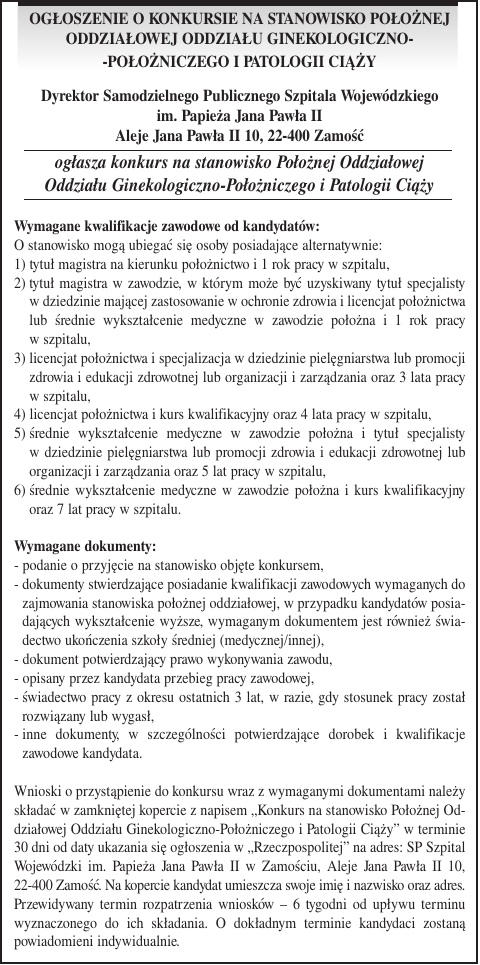 OGŁOSZENIE O KONKURSIE NA STANOWISKO POŁOŻNEJ ODDZIAŁOWEJ ODDZIAŁU GINEKOLOGICZNO-POŁOŻNICZEGO I PATOLOGII CIĄŻY Dyrektor Samodzielnego Publicznego Szpitala Wojewódzkiego im. Papieża Jana Pawła II Aleje Jana Pawła II 10, 22-400 Zamość ogłasza konkurs na stanowisko Położnej Oddziałowej Oddziału Ginekologiczno-Położniczego i Patologii Ciąży Wymagane kwalifikacje zawodowe od kandydatów: O stanowisko mogą ubiegać się osoby posiadające alternatywnie: 1) tytuł magistra na kierunku położnictwo i 1 rok pracy w szpitalu, 2) tytuł magistra w zawodzie, w którym może być uzyskiwany tytuł specjalisty w dziedzinie mającej zastosowanie w ochronie zdrowia i licencjat położnictwa lub średnie wykształcenie medyczne w zawodzie położna i 1 rok pracy w szpitalu, 3) licencjat położnictwa i specjalizacja w dziedzinie pielęgniarstwa lub promocji zdrowia i edukacji zdrowotnej lub organizacji i zarządzania oraz 3 lata pracy w szpitalu, 4) licencjat położnictwa i kurs kwalifikacyjny oraz 4 lata pracy w szpitalu, 5) średnie wykształcenie medyczne w zawodzie położna i tytuł specjalisty w dziedzinie pielęgniarstwa lub promocji zdrowia i edukacji zdrowotnej lub organizacji i zarządzania oraz 5 lat pracy w szpitalu, 6) średnie wykształcenie medyczne w zawodzie położna i kurs kwalifikacyjny oraz 7 lat pracy w szpitalu. Wymagane dokumenty: - podanie o przyjęcie na stanowisko objęte konkursem, - dokumenty stwierdzające posiadanie kwalifikacji zawodowych wymaganych do zajmowania stanowiska położnej oddziałowej, w przypadku kandydatów posiadających wykształcenie wyższe, wymaganym dokumentem jest również świadectwo ukończenia szkoły średniej (medycznej/innej), - dokument potwierdzający prawo wykonywania zawodu, - opisany przez kandydata przebieg pracy zawodowej, - świadectwo pracy z okresu ostatnich 3 lat, w razie, gdy stosunek pracy został rozwiązany lub wygasł, - inne dokumenty, w szczególności potwierdzające dorobek i kwalifikacje zawodowe kandydata. Wnioski o przystąpienie do konkursu wraz z wymaganymi dokumentami należy składać w zamkniętej kopercie z napisem „Konkurs na stanowisko Położnej Oddziałowej Oddziału Ginekologiczno-Położniczego i Patologii Ciąży” w terminie 30 dni od daty ukazania się ogłoszenia w „Rzeczpospolitej” na adres: SP Szpital Wojewódzki im. Papieża Jana Pawła II w Zamościu, Aleje Jana Pawła II 10, 22-400 Zamość. Na kopercie kandydat umieszcza swoje imię i nazwisko oraz adres. Przewidywany termin rozpatrzenia wniosków – 6 tygodni od upływu terminu wyznaczonego do ich składania. O dokładnym terminie kandydaci zostaną powiadomieni indywidualnie.