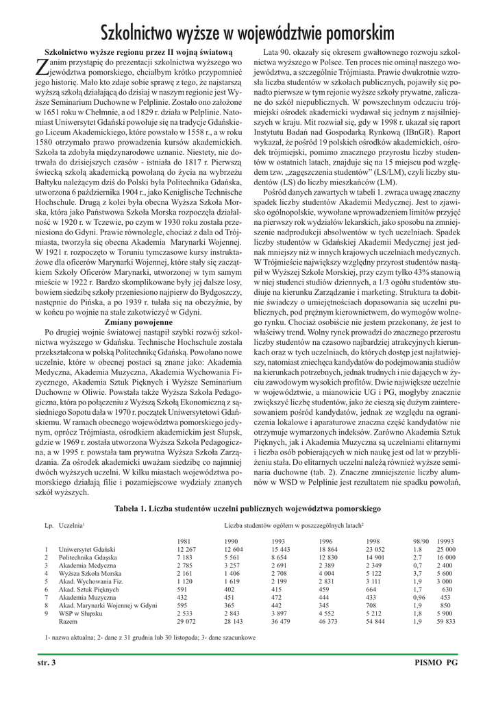 Szkolnictwo wy¿sze w województwie pomorskim Szkolnictwo wy¿sze regionu przez II wojn¹ wiatow¹ anim przyst¹piê do prezentacji szkolnictwa wy¿szego wo jewództwa pomorskiego, chcia³bym krótko przypomnieæ jego historiê. Ma³o kto zdaje sobie sprawê z tego, ¿e najstarsz¹ wy¿sz¹ szko³¹ dzia³aj¹c¹ do dzisiaj w naszym regionie jest Wy¿sze Seminarium Duchowne w Pelplinie. Zosta³o ono za³o¿one w 1651 roku w Che³mnie, a od 1829 r. dzia³a w Pelplinie. Natomiast Uniwersytet Gdañski powo³uje siê na tradycje Gdañskiego Liceum Akademickiego, które powsta³o w 1558 r., a w roku 1580 otrzyma³o prawo prowadzenia kursów akademickich. Szko³a ta zdoby³a miêdzynarodowe uznanie. Niestety, nie dotrwa³a do dzisiejszych czasów - istnia³a do 1817 r. Pierwsz¹ wieck¹ szko³¹ akademick¹ powo³an¹ do ¿ycia na wybrze¿u Ba³tyku nale¿¹cym dzi do Polski by³a Politechnika Gdañska, utworzona 6 padziernika 1904 r., jako Keniglische Technische Hochschule. Drug¹ z kolei by³a obecna Wy¿sza Szko³a Morska, która jako Pañstwowa Szko³a Morska rozpoczê³a dzia³alnoæ w 1920 r. w Tczewie, po czym w 1930 roku zosta³a przeniesiona do Gdyni. Prawie równolegle, chocia¿ z dala od Trójmiasta, tworzy³a siê obecna Akademia Marynarki Wojennej. W 1921 r. rozpoczêto w Toruniu tymczasowe kursy instrukta¿owe dla oficerów Marynarki Wojennej, które sta³y siê zacz¹tkiem Szko³y Oficerów Marynarki, utworzonej w tym samym miecie w 1922 r. Bardzo skomplikowane by³y jej dalsze losy, bowiem siedzibê szko³y przeniesiono najpierw do Bydgoszczy, nastêpnie do Piñska, a po 1939 r. tu³a³a siê na obczynie, by w koñcu po wojnie na sta³e zakotwiczyæ w Gdyni. Zmiany powojenne Po drugiej wojnie wiatowej nast¹pi³ szybki rozwój szkolnictwa wy¿szego w Gdañsku. Technische Hochschule zosta³a przekszta³cona w polsk¹ Politechnikê Gdañsk¹. Powo³ano nowe uczelnie, które w obecnej postaci s¹ znane jako: Akademia Medyczna, Akademia Muzyczna, Akademia Wychowania Fizycznego, Akademia Sztuk Piêknych i Wy¿sze Seminarium Duchowne w Oliwie. Powsta³a tak¿e Wy¿sza Szko³a Pedagogiczna, która po po³¹czeniu z Wy¿sz¹ Szko³¹ Ekonomiczn¹ z s¹siedniego Sopotu da³a w 1970 r. pocz¹tek Uniwersytetowi Gdañskiemu. W ramach obecnego województwa pomorskiego jedynym, oprócz Trójmiasta, orodkiem akademickim jest S³upsk, gdzie w 1969 r. zosta³a utworzona Wy¿sza Szko³a Pedagogiczna, a w 1995 r. powsta³a tam prywatna Wy¿sza Szko³a Zarz¹dzania. Za orodek akademicki uwa¿am siedzibê co najmniej dwóch wy¿szych uczelni. W kilku miastach województwa pomorskiego dzia³aj¹ filie i pozamiejscowe wydzia³y znanych szkó³ wy¿szych. Z Lata 90. okaza³y siê okresem gwa³townego rozwoju szkolnictwa wy¿szego w Polsce. Ten proces nie omin¹³ naszego województwa, a szczególnie Trójmiasta. Prawie dwukrotnie wzros³a liczba studentów w szko³ach publicznych, pojawi³y siê ponadto pierwsze w tym rejonie wy¿sze szko³y prywatne, zaliczane do szkó³ niepublicznych. W powszechnym odczuciu trójmiejski orodek akademicki wydawa³ siê jednym z najsilniejszych w kraju. Mit rozwia³ siê, gdy w 1998 r. ukaza³ siê raport Instytutu Badañ nad Gospodark¹ Rynkow¹ (IBnGR). Raport wykaza³, ¿e poród 19 polskich orodków akademickich, orodek trójmiejski, pomimo znacznego przyrostu liczby studentów w ostatnich latach, znajduje siê na 15 miejscu pod wzglêdem tzw. zagêszczenia studentów (LS/LM), czyli liczby studentów (LS) do liczby mieszkañców (LM). Poród danych zawartych w tabeli 1. zwraca uwagê znaczny spadek liczby studentów Akademii Medycznej. Jest to zjawisko ogólnopolskie, wywo³ane wprowadzeniem limitów przyjêæ na pierwszy rok wydzia³ów lekarskich, jako sposobu na zmniejszenie nadprodukcji absolwentów w tych uczelniach. Spadek liczby studentów w Gdañskiej Akademii Medycznej jest jednak mniejszy ni¿ w innych krajowych uczelniach medycznych. W Trójmiecie najwiêkszy wzglêdny przyrost studentów nast¹pi³ w Wy¿szej Szkole Morskiej, przy czym tylko 43% stanowi¹ w niej studenci studiów dziennych, a 1/3 ogó³u studentów studiuje na kierunku Zarz¹dzanie i marketing. Struktura ta dobitnie wiadczy o umiejêtnociach dopasowania siê uczelni publicznych, pod prê¿nym kierownictwem, do wymogów wolnego rynku. Chocia¿ osobicie nie jestem przekonany, ¿e jest to w³aciwy trend. Wolny rynek prowadzi do znacznego przerostu liczby studentów na czasowo najbardziej atrakcyjnych kierunkach oraz w tych uczelniach, do których dostêp jest naj³atwiejszy, natomiast zniechêca kandydatów do podejmowania studiów na kierunkach potrzebnych, jednak trudnych i nie daj¹cych w ¿yciu zawodowym wysokich profitów. Dwie najwiêksze uczelnie w województwie, a mianowicie UG i PG, mog³yby znacznie zwiêkszyæ liczbê studentów, jako ¿e ciesz¹ siê du¿ym zainteresowaniem poród kandydatów, jednak ze wzglêdu na ograniczenia lokalowe i aparaturowe znaczna czêæ kandydatów nie otrzymuje wymarzonych indeksów. Zarówno Akademia Sztuk Piêknych, jak i Akademia Muzyczna s¹ uczelniami elitarnymi i liczba osób pobieraj¹cych w nich naukê jest od lat w przybli¿eniu sta³a. Do elitarnych uczelni nale¿¹ równie¿ wy¿sze seminaria duchowne (tab. 2). Znaczne zmniejszenie liczby alumnów w WSD w Pelplinie jest rezultatem nie spadku powo³añ, Tabela 1. Liczba studentów uczelni publicznych województwa pomorskiego Lp. Uczelnia1 1 2 3 4 5 6 7 8 9 Uniwersytet Gdañski Politechnika Gdaºska Akademia Medyczna Wy¿sza Szko³a Morska Akad. Wychowania Fiz. Akad. Sztuk Piêknych Akademia Muzyczna Akad. Marynarki Wojennej w Gdyni WSP w S³upsku Razem Liczba studentów ogó³em w poszczególnych latach2 1981 12 267 7 183 2 785 2 161 1 120 591 432 595 2 533 29 072 1990 12 604 5 561 3 257 1 406 1 619 402 451 365 2 843 28 143 1993 15 443 8 654 2 691 2 708 2 199 415 472 442 3 897 36 479 1996 18 864 12 830 2 389 4 004 2 831 459 444 345 4 552 46 373 1998 23 052 14 901 2 349 5 122 3 111 664 4
