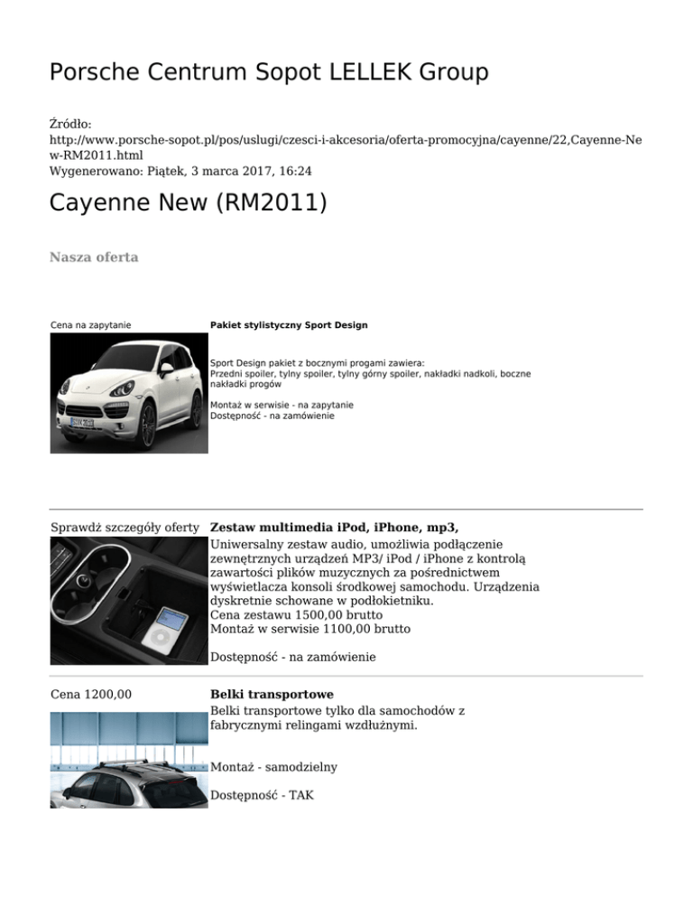 Porsche Centrum Sopot LELLEK Group Źródło: http://www.porsche-sopot.pl/pos/uslugi/czesci-i-akcesoria/oferta-promocyjna/cayenne/22,Cayenne-Ne w-RM2011.html Wygenerowano: Piątek, 3 marca 2017, 16:24 Cayenne New (RM2011) Nasza oferta Cena na zapytanie Pakiet stylistyczny Sport Design Sport Design pakiet z bocznymi progami zawiera: Przedni spoiler, tylny spoiler, tylny górny spoiler, nakładki nadkoli, boczne nakładki progów Montaż w serwisie - na zapytanie Dostępność - na zamówienie Sprawdż szczegóły oferty Zestaw multimedia iPod, iPhone, mp3, Uniwersalny zestaw audio, umożliwia podłączenie zewnętrznych urządzeń MP3/ iPod / iPhone z kontrolą zawartości plików muzycznych za pośrednictwem wyświetlacza konsoli środkowej samochodu. Urządzenia dyskretnie schowane w podłokietniku. Cena zestawu 1500,00 brutto Montaż w serwisie 1100,00 brutto Dostępność - na zamówienie Cena 1200,00 Belki transportowe Belki transportowe tylko dla samochodów z fabrycznymi relingami wzdłużnymi. Montaż - samodzielny Dostępność - TAK Sprawdż szczegóły oferty Hak holowniczy Hak holowniczy odpinany manualnie lub otwierany elektrycznie Montaż - Serwis Porsche, Gwarancja Dostępność - na zamówienie RABAT -5% hak manualny Sprawdż szczegóły oferty Sportowy wydech Kompletny system sportowego wydechu Montaż - Serwis Porsche, Gwarancja Dostępność - na zamówienie Sprawdż szczegóły oferty Uchwyt rowerowy Uchwyt rowerowy na hak holowniczy Dostępność - na zamówienie Cena 771,00 kpl Kołpaki felg Nowa cena 710,00 kpl Kołpaki dostępne do wszystkich rodzajów oryginalnych felg Porsche W kolorach Silver, Titanium, Black Montaż - samodzielny Dostępność - TAK Cena 370,00 Siatka bagażnika Praktyczna siatka do zabezpieczenia mniejszego bagażu Dostępność - TAK Wysyłka pod wskazany adres 0,00 zł na terenie RP Cena 770,00 Dywany welurowe Dywany welurowe w kolorze wnętrza sygnowane napisem „PORSCHE” kpl. przód + tył Montaż - samodzielny Wysyłka pod wskazany adres 0,00 zł na terenie RP Sprawdż szczegóły oferty Osłony przeciwsłoneczne Osłony przeciwsłoneczne tylnych bocznych okien, tylna szyba. Chronią wnętrze przed ciepłem, możliwość otwierania okien przy zamontowanej osłonie. Montaż - samodzielny Dostępność - TAK Wysyłka pod wskazany adres 0,00 zł na terenie RP Załączniki do strony Kołpaki 72.89 KB Zestaw głośnomówiący Bluetooth 90.96 KB Osłony przeciwsłoneczne 86.43 KB Uchwyt rowerowy 80.87 KB Dywany welurowe 67.6 KB Sportowy wydech 61.54 KB Siatka bagażnika 74.41 KB Tweetnij