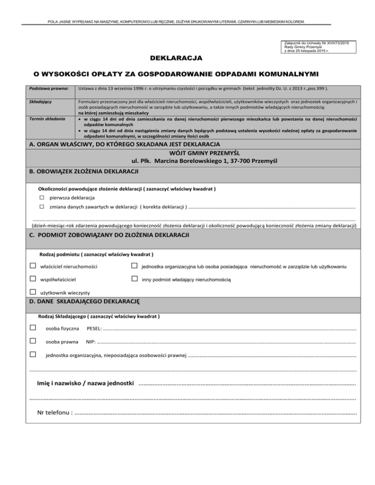POLA JASNE WYPEŁNIAĆ NA MASZYNIE, KOMPUTEROWO LUB RĘCZNIE, DUŻYMI DRUKOWANYMI LITERAMI, CZARNYM LUB NIEBIESKIM KOLOREM. Załącznik do Uchwały Nr XVII/73/2015 Rady Gminy Przemyśl z dnia 25 listopada 2015 r. DEKLARACJA O WYSOKOŚCI OPŁATY ZA GOSPODAROWANIE ODPADAMI KOMUNALNYMI Podstawa prawna: Ustawa z dnia 13 września 1996 r. o utrzymaniu czystości i porządku w gminach (tekst jednolity Dz. U. z 2013 r.,poz.399 ). Składający Formularz przeznaczony jest dla właścicieli nieruchomości, współwłaścicieli, użytkowników wieczystych oraz jednostek organizacyjnych i osób posiadających nieruchomość w zarządzie lub użytkowaniu, a także innych podmiotów władających nieruchomością: na której zamieszkują mieszkańcy w ciągu 14 dni od dnia zamieszkania na danej nieruchomości pierwszego mieszkańca lub powstania na danej nieruchomości odpadów komunalnych w ciągu 14 dni od dnia nastąpienia zmiany danych będących podstawą ustalenia wysokości należnej opłaty za gospodarowanie odpadami komunalnymi, w szczególności zmiany ilości osób Termin składania A. ORGAN WŁAŚCIWY, DO KTÓREGO SKŁADANA JEST DEKLARACJA WÓJT GMINY PRZEMYŚL ul. Płk. Marcina Borelowskiego 1, 37-700 Przemyśl B. OBOWIĄZEK ZŁOŻENIA DEKLARACJI Okoliczności powodujące złożenie deklaracji ( zaznaczyć właściwy kwadrat ) □ □ pierwsza deklaracja zmiana danych zawartych w deklaracji ( korekta deklaracji ) ……………………………………………………………………………………………………………….. .................................................................................................................................................................................................................................. (dzień-miesiąc-rok zdarzenia powodującego konieczność złożenia deklaracji i okoliczność powodującą konieczność złożenia zmiany deklaracji) C. PODMIOT ZOBOWIĄZANY DO ZŁOŻENIA DEKLARACJI Rodzaj podmiotu ( zaznaczyć właściwy kwadrat ) □ właściciel nieruchomości □ współwłaściciel □ użytkownik wieczysty □ jednostka organizacyjna lub osoba posiadająca nieruchomość w zarządzie lub użytkowaniu □ inny podmiot władający nieruchomością D. DANE SKŁADAJĄCEGO DEKLARACJĘ Rodzaj Składającego ( zaznaczyć właściwy kwadrat ) □ □ □ osoba fizyczna PESEL: ……..…………………………………………………………………………………………………………………………………………………..………………. osoba prawna NIP: ……………………………………………………………………………………………………………………………………………………………..……….……... jednostka organizacyjna, nieposiadająca osobowości prawnej ………………………………………………………………………….…………………………………….. …………………………………………………………………………….………………………………………………………………………………………………………………………………………………. Imię i nazwisko / nazwa jednostki ………………………………………………………………………………..……………………………….……. ……………………………………………………………………………………………………………………………………………………………………………………. Nr telefonu : …………………………………………………………………………………………………………..………………………………………………. POLA JASNE WYPEŁNIAĆ NA MASZYNIE, KOMPUTEROWO LUB RĘCZNIE, DUŻYMI DRUKOWANYMI LITERAMI, CZARNYM LUB NIEBIESKIM KOLOREM. Adres zamieszkania lub siedziby : Województwo Powiat Gmina Miejscowość Ulica Nr domu Nr lokalu Kod pocztowy Poczta E. ADRES NIERUCHOMOŚCI, NA KTÓREJ POWSTAJĄ ODPADY KOMUNALNE ( wypełnić jeśli jest inny niż adres w części D ) Województwo Powiat Gmina Miejscowość Ulica Nr domu Nr lokalu Kod pocztowy Poczta EWIDENCYJNY NUMER DZIAŁKI : F. ZDEKLAROWANIE SYSTEMU GOSPODAROWANIA ODPADAMI NA TERENIE NIERUCHOMOŚCI □ □ Odpady komunalne będą segregowane Odpady komunalne nie będą segregowane G. OPŁATA ZA GOSPODAROWANIE ODPADAMI KOMUNALNYMI Oświadczam, że na terenie nieruchomości wykazanej w części E niniejszej deklaracji zamieszkuje WYSOKOŚĆ OPŁATY MIESIĘCZNEJ - : ……………………….. X ………………………… = ( ilość osób x stawka ) ………………………………………. osób ……………………………………………. (opłata miesięczna) H. OŚWIADCZENIE I PODPIS OSOBY SKŁADAJĄCEJ DEKLARACJĘ/ OSOBY REPREZENTUJĄCEJ SKŁADAJĄCEGO DEKLARACJĘ ……………………………………………... ……………………………………………………………………….. ( miejscowość i data ) ( czytelny podpis ) I.ADNOTACJE ORGANU Pouczenie : W przypadku niezapłacenia w ustalonych terminach kwoty należnej opłaty za gospodarowanie odpadami komunalnymi lub wpłacenia jej w niepełnej wysokości, niniejsza deklaracja stanowi podstawę do wystawienia tytułu wykonawczego, zgodnie z przepisami ustawy z dnia 17 czerwca 1966r. o postępowaniu egzekucyjnym w administracji ( Dz.U. z 2014 r., poz. 1619 z późn. zm. ).