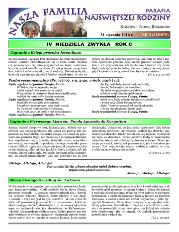 31 stycznia 2016 r. IV NIEDZIELA ZWYKŁA NR 3 (325/875) ROK C Czytanie z Księgi proroka Jeremiasza Za panowania Jozjasza Pan skierował do mnie następujące słowo: «Zanim ukształtowałem cię w łonie matki, znałem cię, poświęciłem cię, nim przyszedłeś na świat, ustanowiłem cię prorokiem dla narodów. Ty zaś przepasz swoje biodra, wstań i mów wszystko, co ci rozkażę. Nie lękaj się ich, bym cię czasem nie napełnił lękiem przed nimi. A oto Ja czynię cię dzisiaj twierdzą warowną, kolumną ze stali i murem spiżowym przeciw całej ziemi, przeciw królom judzkim i ich przywódcom, ich kapłanom i ludowi tej ziemi. Będą walczyć przeciw tobie, ale nie zdołają cię zwyciężyć, gdyż Ja jestem z tobą, mówi Pan, by cię ochraniać». (Jr 1, 4-5. 17-19). Psalm responsoryjny (Ps. 71(70), 1-2. 3-4a. 5-6ab. 15ab i 17). Będę wysławiał pomoc Twoją, Panie. W Tobie, Panie, ucieczka moja, niech wstydu nie zaznam na wieki. Wyzwól mnie i ratuj w Twej sprawiedliwości, nakłoń ku mnie ucho i ześlij ocalenie. Będę wysławiał pomoc Twoją, Panie. Bądź dla mnie skałą schronienia i zamkiem warownym, aby mnie ocalić, bo Ty jesteś moją opoką i twierdzą. Boże mój, wyrwij mnie z rąk niegodziwca. Będę wysławiał pomoc Twoją, Panie. Bo Ty, mój Boże, jesteś moją nadzieją, Panie, Tobie ufam od młodości. Ty byłeś moją podporą od dnia narodzin, od łona matki moim opiekunem. Będę wysławiał pomoc Twoją, Panie. Moje usta będą głosiły Twoją sprawiedliwość i przez cały dzień Twoją pomoc. Boże, Ty mnie uczyłeś od mojej młodości i do tej chwili głoszę Twoje cuda. Będę wysławiał pomoc Twoją, Panie. Czytanie z Pierwszego Listu św. Pawła Apostoła do Koryntian Bracia: Miłość cierpliwa jest, łaskawa jest. Miłość nie zazdrości, nie szuka poklasku, nie unosi się pychą; nie dopuszcza się bezwstydu, nie szuka swego, nie unosi się gniewem, nie pamięta złego, nie cieszy się z niesprawiedliwości, lecz współweseli się z prawdą. Wszystko znosi, wszystkiemu wierzy, we wszystkim pokłada nadzieję, wszystko przetrzyma. Miłość nigdy nie ustaje, nie jest jak proroctwa, które się skończą, albo jak dar języków, który zniknie, lub jak wiedza, której zabraknie. Po części bowiem tylko poznajemy, po części prorokujemy. Gdy zaś przyjdzie to, co jest doskonałe, zniknie to, co jest tylko częściowe. Gdy byłem dzieckiem, mówiłem jak dziecko, czułem jak dziecko, myślałem jak dziecko. Kiedy zaś stałem się mężem, wyzbyłem się tego, co dziecięce. Teraz widzimy jakby w zwierciadle, niejasno; wtedy zaś zobaczymy twarzą w twarz. Teraz poznaję po części, wtedy zaś poznam tak, jak i zostałem poznany. Tak więc trwają wiara, nadzieja, miłość, te trzy: z nich zaś największa jest miłość. (1 Kor 13, 4-13). Alleluja, Alleluja, Alleluja! Pan posłał Mnie, abym ubogim niósł dobrą nowinę, więźniom głosił wolność. Alleluja, Alleluja, Alleluja! Słowa Ewangelii według św. Łukasza W Nazarecie w synagodze, po czytaniu z proroctwa Izajasza, Jezus powiedział: «Dziś spełniły się te słowa Pisma, któreście słyszeli». A wszyscy przyświadczali Mu i dziwili się pełnym wdzięku słowom, które płynęły z ust Jego. I mówili: «Czyż nie jest to syn Józefa?». Wtedy rzekł do nich: «Z pewnością powiecie Mi to przysłowie: „Lekarzu, ulecz samego siebie”; dokonajże i tu w swojej ojczyźnie tego, co wydarzyło się, jak słyszeliśmy, w Kafarnaum». I dodał: «Zaprawdę powiadam wam: Żaden prorok nie jest mile widziany w swojej ojczyźnie. Naprawdę mówię wam: Wiele wdów było w Izraelu za czasów Eliasza, kiedy niebo pozostawało zamknięte przez trzy lata i sześć miesięcy, tak że wielki głód panował w całym kraju; a Eliasz do żadnej z nich nie został posłany, tylko do owej wdowy w Sarepcie Sydońskiej. I wielu trędowatych było w Izraelu za proroka Elizeusza, a żaden z nich nie został oczyszczony, tylko Syryjczyk Naaman». Na te słowa wszyscy w synagodze unieśli się gniewem. Porwali się z miejsca, wyrzucili Go z miasta i wyprowadzili aż na stok góry, na której ich miasto było zbudowane, aby Go strącić. On jednak przeszedłszy pośród nich oddalił się. (Łk 4, 21-30). 2 NASZA FAMILIA, 31 stycznia 2016 r., Nr 3 NIECH MIŁOŚĆ ZAMIESZKA W TOBIE W niedzielne popołudnie, 10 stycznia, Parafialny Oddział Akcji Katolickiej działający przy naszym Sanktuarium zorganizował dla swoich członków i ich rodzin kolędowo – noworoczne spotkanie. Na spotkaniu był także obecny ks. Proboszcz Mirosław Dziedzic - Asystent Akcji Katolickiej Archidiecezji Krakowskiej. Sala w Domu Parafialnym rozbrzmiewała pięknym śpiewem kolęd zarówno w wykonaniu dzieci, jak i dorosłych uczestników wspólnej noworocznej biesiady. Panie przygotowały specjalnie na tę okazję „kulinarne pyszności” - m.in. wyANIOŁ MIŁOŚCI Jestem Aniołem Miłości, Chcę być blisko serca Twojego I dać Ci odczuć wielką miłość Pana mojego. Przyszedł na świat Jezus ukochany, Ale nie wszędzie jest znany! Przyszedł, by dać się dla człowieka, Lecz co Jezusa w ludzkim sercu czeka? Czy miłość Jego spotka Twoje odwzajemnienie, Czy może obojętność i odrzucenie? Jezus czeka na Ciebie, na Twą miłość do Niego, Wyjdź Mu na spotkanie i przywitaj Jego. Przyjmij z radością Jezusa małego, A poznasz Miłość Boga Najwyższego. HANDLARKA Nie mam czasu dla Jezusa, mam pracy wiele, Nawet w niedzielę handluję, Więc nie bywam w kościele. Najcenniejszy pieniądz i go potrzebuję, Bo bez pieniędzy, życie sobie zmarnuję. Tak myślałam do niedawna, Bo to szczęścia nie dawało. Czegoś potrzebowałam, Czegoś mi wciąż brakowało. Miałam pustkę w sercu, zero radości, Aż w końcu zrozumiałam, że brak mi miłości. Gdy sprzedaż spadała, czasu miałam wiele, Odnalazłam miłość przed ołtarzem w kościele. Poczułam to czego mi brakowało, Już nie pieniędzy