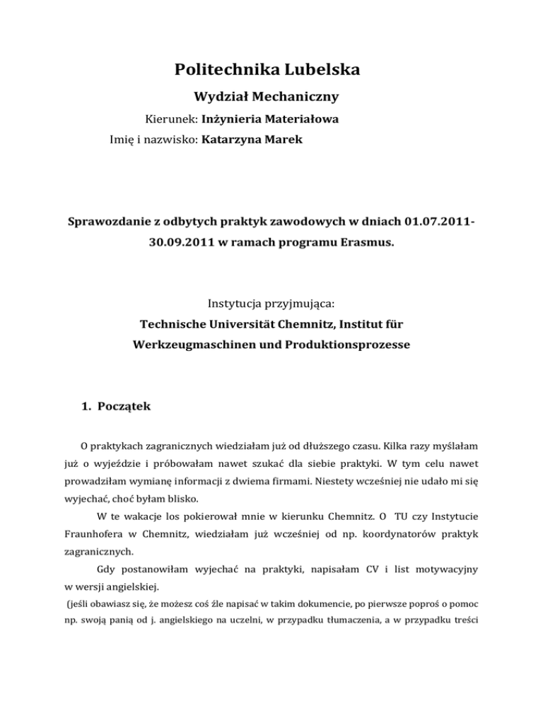 Politechnika Lubelska Wydział Mechaniczny Kierunek: Inżynieria Materiałowa Imię i nazwisko: Katarzyna Marek Sprawozdanie z odbytych praktyk zawodowych w dniach 01.07.201130.09.2011 w ramach programu Erasmus. Instytucja przyjmująca: Technische Universität Chemnitz, Institut für Werkzeugmaschinen und Produktionsprozesse 1. Początek O praktykach zagranicznych wiedziałam już od dłuższego czasu. Kilka razy myślałam już o wyjeździe i próbowałam nawet szukać dla siebie praktyki. W tym celu nawet prowadziłam wymianę informacji z dwiema firmami. Niestety wcześniej nie udało mi się wyjechać, choć byłam blisko. W te wakacje los pokierował mnie w kierunku Chemnitz. O TU czy Instytucie Fraunhofera w Chemnitz, wiedziałam już wcześniej od np. koordynatorów praktyk zagranicznych. Gdy postanowiłam wyjechać na praktyki, napisałam CV i list motywacyjny w wersji angielskiej. (jeśli obawiasz się, że możesz coś źle napisać w takim dokumencie, po pierwsze poproś o pomoc np. swoją panią od j. angielskiego na uczelni, w przypadku tłumaczenia, a w przypadku treści samego CV wskazówek udzielą dziewczyny z Biura Promocji i Karier Politechniki Lubelskiej, podpowiedzą co poprawić) Swoje dokumenty przekazałam Pani Joannie Sokołowskiej, która wysłała je do Chemnitz. Potem czekałam już tylko na odpowiedź. Miałam szczęście. Potrzebowali tu osoby, która zna język niemiecki i potrafi posługiwać się programami graficznymi. Pierwszy dzień w Chemnitz. Michael Muller, z którym się kontaktowaliśmy wcześniej mailowo, oprowadził nas po kampusie uniwersytetu, przedstawił naszych koordynatorów, pokazał miejsca pracy przedstawił osoby, które mogą nam udzielać pomocy, gdybyśmy jej potrzebowali. Jedna bardzo ważna rzecz jeśli wyjeżdżasz do Chemnitz. To fajne i miłe miasto, jednak jest tu niewiele atrakcji i miejsc, które można zwiedzać. A poza tym miasto ma bardzo dużą powierzchnię i wszędzie jest „kawałek drogi do przejścia”. Warto w tym wypadku zaopatrzyć się w „SEMESTERTICKET-ERSATZAUSWEIS”. Bilet ten upoważnia do przejazdu komunikacją miejską w Chemnitz, a także pociągami z serii „regionalne przewozy kolejowe” (oczywiście niemieckie: DB, SB, VMS; tak oznaczonymi pociągami można jeździć) po całej Saksonii. Trzeba się udać do biura: Studentenrat Technische Universitat Chemnitz, Thuringer Weg 11, Zimmer 006, D-09126 Chemnitz, (dla pocieszenia, niedaleko akademików). Polecam odwiedzić Drezno, Lipsk i pobliskie góry. Wspomnę tylko, że my o tej możliwości dowiedzieliśmy się dopiero tu na miejscu pod koniec lipca od praktykantów z IAESTE, więc cały miesiąc spędziliśmy w Chemnitz. Staraliśmy sobie ten czas jakoś wypełniać uprawiając różne sporty. Pod tym względem miasteczko akademickie TU jest dobrze wyposażone ☺. Miasto jak każde studenckie posiada kilka klubów do których warto wybrać się w weekend, jedyną wadą tych miejsc jest cena. Wstęp do klubu to kwestia około 5 euro, rzeczą nie do przyjęcia jest też kwestia dziewczyn gdyż jak każdy wie Niemki nie są zbyt urodne zdążyliśmy to zauważyć i musieliśmy z tym żyć przez 3 miesiące więc czekaliśmy na powrót do Polski z utęsknieniem. Sprawy organizacyjne w akademiku: Pokoje są jednoosobowe. Około 30 pokoi na jednym piętrze, jedna kuchnia wyposażona w kilka płyt grzewczych (w zasadzie wystarczająco), no i oczywiście łazienka (my mieliśmy do dyspozycji koedukacyjną łazienkę, ale był jeden prysznic oddzielni umieszczony na końcu korytarza, zamykany; teraz ten akademik jest remontowany i pod tym względem nastąpi zmiana. W każdym akademiku jest osoba zwana Hausspeaker. To ktoś w rodzaju rady mieszkańców, jeśli masz problemy z pokojem czy z czymkolwiek innym co dotyczy mieszkania w akademiku to możesz do niego iść i uzyskasz pomoc w wyjaśnieniu sprawy. Wszystko co dotyczy dokumentów na miejscu, które musicie wypełnić, by zamieszkać w akademiku, zapewne opowie Wam dokładnie koordynator. Przynajmniej my dostaliśmy taką pomoc. Ważną sprawą jest posiadanie własnej pościeli. Warto zabrać ze sobą czajnik elektryczny oraz jakieś naczynia do gotowania (garnek, patelnia itp.) W pobliżu miasteczka akademickiego znajdują się markety Edeka, Penny (typu naszej polskiej Stokrotki czy Biedronki), do każdego z nich jest 5 min drogi. 2. Praktyka. Pierwszy dzień praktyki był spokojny, choć dla mnie nerwowy. Byłam zła na siebie, że nie do końca rozumiem czego ode mnie oczekują pracownicy posługujący się językiem niemieckim(co prawda kiedyś znałam język niemiecki dość dobrze, ale po 5 latach przerwy w używaniu tej mowy, czułam się jakby cała wiedza wyparowała z mojej głowy). Na moje szczęście mówili oni również po angielsku, więc dawaliśmy radę. Moja praca polegała na wykonywaniu ilustracji, obrazków, diagramów, wykresów itp. w programach typu Corell i Photoshop do nowej książki „Werkzeugmaschinen”, nad która pracował Institut Werkzeugmaschinen und Produktionsprozesse. Tematyka tej książki jest związana z moim kierunkiem studiów, więc poznałam trochę technicznego słownictwa, samo zaś wykonywanie, czyli styczność z programami graficznymi związana jest z moim hobby, dlatego czerpałam przyjemność z tego co robiłam. Często moja praca polegała na nadawaniu nowego wizerunku ilustracjom, czy diagramom już istniejącym, jednak miałam tez okazję wykazać się kreatywnością. Pracowałam mniej więcej w wymiarze ośmiogodzinnym, jak inni pracownicy (8:00 do 16:30 zazwyczaj), przy czym zawsze była przerwa na obiad. 3. Ceny. Chemnitz nie jest drogim miastem. Pod względem żywności i środków pierwszej potrzeby ceny są porównywalne do tych w Lublinie, czasami tańsze w zależności od produktów. Jeśli chodzi o inne artykuły to każdy musi indywidualnie sam ocenić. Warto wspomnieć, że w centrum jest dość duże centrum handlowe, które w
