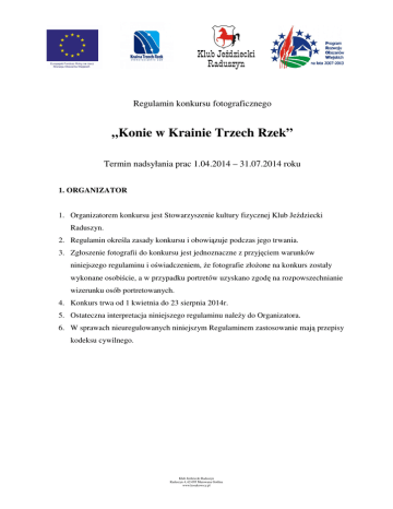 Regulamin konkursu fotograficznego „Konie w Krainie Trzech Rzek” Termin nadsyłania prac 1.04.2014 – 31.07.2014 roku 1. ORGANIZATOR 1. Organizatorem konkursu jest Stowarzyszenie kultury fizycznej Klub Jeździecki Raduszyn. 2. Regulamin określa zasady konkursu i obowiązuje podczas jego trwania. 3. Zgłoszenie fotografii do konkursu jest jednoznaczne z przyjęciem warunków niniejszego regulaminu i oświadczeniem, że fotografie złożone na konkurs zostały wykonane osobiście, a w przypadku portretów uzyskano zgodę na rozpowszechnianie wizerunku osób portretowanych. 4. Konkurs trwa od 1 kwietnia do 23 sierpnia 2014r. 5. Ostateczna interpretacja niniejszego regulaminu należy do Organizatora. 6. W sprawach nieuregulowanych niniejszym Regulaminem zastosowanie mają przepisy kodeksu cywilnego. Klub Jeździecki Raduszyn Raduszyn 4, 62-095 Murowana Goślina www.kosakowscy.pl 2. WARUNKI UDZIAŁU W KONKURSIE 1. Konkurs ma formułę otwartą i mogą w nim wziąć udział wszyscy chętni. 2. Każdy Uczestnik może zgłosić maksymalnie 3 fotografie. 3. Fotografie biorące udział w konkursie powinny być związane z szeroko rozumianą tematyką konną oraz powinny być zrobione na terenie gmin Murowana Goślina, Oborniki lub Ryczywół. 3. Fotografie mogą być zarówno kolorowe jak i czarno białe, mogą być wykonane zarówno w poziomie jak i w pionie. 4. Fotografie nie mogą być poddawane dużym zmianom, za pomocą oprogramowania komputerowego (dopuszczalne są zmiany kontrastu, jaskrawości itp.) 5. Fotografie należy dostarczyć w postaci elektronicznej na płycie CD (rozdzielczość pomiędzy 250 a 300 dpi). 6. Zdjęcia w formacie papierowym nie wezmą udziału w konkursie. 7. Na kopercie płyty zawierającej zdjęcia w formacie elektronicznym należy zamieścić opis zawierający: tytuł konkursu, tytuł zdjęcia, imię, nazwisko, adres, telefon i/lub email autora zdjęć. 8. Na płycie powinien znajdować się również plik z przybliżonym opisem miejsca, w którym zrobiono zdjęcie. 9. Jest to konkurs dwuetapowy. Do finału zakwalifikuje się 10 osób, czyli 30 prac. 10. Organizator konkursu informuje uczestników, iż ich dane osobowe będą przechowywane i przetwarzane przez Stowarzyszenie kultury fizycznej Klub Jeździecki Raduszyn, wyłącznie w związku z wykonaniem postanowień niniejszego regulaminu i w zakresie działalności statutowej stowarzyszenia. Każdy z uczestników ma prawo do wglądu do swoich danych oraz ich poprawiania. 11. Fotografie należy składać bezpośrednio w biurze Gospodarstwa Agroturystycznego U. K. Kosakowscy lub przesyłać na adres: Klub Jeździecki Raduszyn Raduszyn 4, 62-095 Murowana Goślina www.kosakowscy.pl Klub Jeździecki Raduszyn ul. Raduszyn 4 62-095 Murowana Goślina z dopiskiem: Konkurs fotograficzny „Konie w Krainie Trzech Rzek” Razem z pracami konkursowymi należy złożyć kartę zgłoszenia stanowiącą załącznik nr 1 do regulaminu. 3. HARMONOGRAM KONKURSU 1. Termin zgłaszania prac: od 1.04.2013 r. do 31.07.2014 r. Za datę zgłoszenia uważa się datę wpływu prac konkursowych do siedziby Klubu. 2. Ocena kwalifikacyjna zdjęć odbędzie się w ciągu 7 dni od wpłynięcia ostatniego zgłoszenia. 3. Ocena prac konkursowych i ogłoszenie wyniku nastąpi w dniu realizacji imprezy „Dzień z Koniem” 23.08.2014 r. 4. Wręczenie nagród odbędzie się po ogłoszeniu wyników konkursu po zakończeniu wyżej wymienionej imprezy. Klub Jeździecki Raduszyn Raduszyn 4, 62-095 Murowana Goślina www.kosakowscy.pl 4. OCENA PRAC 1. W przypadku gdy do konkursu zgłoszonych będzie więcej niż 10 osób, zorganizowana będzie ocena kwalifikacyjna do finału konkursu. 2. Ocena kwalifikacyjna przeprowadzona zostanie przez 5-osobową komisję konkursową. 3. Do finału konkursu zakwalifikuje się 10 Uczestników, których prace uzyskają najlepszy wynik w trakcie oceny kwalifikacyjnej. 4. Wyniki oceny kwalifikacyjnej zostaną zamieszczone na stronie internetowej www.kosakowscy.pl. 5. Finał konkursu odbędzie się podczas imprezy plenerowej Dzień z Koniem. Uczestnicy imprezy będą mogli głosować na poszczególne zdjęcia za pośrednictwem karteczek do głosowania. 6. Podliczenie głosów oddanych na prace odbędzie po ostatnim konkursie w zawodach jeździeckich i zostanie dokonane przez 3-osobową komisję konkursową 7. Decyzje komisji konkursowej są ostateczne i wiążące dla Uczestników. 5. NAGRODY 1. Laureaci otrzymają nagrody rzeczowe o wartości: a. 200,00 zł za zajęcie I miejsca b. 125,00 zł za zajęcie II miejsca c. 75,00 zł za zajęcie III miejsca d. książka o fotografii dla laureatów IV i V miejsca Klub Jeździecki Raduszyn Raduszyn 4, 62-095 Murowana Goślina www.kosakowscy.pl 6. WYKORZYSTANIE PRAC NADESŁANYCH NA KONKURS 1. Fotografie zgłoszone do konkursu nie będą zwracane i pozostaną w zbiorach Stowarzyszenia kultury fizycznej Klub Jeździecki Raduszyn. 2. Organizator nie ponosi odpowiedzialności za ewentualne szkody spowodowane opublikowaniem nieprawdziwych danych osobowych bądź innych nieprawdziwych informacji opartych na zgłoszeniach sporządzonych przez Uczestników. 3. Zgłaszając prace do konkursu autor wyraża tym samym zgodę na nieodpłatne wykorzystywanie fotografii przez Stowarzyszenie kultury fizycznej Klub Jeździecki Raduszyn. Klub Jeździecki Raduszyn Raduszyn 4, 62-095 Murowana Goślina www.kosakowscy.pl Karta zgłoszenia udziału w konkursie fotograficznym „Konie w Krainie Trzech Rzek” Imię i nazwisko: ........................................................................... ........................................................................... Adres zamieszkania: ........................................................................... ........................................................................... Nr tel.: ………............................................................... Adres e-mail: .............................................................
