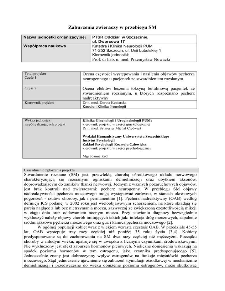Zaburzenia zwieraczy w przebiegu SM Nazwa jednostki organizacyjnej Współpraca naukowa PTSR Oddział w Szczecinie, ul. Dworcowa 17 Katedra i Klinika Neurologii PUM 71-252 Szczecin, ul. Unii Lubelskiej 1 Kierownik jednostki: Prof. dr hab. n. med. Przemysław Nowacki Tytuł projektu Część 1 Ocena częstości występowania i nasilenia objawów pęcherza neurogennego u pacjentek ze stwardnieniem rozsianym. Część 2 Ocena efektów leczenia toksyną botulinową pacjentek ze stwardnieniem rozsianym, u których rozpoznano pęcherz nadreaktywny Kierownik projektu Dr n. med. Dorota Koziarska Katedra i Klinika Neurologii Wykaz jednostek współrealizujących projekt Klinika Ginekologii i Uroginekologii PUM: kierownik projektu w części ginekologicznej Dr n. med. Sylwester Michał Ciećwież Wydział Humanistyczny Uniwersytetu Szczecińskiego Instytut Psychologii Zakład Psychologii Rozwoju Człowieka: kierownik projektu w części psychologicznej Mgr Joanna Król Uzasadnienie zgłoszenia projektu Stwardnienie rozsiane (SM) jest przewlekłą chorobą ośrodkowego układu nerwowego charakteryzującą się rozsianymi ogniskami demielinizacji oraz ubytkiem aksonów, doprowadzającym do zaników tkanki nerwowej. Jednym z ważnych pozaruchowych objawów, jest brak kontroli nad zwieraczami: pęcherz neurogenny. W przebiegu SM objawy nadreaktywności pęcherza moczowego mogą występować zarówno, w stanach okresowych pogorszeń - rzutów choroby, jak i permanentnie [1]. Pęcherz nadreaktywny (OAB) według definicji ICS podanej w 2002 roku jest wieloobjawowym schorzeniem, na które składają się parcia naglące z lub bez nietrzymania moczu, zazwyczaj ze zwiększoną częstotliwością mikcji w ciągu dnia oraz oddawaniem nocnym moczu. Przy stawianiu diagnozy bezwzględnie wykluczyć należy objawy chorób imitujących takich jak: infekcja dróg moczowych, zapalenie śródmiąższowe pęcherza moczowego oraz guz i kamica pęcherza moczowego [2]. W ogólnej populacji kobiet wraz z wiekiem wzrasta częstość OAB. W przedziale 45-55 lat, OAB występuje trzy razy częściej niż poniżej 35 roku życia [3,4]. Kobiety predysponowane są do zachorowania na SM dwa razy częściej niż mężczyźni. Początku choroby w młodym wieku, upatruje się w związku z licznymi czynnikami środowiskowymi. Nie wykluczony jest efekt zaburzeń hormonów płciowych. Nieliczne doniesienia wskazują na spadek poziomu hormonów w tym estrogenu, jako czynnika predysponującego [5]. Jednocześnie znany jest dobroczynny wpływ estrogenów na funkcje mięśniówki pęcherza moczowego. Stąd jednoczesne ujawnienie się zaburzeń stymulacji ośrodkowej w mechanizmie demielinizacji i przedwczesne do wieku obniżenie poziomu estrogenów, może skutkować objawami pęcherza neurogennego. Zjawiska te wymagają gruntownej oceny zarówno klinicznej jak i laboratoryjnej. Niewątpliwym skutkiem nieprawidłowej kontroli pęcherza moczowego jest pogorszenie jakości życia, kondycji psychofizycznej oraz problemy ze snem. Objawy pęcherza nadreaktywnego wpływają zarówno na jakość życia osobistego jak i społecznego [6]. Z wywiadu od pacjentek z pęcherzem neurogennym w przebiegu SM, bardzo często dowiedzieć można się, że ograniczają swoją aktywność zawodową i społeczną. Brak jest jednak kompleksowej oceny psychologicznej, jak szczególne cechy osobowości mogą modelować to zjawisko. W dużym badaniu Sako i wsp. oceniono wpływ pęcherza nadreaktywnego wśród populacji japońskich kobiet na aktywność seksualną. Okazało się, że objawy OAB istotnie przyczyniają się do obniżenia aktywności seksualnej kobiet [6]. Brak jest podobnych doniesień w populacji polskiej w grupie chorych na SM. Leczenie objawów pęcherza nadreaktywnego jest trudne i większość przypadków niedostateczne. Postępowanie polega głównie na leczeniu farmakologicznym, stosowaniu szeregu leków blokujących receptory cholinergiczne muskarynowe. Gdy leczenie to zawiedzie lub istnieją do niego przeciwwskazania, głównie takie jak: jaskra z wąskim katem przesączania, niewydolność nerek czy wątroby należy rozważyć inną metodę. Możemy wówczas zastosować neurotoksynę poprzez ostrzyknięcie pęcherza moczowego [8,9] Mechanizm działania toksyny botulinowej A polega na zahamowaniu uwalniania acetylocholiny oraz innych neurotransmiterów. Powoduje ona zmniejszenie napięcia zwieracza cewki moczowej przez co u pacjentów z dyssynergią wypieracz-zwieracz pomaga w opróżnieniu pęcherza moczowego. Reitz i wsp. w swoim badaniu 200 pacjentek w kontroli po 3 i 6 miesiącach donoszą skuteczności działania toksyny botulinowej typu A, poprzez wzrost pojemności cystometrycznej pęcherza moczowego i obniżenie ciśnienia śródpęcherzowego. Także inne badania potwierdzają skuteczność działania toksyny botulinowej [10,11]. Kuschel i wsp. stwierdzili po 2 letniej kontroli od wstrzyknięcia toksyny botulinowej znamienną poprawę [11]. W polskim badaniu Rechberger i wsp. w okresie 3 miesięcy po zastosowaniu toksyny botulinowej typu A stwierdzili istotną poprawę jakości życia u pacjentek z OAB, które nie reagowały na tradycyjne leczenie [12]. Planowany projekt byłby znaczącym wkładem w systemowe opracowanie zagadnień pęcherza neurogennego u kobiet z SM oraz prospektywną oceną skuteczności nowej metody leczenia objawowego. Piśmiennictwo: 1. Betts CD.et al. Urinary symptoms and the neurological features of bladder dysfunction in multiple sclerosis. J Neurol Neurosurg Psychiatry. 1993; 56: 245-250. 2. Abrams P., Cardozo L., Fall M., Griffiths D., Rosier P., Ulmsten U., et al.: Standardisation Sub-committee of the International Continence Society. The standardisation of terminology of lower urinary tract function: report from the Standardisation Sub-committee of the international Continence Society. Nerourol Urodyn. 2002; 21:167-178. 3. Jolleys J.V.: The reported prevalence of urinary symptoms in one rural general practi