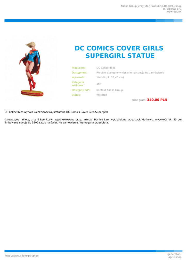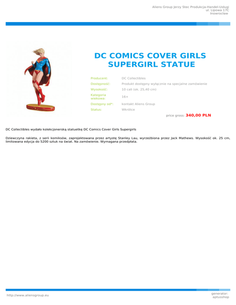 Aliens Group Jerzy Stec Produkcja-Handel-Usługi ul. Lipowa 17C Inowrocław DC COMICS COVER GIRLS SUPERGIRL STATUE Producent: DC Collectibles Dostępność: Produkt dostępny wyłącznie na specjalne zamówienie Wysokość: 10 cali (ok. 25,40 cm) Kategoria wiekowa: 16+ Dostępny od*: kontakt Aliens Group Status: Wkrótce price gross: 340,00 PLN DC Collectibles wydało kolekcjonerską statuetkę DC Comics Cover Girls Supergirls Dziewczyna rakieta, z serii komiksów, zaprojektowana przez artystę Stanley Lau, wyrzeżbiona przez Jack Mathews. Wysokość ok. 25 cm, limitowana edycja do 5200 sztuk na świat. Na zamówienie. Wymagana przedpłata. http://www.aliensgroup.eu generator: aptusshop