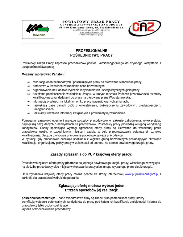 POWIATOWY URZĄD PRACY CENTRUM AKTYWIZACJI ZAWODOWEJ 58-400 K ami e nna G ór a, ul. Sie nki ew icz a 6 a tel. (075) 64-50-160, fax. (075) 64-50-170 www.pupkamiennagora.pl e-mail: [email protected] PROFESJONALNE POŚREDNICTWO PRACY Powiatowy Urząd Pracy zaprasza pracodawców powiatu kamiennogórskiego do czynnego korzystania z usług pośrednictwa pracy. Możemy zaoferować Państwu: • • • • • • • rekrutację osób bezrobotnych i poszukujących pracy na oferowane stanowiska pracy, doradztwo w kwestiach zatrudnienia osób bezrobotnych, organizowanie na Państwa życzenie indywidualnych i specjalistycznych giełd pracy, bezpłatne pomieszczenia w siedzibie Urzędu, w których możecie Państwo przeprowadzić rozmowy kwalifikacyjne z kandydatami do pracy na oferowane przez Was stanowiska, informację o sytuacji na lokalnym rynku pracy i przewidywanych zmianach, największą bazę danych osób o wykształceniu, doświadczeniu zawodowym, predyspozycjach, umiejętnościach, udzielamy wszelkich informacji związanych z problematyką zatrudnienia. Pomagamy zaspokoić obecne i przyszłe potrzeby pracodawców w zakresie zatrudnienia, wykorzystując największą bazę danych o kandydatach na pracowników. Pośrednicy pracy prowadzą wstępną weryfikację kandydatów. Osoby spełniające wymogi zgłoszonej oferty pracy są kierowane do wskazanej przez pracodawcę osoby, w uzgodnionym miejscu i czasie, w celu przeprowadzenia ostatecznej rozmowy kwalifikacyjnej. Decyzję o wyborze pracownika podejmuje zawsze pracodawca. W sytuacji, gdy pracodawca oczekuje spotkania z większą grupą bezrobotnych posiadających określone kwalifikacje, organizujemy giełdy pracy w zależności od potrzeb, na terenie powiatowego urzędu pracy. Zasady zgłaszania do PUP krajowej oferty pracy: Pracodawca zgłasza ofertę pracy pisemnie do jednego powiatowego urzędu pracy; właściwego ze względu na siedzibę pracodawcy albo miejsce wykonywania pracy albo innego wybranego przez siebie urzędu. Druk zgłoszenia krajowej oferty pracy można pobrać ze strony internetowej www.pupkamiennagora.pl z zakładki dla pracodawców/druki do pobrania. Zgłaszając ofertę możesz wybrać jeden z trzech sposobów jej realizacji: pośrednictwo zamknięte – dane teleadresowe firmy są znane tylko pośrednikom pracy, którzy weryfikują wstępnie potencjalnych kandydatów do pracy pod kątem ich kwalifikacji, umiejętności i kierują do pracodawcy tylko osoby spełniające kryteria oraz oczekiwania pracodawcy. pośrednictwo otwarte – dane teleadresowe firmy składającej ofertę są podane do publicznej wiadomości i pracodawca sam dokonuje weryfikacji potencjalnych kandydatów do pracy. giełda pracy – organizowane w miejscu wskazanym przez pracodawcę lub w PUP (zgodnie z życzeniem pracodawcy) – umożliwiają jednorazowe spotkanie z większą ilością osób. Zgłoszenie krajowej oferty pracy obejmuje dane dotyczące: 1) pracodawcy krajowego, w tym: nazwę, adres, numer telefonu, imię i nazwisko pracodawcy lub jego pracownika, wskazanego przez tego pracodawcę do kontaktów w sprawie oferty pracy, zwanego dalej "osobą wskazaną przez pracodawcę", oznaczenie formy prawnej prowadzonej działalności, numer identyfikacji podatkowej, podstawowy rodzaj działalności według Polskiej Klasyfikacji Działalności, liczbę zatrudnionych pracowników, informacje dotyczące warunków określonych w art. 36 ust. 5e pkt 2 ustawy, informację, czy pracodawca jest agencją zatrudnienia zgłaszającą ofertę pracy tymczasowej, preferowaną formę kontaktów oraz numer faksu, adres poczty elektronicznej i strony internetowej, jeżeli pracodawca posiada takie możliwości komunikacji, 2) zgłaszanego miejsca pracy, w tym: nazwę zawodu, kod zawodu według klasyfikacji zawodów i specjalności dla potrzeb rynku pracy określonej przez ministra, zwanej dalej "klasyfikacją zawodów i specjalności", nazwę stanowiska, liczbę wolnych miejsc pracy z uwzględnieniem liczby wolnych miejsc pracy dla niepełnosprawnych, ogólny zakres obowiązków, miejsce wykonywania pracy, rodzaj umowy stanowiącej podstawę wykonywania pracy, wymiar czasu pracy, informację o systemie i rozkładzie czasu pracy, wysokość proponowanego wynagrodzenia brutto, system wynagradzania, datę rozpoczęcia pracy, okres zatrudnienia w przypadku pracy na podstawie umowy o pracę, oznaczenie, czy oferta pracy jest ofertą pracy tymczasowej w rozumieniu art. 19g ustawy, 3) oczekiwań pracodawcy krajowego wobec kandydatów do pracy, w tym: poziomu wykształcenia, umiejętności, uprawnień, doświadczenia zawodowego, znajomości języków obcych z określeniem poziomu ich znajomości, szczególnego zainteresowania zatrudnieniem kandydatów z państw EOG, 4) postępowania z ofertą pracy, w tym: okresu aktualności oferty, częstotliwości kontaktów z osobą wskazaną przez pracodawcę, stwierdzenia, że oferta nie jest w tym samym czasie zgłoszona do innego powiatowego urzędu pracy na terenie kraju, możliwości upowszechniania informacji identyfikujących pracodawcę krajowego, oczekiwań dotyczących dodatkowego: a) upowszechniania oferty pracy w wybranych państwach EOG, b) przekazania oferty pracy do wskazanych powiatowych urzędów pracy w celu upowszechnienia w ich siedzibach - zwane dalej "danymi wymaganymi". Pracodawco pamiętaj! Zgłoszenie krajowej oferty pracy nie może zawierać wymagań dyskryminujących kandydatów ze względu na płeć, wiek, niepełnosprawność, rasę, pochodzenie etniczne, narodowość, orientację seksualną, przekonania polityczne i wyznanie religijne lub ze względu na przynależność związkową. (art. 36 ust. 5 ustawy). Urząd wydaje bezrobotnemu kartę referencyjną (skierowanie), w której pracodawca po przeprowadzeniu rozmowy kwalifikacyjnej wpisuje informacje o jej przebiegu (zatrudnieniu kandydata, odmowie przez kandydata przyjęcia propozycji pracy, nie spełnianiu oczekiwań pracodawcy).