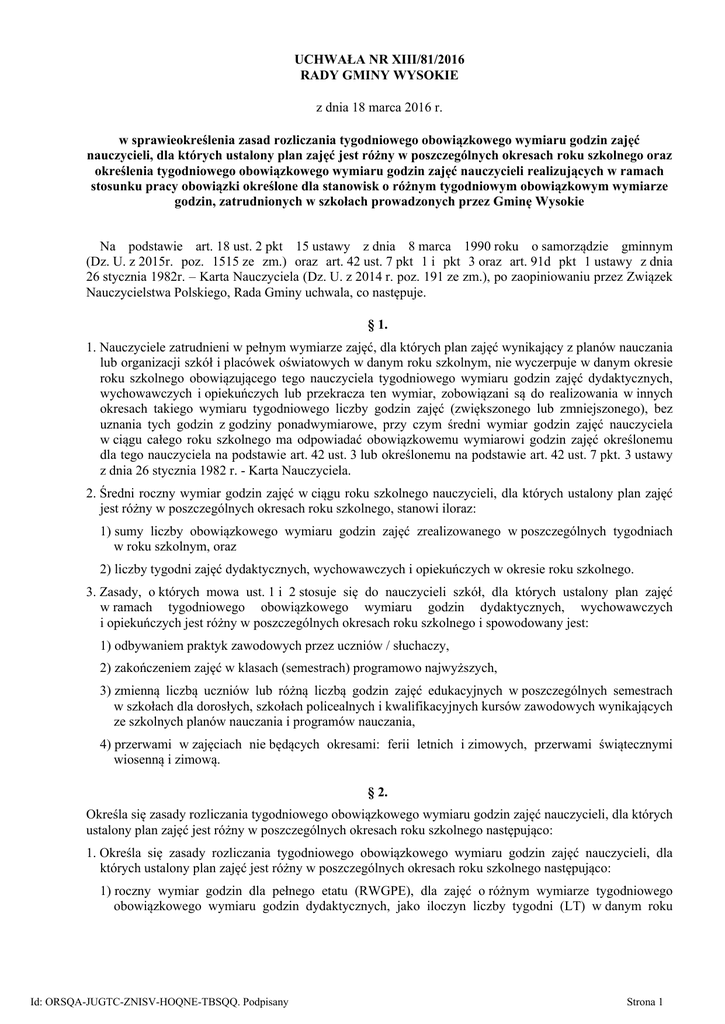 UCHWAŁA NR XIII/81/2016 RADY GMINY WYSOKIE z dnia 18 marca 2016 r. w sprawieokreślenia zasad rozliczania tygodniowego obowiązkowego wymiaru godzin zajęć nauczycieli, dla których ustalony plan zajęć jest różny w poszczególnych okresach roku szkolnego oraz określenia tygodniowego obowiązkowego wymiaru godzin zajęć nauczycieli realizujących w ramach stosunku pracy obowiązki określone dla stanowisk o różnym tygodniowym obowiązkowym wymiarze godzin, zatrudnionych w szkołach prowadzonych przez Gminę Wysokie Na podstawie art. 18 ust. 2 pkt 15 ustawy z dnia 8 marca 1990 roku o samorządzie gminnym (Dz. U. z 2015r. poz. 1515 ze zm.) oraz art. 42 ust. 7 pkt 1 i pkt 3 oraz art. 91d pkt 1 ustawy z dnia 26 stycznia 1982r. – Karta Nauczyciela (Dz. U. z 2014 r. poz. 191 ze zm.), po zaopiniowaniu przez Związek Nauczycielstwa Polskiego, Rada Gminy uchwala, co następuje. § 1. 1. Nauczyciele zatrudnieni w pełnym wymiarze zajęć, dla których plan zajęć wynikający z planów nauczania lub organizacji szkół i placówek oświatowych w danym roku szkolnym, nie wyczerpuje w danym okresie roku szkolnego obowiązującego tego nauczyciela tygodniowego wymiaru godzin zajęć dydaktycznych, wychowawczych i opiekuńczych lub przekracza ten wymiar, zobowiązani są do realizowania w innych okresach takiego wymiaru tygodniowego liczby godzin zajęć (zwiększonego lub zmniejszonego), bez uznania tych godzin z godziny ponadwymiarowe, przy czym średni wymiar godzin zajęć nauczyciela w ciągu całego roku szkolnego ma odpowiadać obowiązkowemu wymiarowi godzin zajęć określonemu dla tego nauczyciela na podstawie art. 42 ust. 3 lub określonemu na podstawie art. 42 ust. 7 pkt. 3 ustawy z dnia 26 stycznia 1982 r. - Karta Nauczyciela. 2. Średni roczny wymiar godzin zajęć w ciągu roku szkolnego nauczycieli, dla których ustalony plan zajęć jest różny w poszczególnych okresach roku szkolnego, stanowi iloraz: 1) sumy liczby obowiązkowego wymiaru godzin zajęć zrealizowanego w poszczególnych tygodniach w roku szkolnym, oraz 2) liczby tygodni zajęć dydaktycznych, wychowawczych i opiekuńczych w okresie roku szkolnego. 3. Zasady, o których mowa ust. 1 i 2 stosuje się do nauczycieli szkół, dla których ustalony plan zajęć w ramach tygodniowego obowiązkowego wymiaru godzin dydaktycznych, wychowawczych i opiekuńczych jest różny w poszczególnych okresach roku szkolnego i spowodowany jest: 1) odbywaniem praktyk zawodowych przez uczniów / słuchaczy, 2) zakończeniem zajęć w klasach (semestrach) programowo najwyższych, 3) zmienną liczbą uczniów lub różną liczbą godzin zajęć edukacyjnych w poszczególnych semestrach w szkołach dla dorosłych, szkołach policealnych i kwalifikacyjnych kursów zawodowych wynikających ze szkolnych planów nauczania i programów nauczania, 4) przerwami w zajęciach nie będących okresami: ferii letnich i zimowych, przerwami świątecznymi wiosenną i zimową. § 2. Określa się zasady rozliczania tygodniowego obowiązkowego wymiaru godzin zajęć nauczycieli, dla których ustalony plan zajęć jest różny w poszczególnych okresach roku szkolnego następująco: 1. Określa się zasady rozliczania tygodniowego obowiązkowego wymiaru godzin zajęć nauczycieli, dla których ustalony plan zajęć jest różny w poszczególnych okresach roku szkolnego następująco: 1) roczny wymiar godzin dla pełnego etatu (RWGPE), dla zajęć o różnym wymiarze tygodniowego obowiązkowego wymiaru godzin dydaktycznych, jako iloczyn liczby tygodni (LT) w danym roku Id: ORSQA-JUGTC-ZNISV-HOQNE-TBSQQ. Podpisany Strona 1 szkolnym oraz tygodniowego wymiaru godzin zajęć (twg) (18, 24, … x), odpowiedniego do typu zajęć dydaktycznych wychowawczych lub opiekuńczych – wzór: RWGPE = LT x twg; 2) średnioroczny wymiar etatu (ŚRWE) jako iloraz rocznej liczby godzin (RLG), realizowanych w poszczególnych tygodniach roku szkolnego oraz liczby godzin rocznego wymiaru godzin dla pełnego etatu (RWGPE) ustalonego zgodnie z pkt 1 – wzór: ŚRWE = (RLG/RWGPE); 3) roczną liczbę godzin ponadwymiarowych (RGPW) jako różnicę między liczbą godzin realizowanych przez nauczyciela w roku szkolnym a (RWGPE) rocznym wymiarem godzin dla nauczyciela ustaloną zgodnie z pkt 1 – wzór: RGPW = (RLG – RWGPE); 4) tygodniową liczbę godzin ponadwymiarowych (GPW) dzieląc wynik wyliczeń z pkt 3 przez (LT) liczbę tygodni w roku szkolnym – wzór: GPW = (RGPW/LT). 2. Wymiar, o którym mowa w ust. 1 pkt 4 określa się w pełnych godzinach tak, że czas zajęć do 0,5 godziny pomija się, a wielkość co najmniej 0,5 godziny zaokrągla się do pełnej godziny. Jeżeli ilość zrealizowanych godzin przekroczy pensum ustalone zgodnie z ust. 1, to godziny przekraczające pensum są godzinami nadliczbowymi. 3. Dopuszcza się możliwość rozliczania godzin ponadwymiarowymi w systemie semestralnym lub kilkumiesięcznym, wtedy do wyliczeń uwzględnia się liczbę tygodni właściwą dla przyjętego okresu rozliczeniowego. 4. Dla nauczycieli zatrudnionych w niepełnym wymiarze godzin, realizujących różny wymiar zajęć w poszczególnych okresach roku szkolnego, w umowie o pracę należy określić średni wymiar godzin zajęć dla okresu zatrudnienia. 5. W przypadku rozwiązania z nauczycielem stosunku pracy przed upływem roku szkolnego, na który został ustalony różny plan zajęć, rozliczenie z przydzielonych w planie organizacyjnym godzin zajęć następuje z datą ustania stosunku pracy, z tym, że za wszystkie przepracowane miesiące, bez względu na wymiar zrealizowanych zajęć, przysługuje nauczycielowi prawo do wynagrodzenia zasadniczego za obowiązkowy tygodniowy wymiar godzin zajęć określony w art. 42 ust. 3 - Karty Nauczyciela. § 3. 1. Określa się tygodniowy obowiązkowy wymiar godzin zajęć nauczycieli realizujących w ramach stosunku pracy obowiązki określone dla stanowisk o różnym tygodniowym obowiązkowym wymiarze godzin następuj
