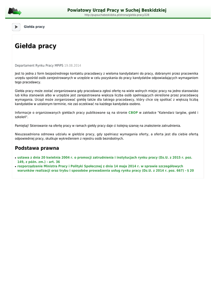 Powiatowy Urząd Pracy w Suchej Beskidzkiej http://pupsuchabeskidzka.pl/strona/gielda-pracy/228 Giełda pracy Giełda pracy Departament Rynku Pracy MPiPS 19.08.2014 Jest to jedna z form bezpośredniego kontaktu pracodawcy z wieloma kandydatami do pracy, dobranymi przez pracownika urzędu spośród osób zarejestrowanych w urzędzie w celu pozyskania do pracy kandydatów odpowiadających wymaganiom tego pracodawcy. Giełda pracy może zostać zorganizowana gdy pracodawca zgłosi ofertę na wiele wolnych miejsc pracy na jedno stanowisko lub kilka stanowisk albo w urzędzie jest zarejestrowana większa liczba osób spełniających określone przez pracodawcę wymagania. Urząd może zorganizować giełdę także dla takiego pracodawcy, który chce się spotkać z większą liczbą kandydatów w ustalonym terminie, nie zaś oczekiwać na każdego kandydata osobno. Informacje o organizowanych giełdach pracy publikowane są na stronie CBOP w zakładce "Kalendarz targów, giełd i szkoleń". Pamiętaj! Skierowanie na ofertę pracy w ramach giełdy pracy daje ci kolejną szansę na znalezienie zatrudnienia. Nieuzasadniona odmowa udziału w giełdzie pracy, gdy spełniasz wymagania oferty, a oferta jest dla ciebie ofertą odpowiedniej pracy, skutkuje wykreśleniem z rejestru osób bezrobotnych. Podstawa prawna ● ● ustawa z dnia 20 kwietnia 2004 r. o promocji zatrudnienia i instytucjach rynku pracy (Dz.U. z 2015 r. poz. 149, z późn. zm.) - art. 36 rozporządzenie Ministra Pracy i Polityki Społecznej z dnia 14 maja 2014 r. w sprawie szczegółowych warunków realizacji oraz trybu i sposobów prowadzenia usług rynku pracy (Dz.U. z 2014 r. poz. 667) - § 20
