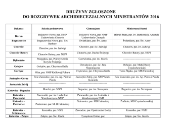 DRUŻYNY ZGŁOSZONE DO ROZGRYWEK ARCHIDIECEZJALNYCH MINISTRANTÓW 2016 Dekanat Bieruń Boguszowice Chorzów Chorzów Batory Szkoła podstawowa Gimnazjum Ministranci Starsi Bojszowy Nowe, par. NMP Uzdrowienia Chorych Boguszowice Nowe, par. Św. Barbary Bojszowy Nowe, par. NMP Uzdrowienia Chorych Świerklany, par. Św. Anny Bieruń Stary, par. św. Bartłomieja Apostoła Chorzów, par. św. Jadwigi Chorzów, par. św. Jadwigi Chorzów, par. Ducha Świętego Chorzów Batory, par. NSPJ Czerwionka, par. św. Józefa -------------------------------- Chwałęcice, par. św. Jana Nepomucena Czyżowice, par. Chrystusa Króla Ochojec, par. Matki Bożej Częstochowskiej Turza Śląska, par. MB Fatimskiej Bzie Zameckie, par. św. Ap. Piotra i Pawła -------------------------------- Jastrzębie Zdrój, par. NMP Matki Kościoła -------------------------------- Bzie Zameckie, par. św. Ap. Piotra i Pawła Murcki, par. NSPJ Bogucice, par. św. Szczepana Bogucice, par. św. Szczepana Panewniki, par. św. Ludwika i Wniebowzięcia NMP Panewniki, par. św. Ludwika i Wniebowzięcia NMP Piotrowice, par. MB Fatimskiej -------------------------------Podlesie, MB Częstochowskiej Koszutka, par. NSPJ Zawodzie, par. Opatrzności Bożej Koszutka, par. NSPJ Załęże, par. Św. Józefa Tysiąclecie Dolne, par. Załęże, par. Św. Józefa Chorzów, par. św. Jadwigi Chorzów Batory, par. NSPJ Dębieńsko Przegędza, par. Podwyższenia Krzyża Świętego Golejów Golejów, par. Chrystusa Króla Gorzyce Jastrzębie Górne Jastrzębie Zdrój Katowice - Bogucice Katowice Panewniki Katowice – Piotrowice Katowice Śródmieście Katowice - Załęże Olza, par. NMP Królowej Pokoju Świerklany, par. Św. Anny -------------------------------- Piotrowice, par. M. B Fatimskiej Knurów Kochłowice Lędziny Łaziska Miedźna Mikołów Mysłowice Niedobczyce Orzesze Pawłowice Śląskie Piekary Śląskie Pogrzebień Pszczyna Pszów Ruda Śląska Rybnik Paniówki, par. Św. Urbana Halemba, par. Bożego Narodzenia Chełm Śląski, par. Trójcy Przenajświętszej Łaziska Górne, par. Matki Bożej Królowej Różańca Świętego --------------------------------------------------------------Piosek, par. św. Krzyż Niedobczyce, par. NSPJ --------------------------------------------------------------Kamień, par. Świętych Apostołów Piotra i Pawła Pogrzebień, par. Św. Bartłomieja Apostoła --------------------------------------------------------------Ruda Śląska – par. Matki Bożej Różańcowej Jejkowice, par. MB Szkaplerznej i św. Piusa X Podwyższenia Krzyża Świętego i Matki Bożej Uzdrowienia Chorych Knurów, par. Św. Cyryla i Metodego Paniówki, par. Św. Urbana Halemba, par. Bożego Narodzenia Bykowina, par. Św. Barbary Imielin, par. MB Szkaplerznej Chełm Śląski, par. Trójcy Przenajświętszej Łaziska Górne, par. Matki Bożej Królowej Różańca Świętego -------------------------------- -------------------------------- -------------------------------- -------------------------------- Mikołów, par. św. Wojciecha Piosek, par. św. Krzyż Niedobczyce, par. NSPJ Janów Miejski, par. Niepokalanego Poczęcia NMP oraz św. M. Kolbe Niedobczyce, par. NSPJ -------------------------------- -------------------------------- -------------------------------- -------------------------------- Piekary Śląskie, par. Najświętszej Maryi Panny i Św. Bartłomieja Ap. Lubomia, par. św. Marii Magdaleny Kamień, par. Świętych Apostołów Piotra i Pawła Lubomia, par. św. Marii Magdaleny -------------------------------- -------------------------------- -------------------------------- -------------------------------- Ruda Śląska – par. Matki Bożej Różańcowej Ligocka Kuźnia, par. św. Wawrzyńca Ruda Sląska, par. św. Piusa X Jejkowice, par. MB Szkaplerznej i św. Piusa X Siemianowice Śląskie Świętochłowice Tychy Nowe Siemianowice Śl. – Bytków, par. Ducha Świętego Lipiny, par. św. Augustyna Tychy, par. św. Franciszka i Klary Tychy Stare Mąkołowiec, par. św. Ojca Pio Wodzisław Śląski Jedłownik, par. MB Wszchpośredniczki Łask i św. Antoniego z Padwy Żory Rogoźna, par. NMP Matki Kościoła Siemianowice Śl. – Bytków, par. Ducha Świętego Lipiny, par. św. Augustyna Siemianowice Śl. – Bytków, par. Ducha Świętego Lipiny, par. św. Augustyna Kobiór, par. Wniebowzięcia NMP Kobiór, par. Wniebowzięcia NMP Czułów, par. Krzyża Świętego Wilkowyje, par. Matki Bożej Królowej Aniołów Wodzisław Śląski, par. Wniebowzięcia NMP Radlin Górny, par. św. Izydora Baranowice, par. św. Jadwigi Śląskiej --------------------------------