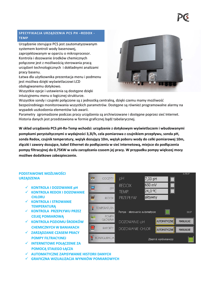 SPECYFIKACJA URZĄDZENIA PCS PH –REDOX TEMP Urządzenie sterujące PCS jest zautomatyzowanym systemem kontroli wody basenowej, zaprojektowanym w oparciu o mikroprocesor. Kontrola i dozowanie środków chemicznych połączone jest z możliwością sterowania pracą urządzeń technologicznych i dokładnymi analizami pracy basenu. Łatwa dla użytkownika prezentacja menu i podmenu jest możliwa dzięki wyświetlaczowi LCD obsługiwanemu dotykowo. Wszystkie opcje i ustawienia są dostępne dzięki intuicyjnemu menu o logicznej strukturze. Wszystkie sondy i czujniki połączone są z jednostką centralną, dzięki czemu mamy możliwość bezpośredniego monitorowania wszystkich parametrów. Dostępne są również programowalne alarmy na wypadek uszkodzenia elementów lub awarii. Parametry zgromadzone podczas pracy urządzenia są archiwizowane i dostępne poprzez sieć Internet. Historia danych jest przedstawiona w formie graficznej bądź tabelarycznej. W skład urządzenia PCS pH-Rx-Temp wchodzi: urządzenie z dotykowym wyświetlaczem i wbudowanymi pompkami perystaltycznymi o wydajności 3,3l/h, cela pomiarowa z czujnikiem przepływu, sonda pH, sonda Redox, czujnik temperatury, wężyk dozujący 10m, wężyk poboru wody do celki pomiarowej 10m, złączki i zawory dozujące, kabel Ethernet do podłączenia w sieć internetową, miejsce do podłączenia pompy filtracyjnej do 0,75KW w celu zarządzania czasem jej pracy. W przypadku pompy większej mocy możliwe dodatkowe zabezpieczenie. PODSTAWOWE MOŻLIWOŚCI URZĄDZENIA KONTROLA I DOZOWANIE pH KONTROLA REDOX I DOZOWANIE CHLORU KONTROLA I STROWANIE TEMPERATURĄ KONTROLA PRZEPŁYWU PRZEZ CELKĘ POMIAROWĄ KONTROLA POZIOMU ŚRODKÓW CHEMICZNYCH W BANIAKACH ZARZĄDZANIE CZASEM PRACY POMPY FILTRACYJNEJ INTERNETOWE POŁĄCZENIE ZA POMOCĄ STAŁEGO ŁĄCZA AUTOMATYCZNE ZAPISYWANIE HISTORII DANYCH GRAFICZNA WIZUALIZACJA WYNIKÓW POMIAROWYCH DODATKOWE MOŻLIWOŚCI KONTROLA POZIMU WODY W ZBIORNIKU WYRÓWNAWCZYM Z SONDAMI POZIOMU KONTROLA POZIOMU WODY W ZBIORNIKU WYRÓWNAWCZYM Z SONDĄ ULTRADŹWIĘKOWĄ STEROWANIE PRACĄ POMPKI DOZUJĄCEJ KOAGULANT WSPÓŁDZIAŁANIE Z PRACĄ AUTOMATYCZNEGO ZAWORU FILTRACYJNEGO BEZPRZEWODOWE POŁĄCZENIE INTERNETOWE DANE TECHNICZNE WYŚWIETLACZ LCD panoramiczny 7” z dotykowym interfejsem ELEKTRODA pH 0-14 z zasadową korektą, zbudowana z rdzenia Ag/AgCl , końcówka szklana pokryta tlenkiem krzemu ELEKTRODA ORP 0-2000 mV zbudowana z rdzenia Ag/AgCl i końcówki Pt TEMPERATURA -10 do 85 °C, możliwość sterowania grzałką elektryczną, wymiennikiem CO i systemem solarycznym KALIBRACJA 1 lub 2 punktowa SPOSÓB STEROWANIA manualny i automatyczny PAMIĘĆ Automatyczne zapisywanie historii parametrów ZDALNE STEROWANIE kontrola urządzenia i dostęp do danych archiwalnych poprzez serwis internetowy WYMIARY 320x 522x129 mm PODŁĄCZENIA ELEKTRYCZNE zasilanie 230V GWARANCJA 2 lata na części elektroniczne WAGA 12kg WYMIARY URZĄDZENIA
