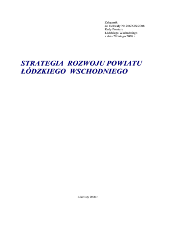 Załącznik do Uchwały Nr 206/XIX/2008 Rady Powiatu Łódzkiego Wschodniego z dnia 28 lutego 2008 r. STRATEGIA ROZWOJU POWIATU ŁÓDZKIEGO WSCHODNIEGO Łódź luty 2008 r. Strategia Rozwoju Powiatu Łódzkiego Wschodniego Spis Treści : I. Wstęp 4 II. Charakterystyka terenu Powiatu Łódzkiego Wschodniego. 7 1. Położenie, granice, powierzchnia._______________________________________ 7 2. Geomorfologia, środowisko. ___________________________________________ 9 III. Stan aktualny Powiatu Łódzkiego Wschodniego – analiza. 13 1. Sfera społeczna _____________________________________________________ 13 1.1. Demografia ________________________________________________________ 13 1.2. Warunki i jakość życia mieszkańców.____________________________________ 16 1.2.1. Rynek pracy. ______________________________________________________ 16 1.2.2. Bezrobocie _______________________________________________________ 17 1.2.3. Aktywność gospodarcza _____________________________________________ 22 2. Infrastruktura społeczna. ____________________________________________ 22 2.1. Oświata. ___________________________________________________________ 22 2.2. Opieka zdrowotna i pomoc społeczna. ___________________________________ 24 2.3. Bezpieczeństwo publiczne. ____________________________________________ 32 2.4. Zasoby mieszkaniowe.________________________________________________ 32 2.5. Dziedzictwo kulturowe, turystyka, wypoczynek i rekreacja. __________________ 33 3. Infrastruktura techniczna ____________________________________________ 39 3.1. Zaopatrzenie w wodę_________________________________________________ 39 3.2. Sieć kanalizacji i oczyszczanie ścieków __________________________________ 40 3.3. Infrastruktura energetyczna ____________________________________________ 41 3.4. Uciepłownienie powiatu. ______________________________________________ 42 3.5. Gazyfikacja powiatu _________________________________________________ 42 3.6. Możliwości w zakresie wykorzystania odnawialnych źródeł energii ____________ 43 3.7. Sieć drogowa _______________________________________________________ 43 3.8. Linie kolejowe i inne środki transportu ___________________________________ 44 3.9. Infrastruktura komunikacyjna __________________________________________ 45 4. Mienie Powiatu - własność nieruchomości. _________________________________ 46 IV . Analiza SWOT 49 V . Identyfikacja problemów. 52 1. Sfera społeczna ________________________________________________________ 52 1.1.Bezrobocie _________________________________________________________ 54 1.2.Patologia społeczna. __________________________________________________ 55 1.3.Niedostępna infrastruktura społeczna_____________________________________ 56 1.4.Udział organizacji społecznych. _________________________________________ 56 2. Sfera gospodarcza. __________________________________________________ 59 2.1.Niski poziom rozwoju gospodarczego ____________________________________ 59 2.2. Dostęp podmiotów gospodarczych do informacji. __________________________ 59 2.3.Brak promocji i preferencji dla działalności gospodarczej indywidualnej. ________ 59 2.4.Słaba infrastruktura otoczenia biznesu. ___________________________________ 59 3. Problemy środowiskowe _____________________________________________ 60 2 Strategia Rozwoju Powiatu Łódzkiego Wschodniego 3.1.Niski stopień ochrony wód. ____________________________________________ 60 3.2. Występowanie zanieczyszczeń powietrza w postaci „ niskiej emisji ”___________ 60 3.3. Brak dostatecznych działań w zakresie niektórych odpadów. _________________ 60 3.4. Brak informacji o promocji walorów przyrodniczo – krajobrazowych. __________ 60 VI . Spójność ze Strategią Województwa Łódzkiego 60 VII Cele Strategii : 62 1. Cele Strategiczne ______________________________________________________ 62 2. Cele operacyjne _______________________________________________________ 62 3. Priorytetowe działania, horyzonty czasowe_________________________________ 63 VIII. Instrumenty wdrażania strategii 67 1. Podmiot wdrażający ___________________________________________________ 67 2. Plany, Programy, Zadania. ______________________________________________ 67 IX . Źródła i sposoby finansowania 68 X. Monitorowanie 70 3 Strategia Rozwoju Powiatu Łódzkiego Wschodniego I. Wstęp Strategia Powiatu Łódzkiego Wschodniego jest dokumentem zawierającym opis celów i wieloletnich świadomych działań dla ich spełnienia na rzecz podmiotu działań – społeczeństwa objętego obszarem Powiatu Łódzkiego Wschodniego. W opracowaniu Strategii wzięto pod uwagę kryteria : Zasadę spójności z zewnętrznymi uwarunkowaniami opracowania Strategii wyznaczonymi przez : Strategię Rozwoju Województwa Łódzkiego Priorytety rozwoju Unii Europejskiej Polityki horyzontalne i Programy Rozwoju Polski – m. innymi ZPORR i SPO. Kompetencje Starostwa Powiatowego - jako koordynatora działań międzygminnych i ponadlokalnych. - jako bezpośredniego wykonawcy zadań wynikających z obowiązków kompetencyjnych starostw powiatowych. Metodologia opracowania Strategii Prace związane z opracowaniem Strategii wykonano wg. przyjętej metodologii : • Opis stanu obecnego W oparciu o wybór źródeł informacji i ustalenia dotyczące zakresu danych, zebrano i uporządkowano informacje mające znaczenie dla opracowania Strategii. • Analiza stanu obecnego Przeprowadzono analizę stanu istniejącego w oparciu o zebrane informacje w celu identyfikacji istotnych problemów Powiatu i jego potencjału rozwojowego. Wykonano analizę SWOT • Identyfikacja problemów W oparciu o wnioski z analizy stanu przeprowadzono wybór najważniejszych problemów i barier rozwoju powiatu. 4 Strategia Rozwoju Powiatu Łódzkiego Wschodniego Wybór celów Dla rozwiązania najważniejszych problemów określono: - cele strategiczne działań - cele operacyjne ( szczegółowe ) - rodzaj i charakter działań dla osi