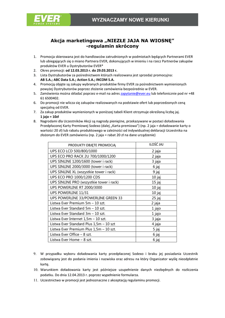 Akcja marketingowa „NIEZŁE JAJA NA WIOSNĘ” -regulamin skrócony 1. 2. 3. 4. 5. 6. 7. 8. Promocja skierowana jest do handlowców zatrudnionych w podmiotach będących Partnerami EVER lub ubiegających się o miano Partnera EVER, dokonujących w imieniu i na rzecz Partnerów zakupów produktów EVER u Dystrybutorów EVER* Okres promocji: od 12.03.2013 r. do 29.03.2013 r. Lista Dystrybutorów za pośrednictwem których realizowana jest sprzedaż promocyjna: AB S.A.; ABC Data S.A.; Action S.A.; INCOM S.A. Promocją objęte są zakupy wybranych produktów firmy EVER za pośrednictwem wymienionych powyżej Dystrybutorów poprzez złożenie zamówienia bezpośrednio w EVER. Zamówienia można składać poprzez e-mail na adres [email protected] lub telefonicznie pod nr +48 61 6500402. Do promocji nie wlicza się zakupów realizowanych na podstawie ofert lub poprzedzonych ceną specjalną od EVER. Za zakup produktów wymienionych w poniższej tabeli Klient otrzymuje określoną liczbę jaj. 1 jajo = 10zł Nagrodami dla Uczestników Akcji są nagrody pieniężne, przekazywane w postaci doładowania Przedpłaconej Karty Premiowej Sodexo (dalej „Karta premiowa”) (np. 2 jaja = doładowanie karty o wartości 20 zł) lub rabatu produktowego w zależności od indywidualnej deklaracji Uczestnika na złożonym do EVER zamówieniu (np. 2 jaja = rabat 20 zł na dane urządzenie) PRODUKTY OBJĘTE PROMOCJĄ UPS ECO LCD 500/800/1000 UPS ECO PRO RACK 2U 700/1000/1200 UPS SINLINE 1200/1600 (tower i rack) UPS SINLINE 2000/3000 (tower i rack) UPS SINLINE XL (wszystkie tower i rack) UPS ECO PRO 1000/1200 CDS UPS SINLINE PRO (wszystkie tower i rack) UPS POWERLINE RT 2000/3000 UPS POWERLINE 11/31 UPS POWERLINE 33/POWERLINE GREEN 33 Listwa Ever Premium 5m – 10 szt. Listwa Ever Standard 5m – 10 szt. Listwa Ever Standard 3m – 10 szt. Listwa Ever Internet 1,5m – 10 szt. Listwa Ever Standard Plus 1,5m – 10 szt Listwa Ever Premium Plus 1,5m – 10 szt. Listwa Ever Office – 8 szt. Listwa Ever Home – 8 szt. ILOŚĆ JAJ 2 jaja 2 jaja 3 jaja 6 jaj 9 jaj 10 jaj 15 jaj 10 jaj 10 jaj 25 jaj 2 jaja 1 jajo 1 jajo 3 jaja 4 jaja 5 jaj 6 jaj 6 jaj W przypadku wyboru doładowania karty przedpłaconej Sodexo i braku jej posiadania Uczestnik zobowiązany jest do podania imienia i nazwiska oraz adresu na który Organizator wyślę nieodpłatnie kartę. 10. Warunkiem doładowania karty jest późniejsze uzupełnienie danych niezbędnych do rozliczenia podatku. Do dnia 12.04.2013 r. poprzez wypełnienie formularza. 11. Uczestnictwo w promocji jest jednoznaczne z akceptacją regulaminu promocji. 9. 12. W przypadku wyboru doładowania podatek od premii (doładowania) pokrywa uczestnik w rozliczeniu rocznym. Podczas doładowania premii Organizator powiększa kwotę doładowania o wartość podatku. 13. Rozliczenie promocji – wysyłka nagród - nastąpi w ciągu 30 dni od zakończenia promocji. *Dobrowolność i legalność uczestniczenia w Promocji Każdy uczestnik - osoba fizyczna (pracownik przedsiębiorcy będącego Partnerem EVER lub ubiegający się o ten tytuł), uczestniczy w Promocji na zasadach dobrowolności oraz w zgodzie z wymaganiami jego pracodawcy. Dlatego też przystąpienie do Promocji przez taką osobę, każda jej czynność przedsięwzięta bezpośrednio w celu uzyskania nagrody w Promocji lub zgłoszenie się po tę nagrodę upoważnia domniemanie, że uczestnictwo w Promocji nie narusza właściwych relacji pomiędzy uczestnikiem Promocji i jego pracodawcą. W przypadku wystąpienia jakiejkolwiek sprzeczności pomiędzy uczestniczeniem w Promocji a wymogami nałożonymi przez pracodawcę, te ostatnie powinny mieć znaczenie nadrzędne. Za ewentualne nieprzestrzeganie tej zasady odpowiedzialność ponosi uczestnik Promocji