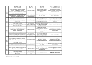 ŚNIADANIE I Płatki kukurydziane na mleku, pieczywo mieszane, masło, kiełbasa żywiecka podsuszana, pomidor, ogórek świeży, herbata 18.11. 2015 II owoc- mandarynka, kanapka mleko, płatki kukurydziane, pieczywo białe i z ziarnem, masło, kiełbasa żywiecka, pomidor, ogórek świeży, herbata 19.11. 2015 I Zacierki na mleku, pieczywo mieszane z masłem, baleron odtluszczony, papryka, sałata, herbata II owoc- banan, herbtniki mleko, mąka pszenna, jaja, pieczywo białe i słonecznikowe, masło, baleron, papryka, sałata, herbata I Płatki ryżowe na mleku, pieczywo mieszane z masłem, szynka wieprzowa, ser biały, pomidor, ogórek świeży 20.11. 2015 II owoc- szaron, budyń mleko, płatki ryżowe, pieczywo białe i z ziarnem, masło, szynka wieprzowa, ser biały, pomidor, ogórek świeży, budyń- mleko, mąka pszenna, mąka ziemniaczana, wanilia 21.11. 2015 I Lane kluski, pieczywo mieszane z masłem, kiełbasa krakowska, papryka, sałata, herbata II owoc- jabłko, kanapka mleko, mąka pszenna, jaja, pieczywo białe i sojowe, masło, kiełbasa krakowska, papryka, sałata, herbata 22.11. 2015 I Kakao, pieczywo mieszane, masło, salami, ser żółty, sałata, papryka, herbata II owoc- banan, kanapka mleko, kakao, piecywo białe i zdrówko, masło, salami, papryka, ser żółty, sałata, herbata wyróżniono grubym drukiem alergeny ZUPA OBIAD PODWIECZOREK Gulaszowa z natką Makaron razowy z serem białym, sos truskawkowy, kompot Chleb z ziarnami z masłem, polędwica sopocka, papryka, sałata, winogrona, kawa inka wywar marzywno-mięsny, marcherka, por, seler, pietruszka, ziemniaki, papryka, koncentrat pomidorowy, cebula, natka makaron razowy, ser biały, sos truskawkowy, miód, wanilia, kompot pieczywo z ziarnem, masło, polędwica sopocka, papryka, sałata, kawa, mleko Krupnik z kaszy pęczak Klops w sosie chrzanowym, ziemniaki, kalafior z masłem, surówka z pomidora, kompot Bułka z masłem, pasta z makreli, rzodkiewka, ogórek kiszony, kiwi, bawarka wywar warzywno-mięsny, marcherka, por, seler, pietruszka, kasza pęczak, ziemniaki, natka mięso wieprzowe, jaja (bułka do namoczenia), chrzan, mąka, ziemniaki, kalafior, masło, surówka-pomidor, cebula, olej bułka, masło, pasta- makrela, jaja, majonez, rzodkiewka, ogórek kiszony, mleko, herbata Makaron na rosole Kotlet z piersi kurczaka, ziemniaki, marchew gotowana, surówka wielowarzywna, kompot Chleb z ziarnem z masłem, kresowiak, papryka, szczypiorek, gruszka, mleko wywar warzywno-mięsny, marchewka, seler, por, pietruszka, makaron, natka pierś z kurczaka, mąka orkiszowa, jajka, ziemniaki, marchewka, surówka, sałata, papryka, rzodkiewka, ogórek świeży, olej pieczywo z ziarnem, masło, kiełbasa kresowska, papryka, szczypiorek, mleko Ziemniaczana z natką Zrazy wołowe, kasza jęczmienna, buraczki zasmażane, mizeria, kompot Bułka z masłem, polędwica tradycyjna, pomidor, ogórek kiszony, mandarynka, kawa inka wywar warzywno-mięsny, marchew, seler, por, pietruszka, ziemniaki, cebula, olej, natka mięso wołowe, cebula, mąka orkiszowa, kasza bułka, masło, polędwica tradycyjna, pomidor, ogórek jęczmienna, buraczki- masło, mizeria- ogórek kiszony, kawa, mleko świeży, śmietana Ogórkowa z ryżem Pulpety z ryby, ziemniaki, surówka z kapusty pekińskiej i koperku, kompot Chałka z masłem, jogutr owocowy, herbata wywar warzywno-mięsny, marchew, por, pietruszka, seler, ryż, ogórek kiszony, śmietana, natka filet z mintaja, olej, jaja, kasza manna, ziemniaki, surówka- kapusta pekińska, koper chałka, masło, jogurt, truskawki