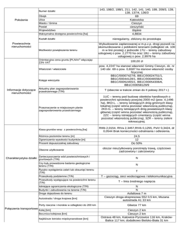 Numer działki Położenie Obręb Ulica Miasto / Gmina Powiat Województwo Maksymalna dostępna powierzchnia [ha] Kształt działki Powierzchnia nieruchomości Możliwości powiększenia terenu Orientacyjna cena gruntu [PLN/m2] włączając 23% VAT Właściciel / właściciele Księga wieczysta Informacje dotyczące nieruchomości Aktualny plan zagospodarowania przestrzennego (T/N) Przeznaczenie w miejscowym planie zagospodarowania przestrzennego Klasa gruntów wraz z powierzchnią [ha] Różnica poziomów terenu [m] Ograniczenia wysokości budynków [m] Procent dopuszczalnej zabudowy Obecne użytkowanie nieregularny, zbliżony do prostokąta Wybudowanie zaplanowanej w m.p.z.p. drogi pozwoli na skomunikowanie z pobliskimi terenami (odległość ok. 100 m w linii prostej) z jednostki 17U – tereny zabudowy usługowej o pow. 2,2770 ha oraz 18U – tereny zabudowy usługowej o pow. 2,9976 ha 100,00 zł pow. 4,2247 ha stanowi własność Gminy Cieszyn, dz. nr 140 obr. 69 o pow. 0,6587 ha stanowi własność osoby fizycznej BB1C/00007427/6, BB1C/00024751/1, BB1C/00044128/1, BB1C/00046556/4, BB1C/00052455/1, BB1C/00054306/6, BB1C/00058129/9 T (obecnie w trakcie zmian do II połowy 2017 r.) 1UC – tereny pod budowę obiektów handlowych o powierzchni sprzedaży powyżej 2000 m2 (pow. 4,1496 ha), 8KD-L. – tereny istniejących dróg gminnych klasy lokalnej (część winna pozostać własnością publiczną), 2KD-G. – tereny istniejących dróg powiatowych klasy głównej (część winna pozostać własnością publiczną), 2ZC – tereny istniejących cmentarzy (część winna pozostać własnością publiczną), 3ZR – tereny zieleni rekreacyjnej. RIIIb 2,0154, RIVa 2,3457,RIVb 0,1255, PsIV 0,3424, dr 0,0544 Brak konieczności odralniania i odlesienia. 24,5 12 Do 50% obszar nieużytkowany porośnięty trawą, częściowo zadrzewiony i zakrzewiony Zanieczyszczenia wód powierzchniowych i N Czy były prowadzone badania geologiczne terenu (T/N) N Ryzyko wystąpienia zalań lub obsunięć terenu (T/N) Przeszkody podziemne (T/N) Przeszkody występujące na powierzchni terenu (T/N) Istniejące ograniczenia ekologiczne (T/N) Budynki i zabudowania na terenie (T/N) Droga dojazdowa do terenu T Charakterystyka działki gruntowych (T/N) Autostrada / droga krajowa [km] Porty rzeczne i morskie w odległości do 200 km Połączenia transportowe 143, 198/2, 198/1, 211, 142, 141, 140, 199, 209/3, 139, 138, 137/4, 136/3 69 Katowicka Cieszyn cieszyński śląskie 4,8834 Kolej [km] Bocznica kolejowa [km] Najbliższe lotnisko międzynarodowe [km] T – gazociąg, sieci wodociągowa i telekomunikacyjna T – linia średniego napięcia N N Asfaltowa 7 m Cieszyn droga ekspresowa S52 0,5 km, Mszana autostrada A1 33 km Gliwice 77 km Cieszyn 2 km Cieszyn 2 km Ostrava 48 km, Katowice-Pyrzowice 116 km, KrakówBalice 117 km; dodatkowo Bielsko-Biała 31 km Najbliższe miasto wojewódzkie [km] Elektryczność na terenie (T/N) Odległość przyłącza od granicy terenu [m] Gaz na terenie (T/N) Odległość przyłącza od granicy działki [m] Średnica rury [mm] Woda na terenie (T/N) Istniejąca infrastruktura Odległość przyłącza od granicy terenu [m] Kanalizacja na terenie (T/N) Odległość przyłącza od granicy terenu [m] Oczyszczalnia ścieków na terenie bądź w bezpośrednim sąsiedztwie (T/N) Telefony (T/N) Odległość przyłącza od granicy terenu [m] Katowice 74 km N 40 T 0 100 T 0 N 400 N T 0 Uwagi Zachodnia część obszaru (pas o szerokości około 60 m) charakteryzuje się umiarkowanym spadkiem wysokości terenu – różnica wynosi około 5 m. Środkowa i wschodnia część cechuje się już znacznym spadkiem około 17 m od najwyższego do najniższego punktu. Obszar posiada bezpośredni dostęp do drogi publicznej powiatowej ul. Katowickiej, z której w bezpośredniej bliskości znajduje się zjazd na drogę ekspresową S52 (Cieszyn – Bielsko-Biała). Aktualny zjazd na posesję z ul. Katowickiej odbywa się zjazdem tymczasowym, utwardzonym płytami betonowymi. Sąsiedztwo stanowią tereny usługowe od strony zachodniej, zabudowa mieszkalna jednorodzinna (strona północna i wschodnia) a także budownictwo wielorodzinne (strona południowozachodnia), tereny zieleni nieurządzonej (strona wschodnia) oraz teren cmentarza komunalnego od strony południowej. W bezpośredniej bliskości przebiega również droga ekspresowa wraz ze zjazdami. Osoba przygotowująca ofertę Błażej Zubrzycki, główny specjalista, +48 33 4794236, [email protected], angielski i czeski Osoby do kontaktu Edyta Czarnecka, podinspektor, +48 33 4794254, [email protected] Załączniki 8 zdjęć terenu, zdjęcie lotnicze, 3 mapki terenu https://www.google.pl/maps/dir/49.762955,18.6382876//@49.