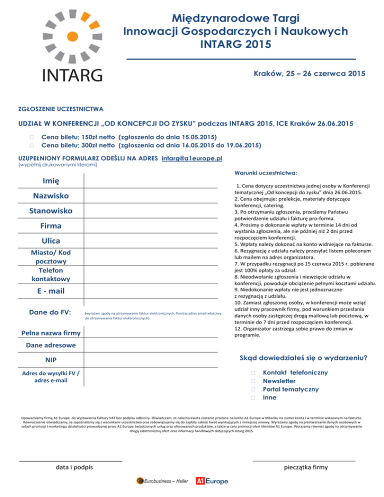 Międzynarodowe Targi Innowacji Gospodarczych i Naukowych INTARG 2015 Kraków, 25 – 26 czerwca 2015 ZGŁOSZENIE UCZESTNICTWA UDZIAŁ W KONFERENCJI „OD KONCEPCJI DO ZYSKU” podczas INTARG 2015, ICE Kraków 26.06.2015 Cena biletu; 150zł netto (zgłoszenia do dnia 15.05.2015) Cena biletu; 300zł netto (zgłoszenia od dnia 16.05.2015 do 19.06.2015) UZUPEŁNIONY FORMULARZ ODEŚLIJ NA ADRES [email protected] (wypełnij drukowanymi literami) Warunki uczestnictwa: Imię Nazwisko Stanowisko Firma Ulica Miasto/ Kod pocztowy Telefon kontaktowy E - mail Dane do FV: (wyrażam zgodę na otrzymywanie faktur elektronicznych. Poniżej adres email właściwy do otrzymywania faktur elektronicznych): Pełna nazwa firmy 1. Cena dotyczy uczestnictwa jednej osoby w Konferencji tematycznej „Od koncepcji do zysku” dnia 26.06.2015. 2. Cena obejmuje: prelekcje, materiały dotyczące konferencji, catering. 3. Po otrzymaniu zgłoszenia, prześlemy Państwu potwierdzenie udziału i fakturę pro-forma. 4. Prosimy o dokonanie wpłaty w terminie 14 dni od wysłania zgłoszenia, ale nie później niż 2 dni przed rozpoczęciem konferencji. 5. Wpłaty należy dokonać na konto widniejące na fakturze. 6. Rezygnację z udziału należy przesyłać listem poleconym lub mailem na adres organizatora. 7. W przypadku rezygnacji po 15 czerwca 2015 r. pobierane jest 100% opłaty za udział. 8. Nieodwołanie zgłoszenia i niewzięcie udziału w konferencji, powoduje obciążenie pełnymi kosztami udziału. 9. Niedokonanie wpłaty nie jest jednoznaczne z rezygnacją z udziału. 10. Zamiast zgłoszonej osoby, w konferencji może wziąć udział inny pracownik firmy, pod warunkiem przesłania danych osoby zastępczej drogą mailową lub pocztową, w terminie do 7 dni przed rozpoczęciem konferencji. 12. Organizator zastrzega sobie prawo do zmian w programie. Dane adresowe NIP Adres do wysyłki FV / adres e-mail Skąd dowiedziałeś się o wydarzeniu? Kontakt telefoniczny Newsletter Portal tematyczny Inne Upoważniamy firmę A1 Europe do wystawienia faktury VAT bez podpisu odbiorcy. Oświadczam, że należna kwota zostanie przelana na konto A1 Europe w Mbanku na numer konta i w terminie wskazanym na fakturze. Równocześnie oświadczamy, że zapoznaliśmy się z warunkami uczestnictwa oraz zobowiązujemy się do zapłaty całości kwot wynikających z niniejszej umowy. Wyrażamy zgodę na przetwarzanie danych osobowych w celach promocji i marketingu działalności prowadzonej przez A1 Europe świadczonych usług oraz oferowanych produktów, a także w celu promocji ofert klientów A1 Europe. Wyrażamy również zgodę na otrzymywanie drogą elektroniczną ofert oraz informacji handlowych dotyczących Intarg 2015. data i podpis pieczątka firmy