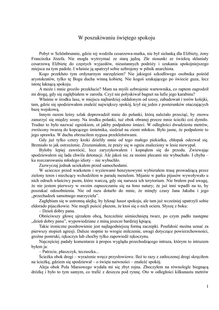 W poszukiwaniu świętego spokoju Pobyt w Schönbrunnie, gdzie rej wodziła cesarzowa-matka, nie był sielanką dla Elżbiety, żony Franciszka Józefa. Nie mogła wytrzymać ze starą jędzą. Złe stosunki ze świekrą skłaniały cesarzową Elżbietę do częstych wyjazdów, nieustannych podróży i szukania spokojniejszego miejsca na tym padole. I właśnie ją upatrzył sobie uzbrojony w pilnik anarchista. Kogo przekłuto tym ordynarnym narzędziem? Nie jakiegoś szkodliwego osobnika pośród arystokratów, tylko tę Bogu ducha winną kobietę. Nie kogoś szukającego po świecie guza, lecz istotę łaknącą spokoju. A może i mnie groziło przekłucie? Mam na myśli uzbrojenie wartownika, co raptem zagrodził mi drogę, gdy się zagłębiałem w zarośla. Czyż nie połyskiwał bagnet na lufie jego karabinu? Właśnie w środku lasu, w miejscu najbardziej oddalonym od szosy, zabudowań i torów kolejki, tam, gdzie się spodziewałem znaleźć największy spokój, krył się jeden z posterunków otaczających bazę wojskową. Innym razem leśny szlak doprowadził mnie do polanki, którą należało przeciąć, by znowu zanurzyć się między sosny. Na środku polanki, tuż obok obranej przeze mnie ścieżki coś dymiło. Trudno to było nazwać ogniskiem, ot jakby podpalono śmieci. W odległości dwudziestu metrów, zwrócony twarzą do kopcącego śmietnika, siedział na ziemi młokos. Było jasne, że podpalenie to jego sprawka. W duchu obrzuciłem nygusa przekleństwami. Gdy już tylko cztery kroki dzieliły mnie od tego małego piekiełka, chłopak odezwał się. Brzmiało to jak ostrzeżenie. Zrozumiałem, że praży się w ogniu znaleziony w lesie niewypał. Byłoby lepiej zawrócić, lecz zaryzykowałem i kopnąłem się do przodu. Zwiewając spodziewałem się lada chwila detonacji. Ale jakoś nic za moimi plecami nie wybuchało. I chyba – ku rozczarowaniu młodego idioty – nie wybuchło. Zazwyczaj jednak uciekałem przed samochodami. W ucieczce przed warkotem i wyziewami benzynowymi wybierałem trasę prowadzącą przez zielony teren i niechcący wchodziłem w paradę menelom. Mijanie w parku pijusów wywoływało u nich odruch właściwy psom, które warczą, gdy się narusza ich terytorium. Nie brałem pod uwagę, że nie jestem pierwszy w swoim zapuszczaniu się na łono natury; że już inni wpadli na to, by poszukać odosobnienia. Nie od razu dotarło do mnie, że minęły czasy Jana Jakuba i jego „przechadzek samotnego marzyciela”. Zagłębiam się w ustronną alejkę, by łyknąć haust spokoju, ale tam już wcześniej upatrzyli sobie eldorado pijaczkowie. Nie mogli puścić płazem, że ktoś się o nich ociera. Słyszę z boku: – Dzień dobry panu. Obróciwszy głowę ujrzałem obcą, bezczelnie uśmiechniętą twarz, po czym padło następne „dzień dobry panu”, wypowiedziane z miną jeszcze bardziej kpiącą. Takie ironiczne pozdrowienie jest najłagodniejszą formą zaczepki. Poufałość można uznać za pierwszy stopień agresji. Dalsze stopnie to wrogie milczenie, uwagi dotyczące powierzchowności, groźne pomruki, rękoczyn lub choćby tylko zapowiedź rękoczynu. Najczęściej padały komentarze à propos wyglądu przechodzącego intruza, którym to intruzem byłem ja: – Patrzcie, płaszczyk, teczuszka... Ścieżka obok drogi – wyrażenie wręcz przysłowiowe. Ileż to razy z zatłoczonej drogi skręciłem na ścieżkę, gdziem się spodziewał – o święta naiwności – znaleźć spokój. Aleja obok Pola Marsowego wydała mi się zbyt rojna. Zboczyłem na równolegle biegnącą dróżkę i było to tym samym, co trafić z deszczu pod rynnę. Oto w odległości kilkunastu metrów 1 pojawia się Cyganka; jeszcze chwila, a zastąpi mi drogę. Nie zmieniając kierunku puściłem się pędem, udając kogoś trenującego bieganie. Tylko dzięki temu uniknąłem natręctwa. Parę sekund wcześniej, kiedym szedł aleją, naciągaczka nie śmiałaby mnie zaczepić. W tłumie byłbym bezpieczny. Tak więc ucieczka przed ruchem ulicznym i spalinami okazywała się beznadziejna. Skręcanie na boczne drogi i ścieżki nic nie dawało. Mogło być jeszcze gorzej niż przedtem. Czyhały niespodzianki: a to łajno, a to alkoholik napraszający się o jałmużnę, a to Cyganka ze swoimi usługami wróżbiarskimi, a to szczekające psy. Ba, żeby tylko szczekające. Jeden nie szczekał; zaszedł mnie z boku cichaczem i dziabnął. Cieszyło mnie, ilekroć się dowiadywałem, że szczekanie psów działa komuś na nerwy. Cieszyła świadomość, że nie jestem odosobniony w swej niedoli. Miałem chwilę takiej uciechy w pewnym biurze, gdziem był zatrudniony. Rozmowa urzędników przy sąsiednim stole zaczęła się od narzekania na ranne pianie kogutów, na te piekielne odgłosy wyrywające ze snu. Ktoś opowiadał o nerwowcu, którego owo kukuryku doprowadziło do ostateczności: zrywał się z łóżka, by na nienawistnego ptaka chlusnąć przez okno gorącą wodą. Usłyszałem głos drugiego rozmówcy: – U nas spokojnie. Reakcja tego, co opowiadał o kogutach, była sceptyczna; z niedowierzaniem przyjął oświadczenie o czyimś domowym spokoju: – A psy? – O, psów jest do cholery. – A widzi pan. Przestałem szukać spokoju przekonawszy się, że miejsc spokojnych na tym świecie nie ma. Przyswoiłem sobie pewne przykazanie i przestrzegałem go: nie gwałcić czyjegoś terytorium, poruszać się po terytorium wspólnym, neutralnym. Takim terytorium powinna być ulica, nieprawdaż? To przecież terytorium wspólne, przestrzeń dla każdego. Lecz i na ulicy spokojnemu człowiekowi nie zawsze uda się przejść spokojnie. W tym incydencie ulicznym, który zaraz opiszę, główna rola przypadła moczymordzie w średnim wieku, chłopu rosłemu i grubemu. Ochlapusowi nie znającemu dnia ni godziny, bo o każdej porze w ciągu doby trafić się może flaszka. No i trafiła się: w owo przedpołudnie. Maszerował ulicą ze swym kumplem, takim sam