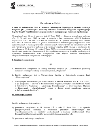 Matematyka podstawą sukcesu Uniwersytet Śląski w Katowicach, ul. Bankowa 12, 40-007 Katowice, http://www.us.edu.pl Zarządzenie nr 93/ 2011 z dnia 12 października 2011 r. Rektora Uniwersytetu Śląskiego w sprawie realizacji Projektu pt.: „Matematyka podstawą sukcesu” w ramach Programu Operacyjnego Kapitał Ludzki, współfinansowanego ze środków Europejskiego Funduszu Społecznego. Na podstawie art. 66 ust. 2 ustawy z dnia 27 lipca 2005 r. - Prawo o szkolnictwie wyższym (Dz. U. Nr 164, poz. 1365, ze zm.), w związku z listą rankingową MNiSW konkursu 1/POKL/4.1.2/2011 nr KSI 214 z dnia 14 czerwca 2011 r., zgodnie z uchwałą nr 67 Senatu UŚ z dnia 26 czerwca 2007 r. w sprawie zatrudniania i dodatkowego wynagradzania osób uczestniczących w realizacji projektów finansowanych z innych źródeł niż określone w art. 94 ust. 1 (ze zmianą zawartą w uchwale nr 2 z dnia 23 września 2008 r.) oraz w nawiązaniu do zarządzenia nr 58 Rektora UŚ z dnia 22 lipca 2011 r. w sprawie przygotowywania, realizacji i rozliczania projektów finansowanych lub współfinansowanych ze środków pochodzących z funduszy strukturalnych Unii Europejskiej i/lub innych środków europejskich i międzynarodowych zarządza się, co następuje: I. Przedmiot zarządzenia §1 1. Przedmiotem zarządzenia są zasady realizacji Projektu pt.: „Matematyka podstawą sukcesu”, zwanego w dalszej części zarządzenia ,,Projektem”. 2. Projekt realizowany jest w Uniwersytecie Śląskim w Katowicach, zwanym dalej „Uniwersytetem”. 3. Nadrzędnym dokumentem jest wzór umowy w ramach konkursu 1/POKL/4.1.2/2011, a po podpisaniu – umowa o dofinansowanie Projektu pomiędzy Ministerstwem Nauki i Szkolnictwa Wyższego - ,,Instytucją Pośredniczącą” a Uniwersytetem Śląskim w Katowicach - „Beneficjentem”, zwana w dalszej części zarządzenia „umową o dofinansowanie Projektu”. II. Realizacja Projektu §2 Projekt realizowany jest zgodnie z: 1) przepisami zarządzenia nr 58 Rektora UŚ z dnia 22 lipca 2011 r. w sprawie przygotowywania, realizacji i rozliczania projektów finansowanych lub współfinansowanych ze środków pochodzących z funduszy strukturalnych Unii Europejskiej i/lub innych środków europejskich i międzynarodowych; 2) przepisami niniejszego zarządzenia. 1 Projekt współfinansowany przez Unię Europejską w ramach Europejskiego Funduszu Społecznego Matematyka podstawą sukcesu Uniwersytet Śląski w Katowicach, ul. Bankowa 12, 40-007 Katowice, http://www.us.edu.pl III. Zarządzanie Projektem §3 W celu prawidłowej realizacji Projektu powołuje się na okres od dnia 1 października 2011 r. do dnia 30 listopada 2014 r. Zespół Nadzorujący realizację Projektu. §4 1. W skład Zespołu Nadzorującego realizację Projektu wchodzą: 1) 2) 3) 4) 5) Prorektor ds. Finansów i Rozwoju; Prorektor ds. Nauki i Współpracy z Gospodarką; Kanclerz; Kwestor; Dziekan Wydziału Matematyki, Fizyki i Chemii. 2. Do zadań członków Zespołu Nadzorującego realizację Projektu należy: 1) współpraca z członkami Zespołu Wykonawczego Projektu, w zakresie realizacji Projektu; 2) uczestniczenie, w miarę możliwości lub w sytuacjach, gdy jest to konieczne dla sprawnej realizacji Projektu, w spotkaniach informacyjno-organizacyjnych dotyczących realizacji Projektu; 3) aktywne uczestnictwo w działaniach minimalizujących zagrożenia realizacji Projektu. §5 W celu prawidłowej realizacji Projektu zostanie wyłoniony, w oparciu o procedury wynikające z ustawy z dnia 29 stycznia 2004 r. - Prawo zamówień publicznych lub odpowiednie przepisy wewnętrzne Uniwersytetu, Zespół Wykonawczy Projektu. §6 1. W skład Zespołu Wykonawczego Projektu wchodzą: 1) 2) 3) 4) 5) 6) Koordynator realizacji Projektu; Kierownik ds. administracyjnych; Specjalista ds. organizacji zajęć dydaktycznych; Specjalista ds. organizacji staży; Pracownik odpowiedzialny za wypłatę stypendiów; Specjalista ds. rozliczeń i obsługi finansowej. 2. Do zadań członków Zespołu Wykonawczego Projektu należy: 1) Koordynator realizacji Projektu - do jego obowiązków należy w szczególności: a) planowanie, nadzorowanie, koordynowanie oraz organizowanie prawidłowej realizacji Projektu, zgodnej z harmonogramem, celami i wskaźnikami, 2 Projekt współfinansowany przez Unię Europejską w ramach Europejskiego Funduszu Społecznego Matematyka podstawą sukcesu Uniwersytet Śląski w Katowicach, ul. Bankowa 12, 40-007 Katowice, http://www.us.edu.pl b) nadzór nad zgodnością realizacji Projektu z aktualnie obowiązującymi wytycznymi Programu Operacyjnego Kapitał Ludzki (PO KL), c) kontrola jakości i terminowości realizowanych zadań, d) nadzór nad prowadzaniem informacji i promocji Projektu, e) nadzorowanie i koordynowanie pracy Zespołu Wykonawczego Projektu, f) wnioskowanie o zatrudnienie osób w celu realizacji zadań Projektu, o zawarcie aneksu do istniejącego stosunku pracy, przyznanie dodatku uczelnianego, g) akceptacja zapotrzebowań na dostawy i usługi realizowane w ramach Projektu, h) nadzorowanie zgodności kosztów i wydatków z wnioskiem o dofinansowanie Projektu, i) zatwierdzanie propozycji przesunięć środków pomiędzy zadaniami i zmian do wniosku o dofinansowanie Projektu, j) potwierdzanie dokumentów finansowych związanych z realizacją Projektu, k) zatwierdzanie kluczowych dokumentów związanych z realizacją Projektu, z zastrzeżeniem § 9 ust. 2, l) niezwłoczne informowanie na piśmie Dział Projektów oraz Prorektora ds. Nauki i Współpracy z Gospodarką o problemach w realizacji Projektu, m) współpraca z kierownikami jednostek organizacyjnych Uniwersytetu, zaangażowanymi w realizację Projektu (w tym ustalanie zasad realizacji poszczególnych zadań z Opiekunem Projektu z Działu Projektów), n) przekazanie kopii protokołów/raportów z przeprowadzonych kontroli/audytów Opiekunowi Projektu z Działu Projektów, Dyrektorowi ds. Projektów lub jego Zastępcy oraz Kwestorowi, o) do