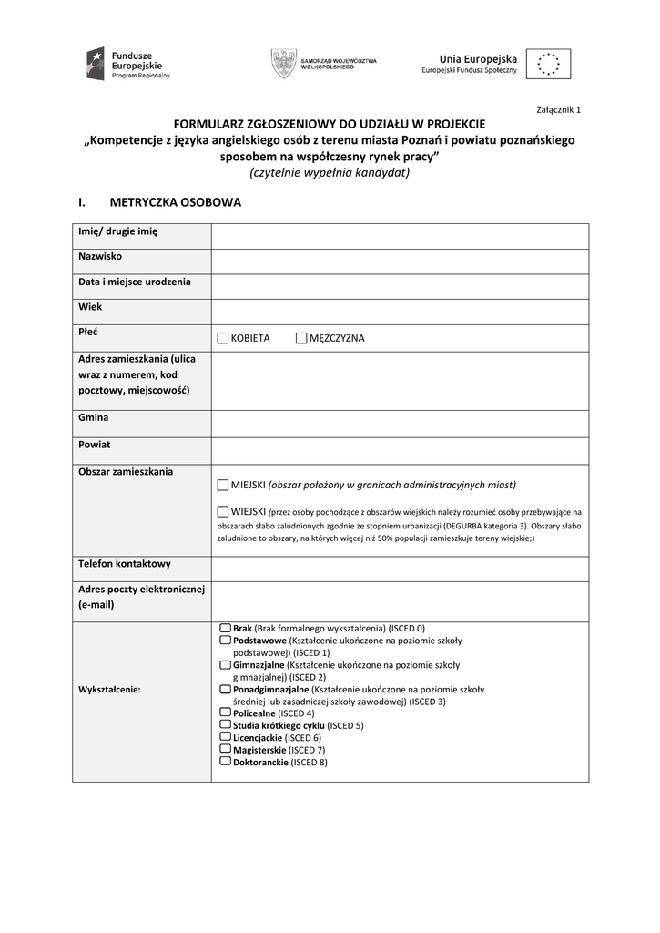 Załącznik 1 FORMULARZ ZGŁOSZENIOWY DO UDZIAŁU W PROJEKCIE „Kompetencje z języka angielskiego osób z terenu miasta Poznań i powiatu poznańskiego sposobem na współczesny rynek pracy” (czytelnie wypełnia kandydat) I. METRYCZKA OSOBOWA Imię/ drugie imię Nazwisko Data i miejsce urodzenia Wiek Płeć KOBIETA MĘŻCZYZNA Adres zamieszkania (ulica wraz z numerem, kod pocztowy, miejscowość) Gmina Powiat Obszar zamieszkania MIEJSKI (obszar położony w granicach administracyjnych miast) WIEJSKI (przez osoby pochodzące z obszarów wiejskich należy rozumieć osoby przebywające na obszarach słabo zaludnionych zgodnie ze stopniem urbanizacji (DEGURBA kategoria 3). Obszary słabo zaludnione to obszary, na których więcej niż 50% populacji zamieszkuje tereny wiejskie;) Telefon kontaktowy Adres poczty elektronicznej (e-mail) Wykształcenie: Brak (Brak formalnego wykształcenia) (ISCED 0) Podstawowe (Kształcenie ukończone na poziomie szkoły podstawowej) (ISCED 1) Gimnazjalne (Kształcenie ukończone na poziomie szkoły gimnazjalnej) (ISCED 2) Ponadgimnazjalne (Kształcenie ukończone na poziomie szkoły średniej lub zasadniczej szkoły zawodowej) (ISCED 3) Policealne (ISCED 4) Studia krótkiego cyklu (ISCED 5) Licencjackie (ISCED 6) Magisterskie (ISCED 7) Doktoranckie (ISCED 8) II. OŚWIADCZENIE DOTYCZĄCE KRYTERIÓW UCZESTNICTWA W PROJEKCIE 1. Oświadczam, że jestem osobą w wieku: 25 – 49 lat lub 50 - 64 lat lub 65 i więcej 2. 3. Jestem osobą bierną zawodowo - osoby, które w danej chwili nie tworzą zasobów siły roboczej (tzn. nie pracują i nie są bezrobotne). Studenci studiów stacjonarnych są uznawani za osoby bierne zawodowo. Osoby będące na urlopie wychowawczym (rozumianym jako nieobecność w pracy, spowodowana opieką nad dzieckiem w okresie, który nie mieści się w ramach urlopu macierzyńskiego lub urlopu rodzicielskiego), są uznawane za bierne zawodowo, chyba że są zarejestrowane już jako bezrobotne (wówczas status bezrobotnego ma pierwszeństwo). Osoby prowadzące działalność na własny rachunek (w tym członek rodziny bezpłatnie pomagający osobie prowadzącej działalność) nie są uznawane za bierne zawodowo. Studenci studiów stacjonarnych uznawani są za osoby bierne zawodowo. Jestem osobą bezrobotną - Osoby pozostające bez pracy, gotowe do podjęcia pracy i aktywnie poszukujące zatrudnienia. Definicja uwzględnia osoby zarejestrowane jako bezrobotne zgodnie z krajowymi przepisami, nawet jeżeli nie spełniają one wszystkich trzech kryteriów. Osobami bezrobotnymi są zarówno osoby bezrobotne w rozumieniu badania aktywności ekonomicznej ludności (BEAL), jak i osoby zarejestrowane jako bezrobotne. Definicja nie uwzględnia studentów studiów stacjonarnych, nawet jeśli spełniają powyższe kryteria. Osoby kwalifikujące się do urlopu macierzyńskiego lub rodzicielskiego, które są bezrobotne w rozumieniu niniejszej definicji (nie pobierają świadczeń z tytułu urlopu), są również osobami bezrobotnymi w rozumieniu Wytycznych w zakresie realizacji przedsięwzięć z udziałem środków EFS w obszarze rynku pracy na lata 2014-2020. TAK TAK TAK NIE NIE NIE TAK NIE TAK NIE TAK TAK NIE NIE TAK TAK NIE NIE w tym: jestem osobą bezrobotną zarejestrowaną w urzędzie pracy: w tym długotrwale bezrobotną*: (Jeżeli odpowiedź jest twierdząca należy dołączyć kopię decyzji lub zaświadczenie z Urzędu Pracy, potwierdzoną „za zgodność z oryginałem” wraz z podpisem). lub jestem osobą bezrobotną niezarejestrowaną w urzędzie pracy w tym długotrwale bezrobotna* * Osoby długotrwale bezrobotne, rozróżnienie w zależności od wieku:: Młodzież (<25 lat) – osoby bezrobotne nieprzerwanie przez okres ponad 6 miesięcy (>6 miesięcy). Dorośli (25 lat lub więcej) – osoby bezrobotne nieprzerwanie przez okres ponad 12 miesięcy (>12 miesięcy). 4. Jestem osobą pracującą – Pracujący to osoby w wieku 15 lat i więcej, które wykonują pracę, za którą otrzymują wynagrodzenie, z której czerpią zyski lub korzyści rodzinne lub osoby posiadające zatrudnienie lub własną działalność, które jednak chwilowo nie pracowały ze względu na np. chorobę, urlop, spór pracowniczy czy kształcenie się lub szkolenie .Osoby prowadzące działalność na własny rachunek – prowadzące działalność gospodarczą, gospodarstwo rolne lub praktykę zawodową- są również uznawane za pracujących, o ile spełniony jest jeden z poniższych warunków:1) Osoba pracuje w swojej działalności, praktyce zawodowej lub gospodarstwie rolnym w celu uzyskania dochodu, nawet jeżeli przedsiębiorstwo nie osiąga zysków; 2) Osoba poświęca czas na prowadzenie działalności gospodarczej, praktyki TAK NIE zawodowej czy gospodarstwa rolnego, nawet jeżeli nie zrealizowano żadnej sprzedaży lub usług i nic nie wyprodukowano (na przykład: rolnik wykonujący prace w celu utrzymania swojego gospodarstwa; architekt spędzający czas w oczekiwaniu na klientów w swoim biurze; rybak naprawiający łódkę czy siatki rybackie, aby móc dalej pracować; osoby uczestniczące w konwencjach lub seminariach); 3) Osoba jest w trakcie zakładania działalności gospodarczej, gospodarstwa rolnego lub praktyki zawodowej; zalicza się do tego zakup lub instalację sprzętu, zamawianie towarów w ramach przygotowań do uruchomienia działalności. Bezpłatnie pomagający członek rodziny uznawany jest za osobę pracującą jeżeli wykonywaną przez siebie pracą wnosi bezpośredni wkład w działalność gospodarczą, gospodarstwo rolne lub praktykę zawodową będącą w posiadaniu lub prowadzoną przez spokrewnionego członka tego samego gospodarstwa domowego. 3. Oświadczam, że zamieszkuję zgodnie z KC na terenie: miasta Poznań lub powiatu poznańskiego. TAK 4. Oświadczam, że jestem osobą z niepełnosprawnością. TAK (Jeżeli odpowiedź jest twierdząca należy dołączyć kopię dokumenty potwierdzającego niepełnosprawność, po
