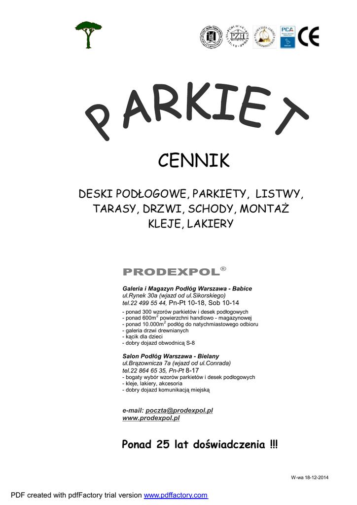CENNIK DESKI PODŁOGOWE, PARKIETY, LISTWY, TARASY, DRZWI, SCHODY, MONTAŻ KLEJE, LAKIERY PRODEXPOL® Galeria i Magazyn Podłóg Warszawa - Babice ul.Rynek 30a (wjazd od ul.Sikorskiego) tel.22 499 55 44, Pn-Pt 10-18, Sob 10-14 - ponad 300 wzorów parkietów i desek podłogowych 2 - ponad 600m powierzchni handlowo - magazynowej 2 - ponad 10.000m podłóg do natychmiastowego odbioru - galeria drzwi drewnianych - kącik dla dzieci - dobry dojazd obwodnicą S-8 Salon Podłóg Warszawa - Bielany ul.Brązownicza 7a (wjazd od ul.Conrada) tel.22 864 65 35, Pn-Pt 8-17 - bogaty wybór wzorów parkietów i desek podłogowych - kleje, lakiery, akcesoria - dobry dojazd komunikacją miejską e-mail: [email protected] www.prodexpol.pl U naUaaa Ponad 25 lat doświadczenia !!! W-wa 18-12-2014 PDF created with pdfFactory trial version www.pdffactory.com PARKIET KRAJOWY Ceny netto PLN/m2 (VAT 8%) Gatunek / Rozmiar (size) Surowy Natur Rustikal Lakier / Olej Natur Rustikal Dąb naturalny (oak) Parkiet Parkiet Parkiet Parkiet Parkiet Parkiet 15x70x350 15x70x500 15x70x500 bielasty 22x70x400 R-350 22x70x500 22x70x500 bielasty 79 89 79 69 99 89 109 95 75 59 65 69 75 - 115 - 79 89 105 - 39 45 51 59 63 29 35 - - - - - 89 49 115 195 79 109 175 145 125 99 89 - 125 - 123 105 179 99 - 89 95 99 105 85 37 - 85 89 31 - 85 119 69 109 119 49 - - 95 129 - 129 79 59 - - 125 - 69 25 85 35 - 79 39 95 45 - Mozaika kwadraty 8x23x160 Mozaika wzór angielski 8x23x160 Przemysłowy 10x8x160 Przemysłowy 16x20x250 Przemysłowy 23x8x160 Parkiet warstwowy 11x70x490 mix ☼ SUPER OFERTA Parkiet warstwowy 14x70x490 J Jodła francuska warstwowy 14x70x450 J Dąb wędzony (oak smoked) Parkiet 22x70x500 Parkiet 15x70x300-500 mix P Przemysłowy 23x8x160 J Parkiet warstwowy 11x70x490 K Parkiet warstwowy 14x70x490 J ☼ Jesion naturalny (ash) Parkiet 15x70x350 Parkiet 15x70x500 Parkiet 22x70x350 Parkiet 22x70x500 SUPER OFERTA Mozaika kwadraty 8x20x160 Parkiet warstwowy 11x70x490 K Parkiet warstwowy 14x70x490 J ☼ - Jesion biały (ash white) Parkiet 15x70x350 Parkiet 22x70x350 Mozaika kwadraty 8x20x160 Parkiet warstwowy 11x70x490 K ☼ Parkiet warstwowy 14x70x490 J Jesion bursztyn (ash thermo) Parkiet 22x70x500 Przemysłowy 8x10x160 (50m) Parkiet warstwowy 14x70x490 B/K J Wyprzedaż końcówek serii Parkiet warstwowy 11x70x490 mix SUPER OFERTA Parkiet warstwowy 13x70x490 mix SUPER OFERTA Dąb wanilia, Dąb czarny, Dąb czerwony, Jesion afromosia, Jesion iroco, Jesion wenge, Jesion termo, Buk, Orzech, Merbau, Klon ● Promocje obowiązują do wyczerpania zapasów magazynowych ● Podłogi z oznaczeniem „☼” polecane są na ogrzewanie podłogowe PRODEXPOL ® Infolinia 22 499 55 44, 864 65 35, www.prodexpol.pl PDF created with pdfFactory trial version www.pdffactory.com W-wa 07-11-2014 - DESKA PODŁOGOWA Ceny netto PLN/m2 (VAT 8%) Surowy Natur Rustikal Gatunek / Rozmiar (size) Lakier / Olej Natur Rustikal Dąb naturalny (oak) Deska lita 15x90x300-1200 Deska lita 15x120/130x300-1500 Deska lita 15x150x600-2000 K Deska lita 21x120x500-2000 K Deska lita 21x150x500-2000 K 109 99 135 129 139 159 165 85 105 99 105 119 125 129 145 159 195 199 109 119 129 155 159 - - 119 135 165 169 99 125 149 155 219 - 193 - - 349 Deska warstwowa 11x100x700-1000 P ☼ Deska warstwowa 11x150x1000-1400 K ☼ Deska warstwowa 14x130/140x900-1200 Fertig Deska warstwowa 15x190x1600-2000 K Jodła francuska 15x90x580-980 D Deska krzywoliniowa 21x140-280x1700-3000 Dąb barwiony (stained oak) Kolekcja Classic - Bielony, Miodowy, Antyk-ol Deska lita 15x90x300-1000 Deska lita 15x120x300-1200 bez B - - 145 159 129 139 - - 165 175 189 219 149 165 199 - - 155 175 189 199 135 145 165 175 - - 185 195 145 155 Kolekcja Fertig - 10 kolorów Deska warstwowa 11x130/140x900-1200 Bielony Deska warstwowa 14x130/140x900-1200 Bielony Deska warstw. 14x130/140x900-1200 Color Inspiration-ol Deska warstwowa 15x180/200x1800-220 Luxury-ol Kolekcja muzyczna - 15 kolorów Deska lita 15x90x300-1000 Deska lita 15x120x300-1000 Deska warstwowa 15x135x500-1500 Deska warstwowa 15x160/180x1400-2200 Kolekcja Exoline - 10 kolorów (olej) Deska warstwowa 15x160x1600-2200 Deska warstwowa 15x180x1600-2200 Dąb wędzony (oak smoked) Deska lita 15x90x300-1000 mix P Deska lita 15x120/130x500-1500 mix P Deska warstwowa 11x120x1000-1400 K Deska warstwowa 14x130/140x900-1200 J 145 149 - - 169 175 139 195 - 129 119 145 155 - 105 119 129 - 149 175 185 139 149 169 125 149 159 - 149 169 - - 175 195 155 - Jesion naturalny (ash) Deska lita 15x120x500-1500 K Deska lita 21x120x500-2000 K Deska lita 21x150x500-2000 K Deska warstwowa 14x130/140x900-1200 J Deska warstwowa 14x130/140x900-1200 Bielony J Deska warstwowa 14x130/140x900-1200 Biały Naturalny J Jesion bursztyn (ash thermo) Deska lita 15x90x300-1200 OL D Deska lita 15x120x300-1500 OL D Deska warstwowa 14x130/140x900-1200 J ● Usługi dodatkowe: fazowanie +10zł, szczotkowanie +10zł, jedna długość +10% ● Promocje obowiązują do wyczerpania zapasów magazynowych ● Podłogi z oznaczeniem „☼” polecane są na ogrzewanie podłogowe PRODEXPOL ® tel. 22 499 55 44, 864 65 35, www.prodexpol.pl PDF created with pdfFactory trial version www.pdffactory.com W-wa 18-12-2014 PODŁOGI EGZOTYCZNE Ceny netto PLN/m2 (VAT 8%) Gatunek / Rozmiar Surowy Natur Lakierowany Selekt Natur Selekt Afromosia Deska 15x90x300-1200 Deska 15x120x600-1500 199 219 249 259 - 305 319 - - - 115 115 99 179 189 179 209 219 199 225 - 255 275 239 135 145 89 175 179 - - 215 225 165 - 250 175 - 89 - - 75 189 - - 239 - 65 79 55/59 115 135 - 79 - 115 119/139 155 - 113 189 209 219 209 77 149 249 289 319 259 - 239 249 239 269 199 - 195 269 309 339 - 85 209 189 225 - - 225 243 - 75 65 169/159 179/169 - - 199/185 215/195 - 145 199/139 199/239 85 - - 219 249 - Bambus Deska prasowany 14x120x900 D Deska prasowany 14x130x1800 E Doussie Deska 15x90x400-1000 E Deska 16x120x400-1400 Iroco Deska 14x90x500-1000 E Deska 14x120x500-1000 Przemysłowy 14x10x280 Ipe / Lapacho Deska 15x130x300-900 SUPER OFERTA !!! Przemy