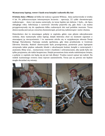 Wymarzony laptop, rower i kask oraz książki i zabawki dla Ani 8-letnia Ania z Mławy od kilku lat walczy z guzem Wilmsa. Ania zachorowała w wieku 4 lat. Po półtorarocznym intensywnym leczeniu - operacja, 22 cykle chemioterapii, radioterapie - Ania i jej mama uwierzyły, że teraz będzie już dobrze. I było… do lipca ubiegłego roku. Informacja o nawrocie choroby pojawiła się, gdy Ania i jej mama przygotowywały się do spędzenia kilku cudownych dni nad polskim morzem. Teraz dziewczynka jest już po czwartej chemioterapii, przed nią radioterapie i znów chemia. Dzieciństwo Ani to nieustające pobyty w szpitalu, gdzie czas płynie zdecydowanie wolniej. Ania wymarzyła sobie laptop, dzięki któremu choć na moment zapomni o otaczającej ją rzeczywistości. I to marzenie ziściło się w wyjątkowym okresie Świąt Bożego Narodzenia. Fantazja została spełniona, gdy Ania przebywała w Centrum Zdrowia Dziecka. Radość dziewczynki była przeogromna, ponieważ poza laptopem otrzymała także piękne zabawki, bluzki z ukochanymi końmi, książki o zwierzętach i anatomii, filmy oraz… wymarzony rower z kaskiem i ochraniaczami, aby jazda była nie tylko przyjemna, ale także bezpieczna. Dzięki prezentom Ania miała radośniejsze święta, a pobyty w szpitalu nie będą się jej już tak dłużyć. Trudno nawet opisać jej radość. Na widok wyśnionego roweru Ania wprost zaniemówiła. Teraz już na pewno nie będzie mogła doczekać się wiosny. Za spełnienie fantazji Ani z całego serca dziękujemy: • Multischool - Międzynarodowej Szkole Podstawowej i Gimnazjum w Warszawie za ufundowanie roweru, kasku i ochraniaczy, a także przekazanie pieniędzy na pokrycie części kosztów kolejnego marzenia Ani – wakacje nad morzem lub lot samolotem z rodziną ☺ Jak tylko poprawi się stan zdrowia dziewczynki i dostanie zgodę od lekarzy na upragniony wyjazd. • Firmie Acer Poland Sp. z o.o. za przekazanie laptopa • Pracownikom Raiffeisen Polbank za przygotowanie paczki niespodzianki • Firmie Koleje Mazowieckie za ufundowanie pięknych zabawek, filmów i gier • Firmie Bikeman za udzielenie cudownego rabatu na zakup roweru • Firmie Tarsago Polska Sp. z o.o. za przekazanie książek • CAT Logistic Polska Sp. z o.o. firmie, która nigdy nie odmawia nam pomocy, dziękujemy za bezpłatny transport roweru