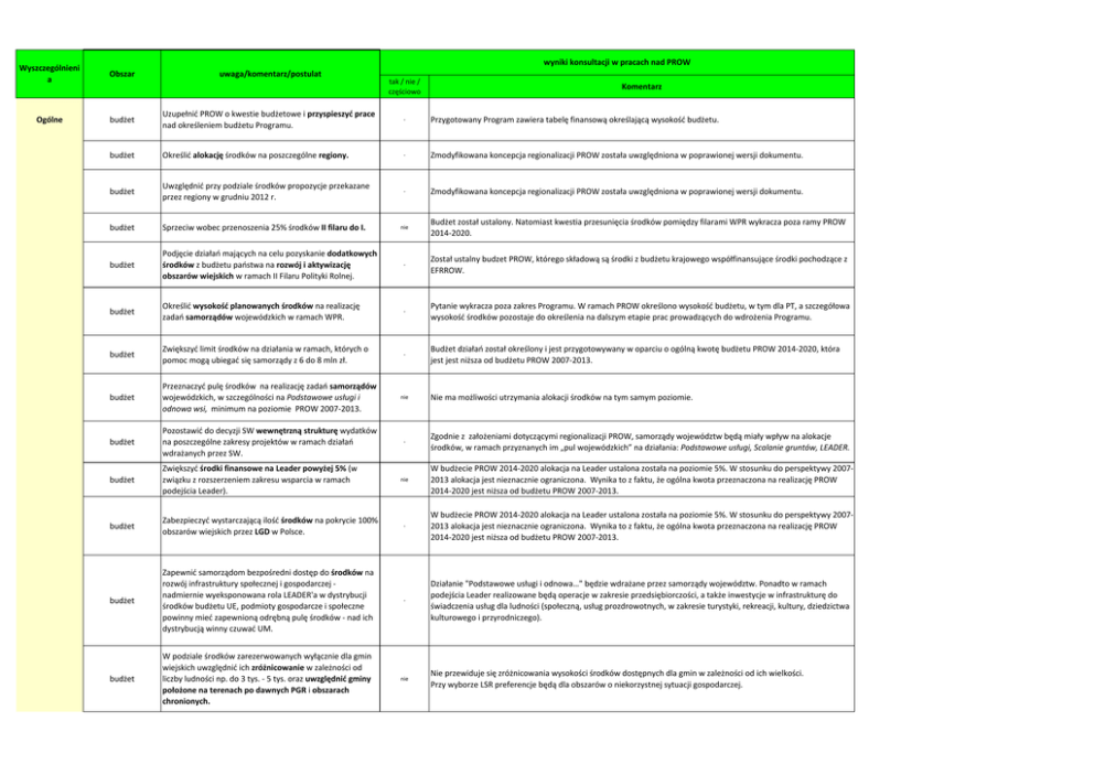 wyniki konsultacji w pracach nad PROW Wyszczególnieni a Obszar Ogólne budżet Uzupełnić PROW o kwestie budżetowe i przyspieszyć prace nad określeniem budżetu Programu. - Przygotowany Program zawiera tabelę finansową określającą wysokość budżetu. budżet Określić alokację środków na poszczególne regiony. - Zmodyfikowana koncepcja regionalizacji PROW została uwzględniona w poprawionej wersji dokumentu. budżet Uwzględnić przy podziale środków propozycje przekazane przez regiony w grudniu 2012 r. - Zmodyfikowana koncepcja regionalizacji PROW została uwzględniona w poprawionej wersji dokumentu. budżet Sprzeciw wobec przenoszenia 25% środków II filaru do I. uwaga/komentarz/postulat tak / nie / częściowo Komentarz nie Budżet został ustalony. Natomiast kwestia przesunięcia środków pomiędzy filarami WPR wykracza poza ramy PROW 2014-2020. budżet Podjęcie działań mających na celu pozyskanie dodatkowych środków z budżetu państwa na rozwój i aktywizację obszarów wiejskich w ramach II Filaru Polityki Rolnej. - Został ustalny budzet PROW, którego składową są środki z budżetu krajowego współfinansujące środki pochodzące z EFRROW. budżet Określić wysokość planowanych środków na realizację zadań samorządów wojewódzkich w ramach WPR. - Pytanie wykracza poza zakres Programu. W ramach PROW określono wysokość budżetu, w tym dla PT, a szczegółowa wysokość środków pozostaje do określenia na dalszym etapie prac prowadzących do wdrożenia Programu. budżet Zwiększyć limit środków na działania w ramach, których o pomoc mogą ubiegać się samorządy z 6 do 8 mln zł. - Budżet działań został określony i jest przygotowywany w oparciu o ogólną kwotę budżetu PROW 2014-2020, która jest jest niższa od budżetu PROW 2007-2013. budżet Przeznaczyć pulę środków na realizację zadań samorządów wojewódzkich, w szczególności na Podstawowe usługi i odnowa wsi, minimum na poziomie PROW 2007-2013. nie budżet Pozostawić do decyzji SW wewnętrzną strukturę wydatków na poszczególne zakresy projektów w ramach działań wdrażanych przez SW. - budżet Zwiększyć środki finansowe na Leader powyżej 5% (w związku z rozszerzeniem zakresu wsparcia w ramach podejścia Leader). budżet Zabezpieczyć wystarczającą ilość środków na pokrycie 100% obszarów wiejskich przez LGD w Polsce. Nie ma możliwości utrzymania alokacji środków na tym samym poziomie. Zgodnie z założeniami dotyczącymi regionalizacji PROW, samorządy województw będą miały wpływ na alokacje środków, w ramach przyznanych im „pul wojewódzkich” na działania: Podstawowe usługi, Scalanie gruntów, LEADER. nie W budżecie PROW 2014-2020 alokacja na Leader ustalona została na poziomie 5%. W stosunku do perspektywy 20072013 alokacja jest nieznacznie ograniczona. Wynika to z faktu, że ogólna kwota przeznaczona na realizację PROW 2014-2020 jest niższa od budżetu PROW 2007-2013. - W budżecie PROW 2014-2020 alokacja na Leader ustalona została na poziomie 5%. W stosunku do perspektywy 20072013 alokacja jest nieznacznie ograniczona. Wynika to z faktu, że ogólna kwota przeznaczona na realizację PROW 2014-2020 jest niższa od budżetu PROW 2007-2013. budżet Zapewnić samorządom bezpośredni dostęp do środków na rozwój infrastruktury społecznej i gospodarczej nadmiernie wyeksponowana rola LEADER'a w dystrybucji środków budżetu UE, podmioty gospodarcze i społeczne powinny mieć zapewnioną odrębną pulę środków - nad ich dystrybucją winny czuwać UM. - Działanie "Podstawowe usługi i odnowa…" będzie wdrażane przez samorządy województw. Ponadto w ramach podejścia Leader realizowane będą operacje w zakresie przedsiębiorczości, a także inwestycje w infrastrukturę do świadczenia usług dla ludności (społeczną, usług prozdrowotnych, w zakresie turystyki, rekreacji, kultury, dziedzictwa kulturowego i przyrodniczego). budżet W podziale środków zarezerwowanych wyłącznie dla gmin wiejskich uwzględnić ich zróżnicowanie w zależności od liczby ludności np. do 3 tys. - 5 tys. oraz uwzględnić gminy położone na terenach po dawnych PGR i obszarach chronionych. nie Nie przewiduje się zróżnicowania wysokości środków dostępnych dla gmin w zależności od ich wielkości. Przy wyborze LSR preferencje będą dla obszarów o niekorzystnej sytuacji gospodarczej. budżet Odrębna alokacja środków w regionalnych oraz krajowych w programach operacyjnych dostępna wyłącznie dla gmin wiejskich na realizację składanych przez nie wniosków w wysokości nie mniejszej niż 25%. - nie dotyczy PROW nie Transfer wiedzy i innowacyjność stanowią warunek rozwoju nowoczesnego sektora rolno - żywnościowego. Innowacyjność, klimat i środowisko są celami przekrojowymi UE, w zw. z tym kwestie te muszą być uwzględnione w PROW 2014-2020, a zapewnienie ich realizacji można uzyskać m.in. dzięki działaniu Transfer wiedzy, które jest działaniem horyzontalnym. budżet Zapisać, że budżety poszczególnych województw, określanie kryteriów dostępu i grupy docelowej odbiorców, wybór działań powinien być konsultowany przez Samorząd Województwa z instytucjami działającymi na rzecz rozwoju rolnictwa i obszarów wiejskich w regionie (między innymi z ośrodkami doradztwa rolniczego i izbami rolniczymi). tak Program jest konsultowany w ramach prowadzonych konsultacj online m.in. z samorządem terytorialnym. W Programie opracowany będzie system i przebieg konsultacji społecznych Programu zgodnie z przepisami unijnymi. W dotychczasowe konsultacje włączone są wszystkie wymienione podmioty. Duża część uwag zgłaszanych podczas 2 etapów konsuktacj Programu pochodzila od samorządów. budżet Określić zasady i mechanizmy alokacji środków finansowych uwzględniających zróżnicowanie regionalne i odmienne potencjały rozwojowe województw. tak Zmodyfikowana koncepcja regionalizacji PROW 