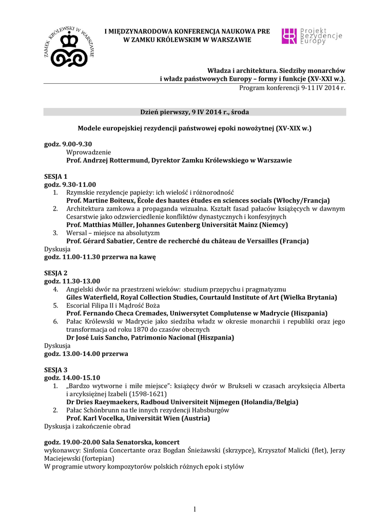I MIĘDZYNARODOWA KONFERENCJA NAUKOWA PRE W ZAMKU KRÓLEWSKIM W WARSZAWIE Władza i architektura. Siedziby monarchów i władz państwowych Europy – formy i funkcje (XV-XXI w.). Program konferencji 9-11 IV 2014 r. Dzień pierwszy, 9 IV 2014 r., środa Modele europejskiej rezydencji państwowej epoki nowożytnej (XV-XIX w.) godz. 9.00-9.30 Wprowadzenie Prof. Andrzej Rottermund, Dyrektor Zamku Królewskiego w Warszawie SESJA 1 godz. 9.30-11.00 1. Rzymskie rezydencje papieży: ich wielość i różnorodność Prof. Martine Boiteux, École des hautes études en sciences socials (Włochy/Francja) 2. Architektura zamkowa a propaganda wizualna. Kształt fasad pałaców książęcych w dawnym Cesarstwie jako odzwierciedlenie konfliktów dynastycznych i konfesyjnych Prof. Matthias Müller, Johannes Gutenberg Universität Mainz (Niemcy) 3. Wersal – miejsce na absolutyzm Prof. Gérard Sabatier, Centre de recherché du château de Versailles (Francja) Dyskusja godz. 11.00-11.30 przerwa na kawę SESJA 2 godz. 11.30-13.00 4. Angielski dwór na przestrzeni wieków: studium przepychu i pragmatyzmu Giles Waterfield, Royal Collection Studies, Courtauld Institute of Art (Wielka Brytania) 5. Escorial Filipa II i Mądrość Boża Prof. Fernando Checa Cremades, Uniwersytet Complutense w Madrycie (Hiszpania) 6. Pałac Królewski w Madrycie jako siedziba władz w okresie monarchii i republiki oraz jego transformacja od roku 1870 do czasów obecnych Dr José Luis Sancho, Patrimonio Nacional (Hiszpania) Dyskusja godz. 13.00-14.00 przerwa SESJA 3 godz. 14.00-15.10 1. „Bardzo wytworne i miłe miejsce”: książęcy dwór w Brukseli w czasach arcyksięcia Alberta i arcyksiężnej Izabeli (1598-1621) Dr Dries Raeymaekers, Radboud Universiteit Nijmegen (Holandia/Belgia) 2. Pałac Schönbrunn na tle innych rezydencji Habsburgów Prof. Karl Vocelka, Universität Wien (Austria) Dyskusja i zakończenie obrad godz. 19.00-20.00 Sala Senatorska, koncert wykonawcy: Sinfonia Concertante oraz Bogdan Śnieżawski (skrzypce), Krzysztof Malicki (flet), Jerzy Maciejewski (fortepian) W programie utwory kompozytorów polskich różnych epok i stylów 1 Dzień drugi, 10 IV 2014 r. czwartek Modele europejskiej rezydencji państwowej epoki nowożytnej (XV-XIX w.) SESJA 4 godz. 9.00-10.30 1. Kreml Moskiewski: rezydencja, twierdza, czy przykład „Zakazanego Miasta” wschodniego imperium? Prof. Aleksandr Ławrentiew, Moskovskij Gosudarstviennyj XudožestviennoPromyšliennyj Univiersitiet imieni S.G.Stroganova (Rosja) 2. Zamek Królewski w Budzie – symbol węgierskiej tożsamości narodowej Prof. György Kelényi, Eötvös Loránd Tudományegyetem [Uniwersytet Loránda Eötvösa w Budapeszcie] (Węgry) 3. Budując imperium: pałac królewski w Szwecji Dr Fabian Persson, Linnéuniversitetet (Szwecja) Dyskusja godz. 10.30-11.00 przerwa na kawę SESJA 5 godz. 11.00-12.50 Rezydencje i centra państwowe Rzeczypospolitej. Od średniowiecza po nowożytność. 4. Przemiany królewskiej rezydencji na Wawelu na przełomie średniowiecza i nowożytności Prof. Stanisław Mossakowski, Polska Akademia Nauk (Polska) 5. Rezydencje monarsze w stołecznym Wilnie oraz w innych miastach Wielkiego Księstwa Litewskiego Dr Vytautas Dolinskas, Nacionalinis Muziejus Lietuvos Didžiosios Kunigaikštystės Valdovų Rūmai [Muzeum Narodowe Zamek Wielkich Książąt Litewskich w Wilnie] (Litwa) 6. Centra parlamentarne i samorządowe Polski i Litwy Prof. J. Choińska-Mika, Uniwersytet Warszawski (Polska) 7. Warszawski gród i zamek; architektura i archeologia Agnieszka Bocheńska, Zamek Królewski w Warszawie (Polska) Dyskusja godz. 12.50-13.50 przerwa SESJA 6 godz. 13.50-15.40 8. Nowe państwo, nowe centrum, nowa architektura. Problemy awansu Warszawy i Zamku w XVI i XVII w. Marek Wrede, Zamek Królewski w Warszawie (Polska) 9. Prestiż elekcyjnej monarchii czy dynastii Wazów? Warszawski kompleks rezydencjonalny (Zamek, Ujazdów, Villa Regia, Nieporęt) Prof. Juliusz Chrościcki, Uniwersytet Papieski im. Jana Pawła II w Krakowie (Polska) 10. Interdyscyplinarne badania dna Wisły i ich znaczenie dla odtworzenia wyglądu warszawskich rezydencji monarszych z okresu panowania dynastii Wazów Dr Hubert Kowalski, Uniwersytet Warszawski (Polska) 11. Rezydencja wilanowska – Monumentum Sobiescianum Konrad Pyzel, Muzeum Pałacu Króla Jana III w Wilanowie (Polska) Dyskusja i zakończenie obrad 2 Dzień trzeci, 11 IV 2014, piątek Aspiracje, splendor i przyjemność – o rezydencjach inaczej. SESJA 7 godz. 9.00-11.00 1. Letnia rezydencja Jana III Sobieskiego w Kukizowie – formy i funkcje Prof. Mykola Bevz, Nacionalnyj Universytet Lvivska Politechnika (Ukraina) 2. Pałac Snów: Lunéville i królewskie aspiracje książąt Lotaryngii od Leopolda do Stanisława Leszczyńskiego dr Jonathan Sprangler, Manchester Metropolitan University (Wielka Brytania) 3. Pałac Łazienkowski i republika marzeń Stanisława Augusta Dr Emilia Olechnowicz, Muzeum Łazienki Królewskie w Warszawie (Polska) 4. Zamek myśliwski – formowanie się nowego typu rezydencji monarszej. Geneza – specyfika – odmienności Prof. Tadeusz Żuchowski, Uniwersytet Adama Mickiewicza w Poznaniu (Polska) Dyskusja godz. 11.00-11.30 przerwa na kawę SESJA 8 godz. 11.30-13.00 Rezydencje królewskie XIX-XXI w. – zmiany funkcji. 5. Między Zamkiem, Belwederem a Pałacem Namiestnikowskim. Władza i reprezentacja Prof. Małgorzata Karpińska, Instytut Historii Uniwersytetu Warszawskiego (Polska) 6. Między muzeum a rezydencją. Zamek Królewski w II Rzeczypospolitej Prof. Waldemar Baraniewski, Akademia Sztuk Pięknych w Warszawie (Polska) 7. Zamek Królewski w Warszawie: zniszczenie i odbudowa Dr hab. Piotr Majewski, Narodowy Instytutu Muzealnictwa i Ochrony Zbiorów (Polska) Dyskusja godz. 13.00-14.00 przerwa PANEL godz. 14.00-15.30 8. Panel dyskusyjny na temat współczesnych funkcji historycznych centrów władzy z udziałem dyrektorów muzeów rezydencji 9. Podsumowanie obrad – sformułowanie r