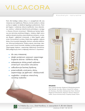 VILCACORA Kosmetyki naturalne Krem dla każdego rodzaju skóry, a w szczególności dla cery mieszanej oraz trądzikowej. Polecany również osobom o skórze suchej ze względu na działanie łagodzące podrażnienia. Krem jest bogaty w substancje aktywne (polifenole, kwas oleanolowy, ursolowy i substancje katechinowe) pochodzące z wyciągu z vilcacory (Uncaria tomentosa). Odbudowuje barierę lipidową oraz stymuluje produkcję kolagenu i elastyny, dzięki czemu opóźnia starzenie się skóry, przeciwdziała jej wiotczeniu, zmniejsza długość i głębokość zmarszczek, a także łagodzi wpływ zmian hormonalnych na skórę. Masło shea wygładza i odżywia skórę, chroni ją przed niepogodą i słońcem, pobudza zabliźnianie i eliminuje podrażnienia. Proteiny sojowe, stymulując intensywny wzrost nowych komórek, działają na skórę regenerująco. Wspomagają krążenie i poprawiają oddychanie komórkowe. Efekt pielęgnacyjny kremu zwiększają witamina E i d-pantenol. do cery mieszanej dzięki proteinom sojowym wspomaga krążenie skórne i dotlenia skórę zabezpiecza skórę przed wpływem zmiennych warunków otoczenia odbudowuje barierę lipidową przeciwdziała wiotczeniu skóry, zapewniając jej jędrność i elastyczność wygładza i zmiękcza wierzchnią warstwę naskórka Składniki: Aqua, Isopropyl Myristate, Polyglyceryl-2-Dipolyhydroxystearate, Octyl Palmitate, Cera Alba, Glycerin, Mineral Oil, Sunflower Oil, Petrolatum, Shea Butter, Hydrolyzed Soy Protein, Panthenol, Polyglyceryl-3-Diisostearate, Magnesium Stearate, Magnesium Sulfate, Uncaria tomentosa Extract, Tocopheryl Acetate, Parfum. A-Z Medica Sp. z o.o., Dział Handlowy: ul. Leszczyńskich 9, 80-464 Gdańsk www.azmedica.pl infolinia 0 801 30 30 39