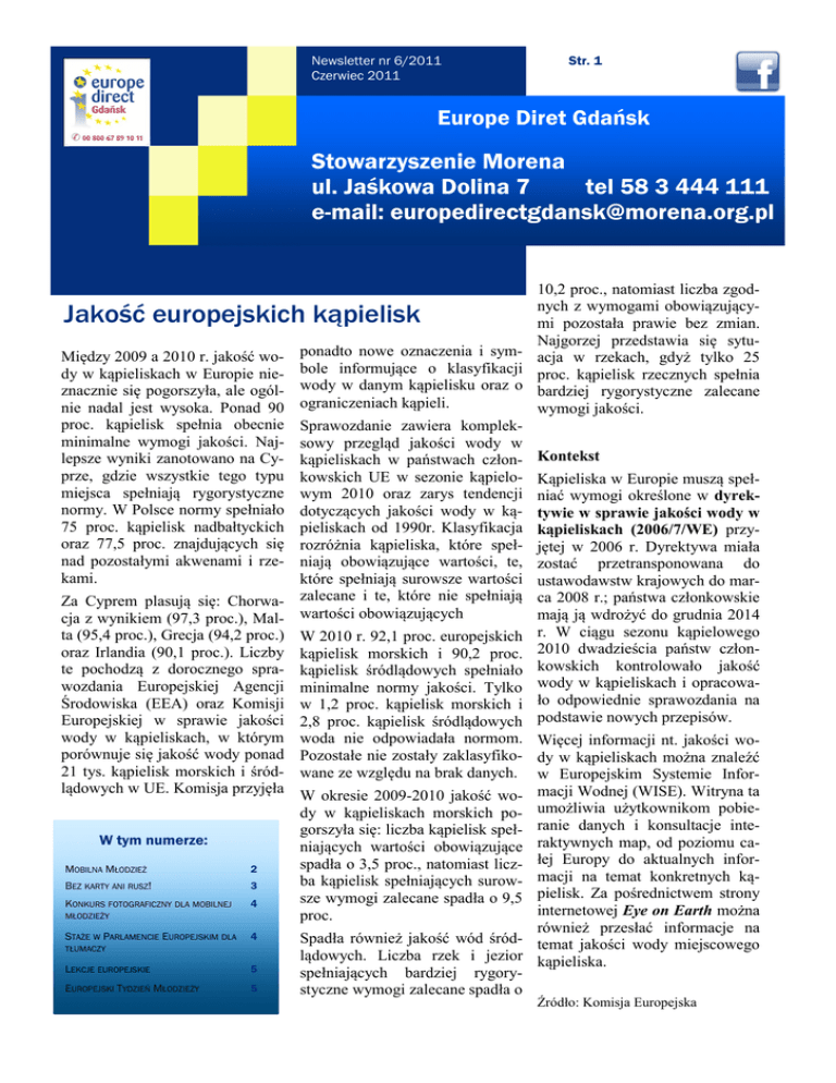 Newsletter nr 6/2011 Czerwiec 2011 Str. 1 Europe Diret Gdańsk Stowarzyszenie Morena ul. Jaśkowa Dolina 7 tel 58 3 444 111 e-mail: [email protected] 10,2 proc., natomiast liczba zgodnych z wymogami obowiązującymi pozostała prawie bez zmian. Najgorzej przedstawia się sytuMiędzy 2009 a 2010 r. jakość wo- ponadto nowe oznaczenia i sym- acja w rzekach, gdyż tylko 25 dy w kąpieliskach w Europie nie- bole informujące o klasyfikacji proc. kąpielisk rzecznych spełnia znacznie się pogorszyła, ale ogól- wody w danym kąpielisku oraz o bardziej rygorystyczne zalecane nie nadal jest wysoka. Ponad 90 ograniczeniach kąpieli. wymogi jakości. proc. kąpielisk spełnia obecnie Sprawozdanie zawiera komplekminimalne wymogi jakości. Naj- sowy przegląd jakości wody w lepsze wyniki zanotowano na Cy- kąpieliskach w państwach człon- Kontekst prze, gdzie wszystkie tego typu kowskich UE w sezonie kąpielo- Kąpieliska w Europie muszą spełmiejsca spełniają rygorystyczne wym 2010 oraz zarys tendencji niać wymogi określone w dyreknormy. W Polsce normy spełniało dotyczących jakości wody w ką- tywie w sprawie jakości wody w 75 proc. kąpielisk nadbałtyckich pieliskach od 1990r. Klasyfikacja kąpieliskach (2006/7/WE) przyoraz 77,5 proc. znajdujących się rozróżnia kąpieliska, które speł- jętej w 2006 r. Dyrektywa miała nad pozostałymi akwenami i rze- niają obowiązujące wartości, te, zostać przetransponowana do kami. które spełniają surowsze wartości ustawodawstw krajowych do marZa Cyprem plasują się: Chorwa- zalecane i te, które nie spełniają ca 2008 r.; państwa członkowskie mają ją wdrożyć do grudnia 2014 cja z wynikiem (97,3 proc.), Mal- wartości obowiązujących ta (95,4 proc.), Grecja (94,2 proc.) W 2010 r. 92,1 proc. europejskich r. W ciągu sezonu kąpielowego oraz Irlandia (90,1 proc.). Liczby kąpielisk morskich i 90,2 proc. 2010 dwadzieścia państw członte pochodzą z dorocznego spra- kąpielisk śródlądowych spełniało kowskich kontrolowało jakość wozdania Europejskiej Agencji minimalne normy jakości. Tylko wody w kąpieliskach i opracowaŚrodowiska (EEA) oraz Komisji w 1,2 proc. kąpielisk morskich i ło odpowiednie sprawozdania na Europejskiej w sprawie jakości 2,8 proc. kąpielisk śródlądowych podstawie nowych przepisów. wody w kąpieliskach, w którym woda nie odpowiadała normom. Więcej informacji nt. jakości woporównuje się jakość wody ponad Pozostałe nie zostały zaklasyfiko- dy w kąpieliskach można znaleźć 21 tys. kąpielisk morskich i śród- wane ze względu na brak danych. w Europejskim Systemie Inforlądowych w UE. Komisja przyjęła W okresie 2009-2010 jakość wo- macji Wodnej (WISE). Witryna ta dy w kąpieliskach morskich po- umożliwia użytkownikom pobiegorszyła się: liczba kąpielisk speł- ranie danych i konsultacje inteW tym numerze: niających wartości obowiązujące raktywnych map, od poziomu caspadła o 3,5 proc., natomiast licz- łej Europy do aktualnych inforMOBILNA MŁODZIEŻ 2 ba kąpielisk spełniających surow- macji na temat konkretnych kąBEZ KARTY ANI RUSZ! 3 sze wymogi zalecane spadła o 9,5 pielisk. Za pośrednictwem strony KONKURS FOTOGRAFICZNY DLA MOBILNEJ 4 internetowej Eye on Earth można MŁODZIEŻY proc. również przesłać informacje na STAŻE W PARLAMENCIE EUROPEJSKIM DLA 4 Spadła również jakość wód śród- temat jakości wody miejscowego TŁUMACZY lądowych. Liczba rzek i jezior kąpieliska. LEKCJE EUROPEJSKIE 5 spełniających bardziej rygoryEUROPEJSKI TYDZIEŃ MŁODZIEŻY 5 styczne wymogi zalecane spadła o Jakość europejskich kąpielisk Źródło: Komisja Europejska Newsletter nr 6/2011 Czerwiec 2011 Mobilna Młodzież „Mobilna młodzież” (Youth on the move) to pakiet inicjatyw w dziedzinie edukacji i zatrudnienia skierowanych do młodych ludzi w Europie. Rozpoczęty w 2010 roku program stanowi jedną z siedmiu części strategii „Europa 2020” na rzecz inteligentnego, trwałego i sprzyjającego włączeniu społecznemu wzrostu gospodarczego. zgodnie z unijnym celem polegającym na zwiększeniu zatrudnienia do 75 proc. wśród ludności w wieku produkcyjnym (20–64 lata). Ponadto dodatkowym celem inicjatywy jest doprowadzenie do sytuacji, w której w 2020r. każdy młody Europejczyk będzie miał możliwość odbycia części swojej edukacji za granicą. Według badań europejskich osoby poniżej 30 roku życia stanowią jedną piątą ludności UE ogółem i mają ogromne znaczenie dla jej gospodarki. Ponadto obecnie UE 5 mln osób poniżej 25. roku życia to osoby bezrobotne (to o milion więcej niż w 2009r.). Komisja podkreśla konieczność redukcji liczby osób wcześniej kończących edukację, zwraca uwagę na potrzebę zmian w kształceniu i doradztwie zawodowym jak również w szkolnictwie wyższym. Oprócz wyznaczenia strategicznych ram działań, Komisja Europejska zapowiedziała stworzenie praktycznych narzędzi wspierających założone cele, takich jak Europejski Monitor Wolnych Stanowisk Pracy (European Vacancy Monitor) jako baza wiedzy na temat możliwości zatrudnienia za granicą czy Europejski Paszport Umiejętności (European Skills Passport) będący narzędziem wspierającym uznawanie wyników kształcenia pozaformalnego i nieformalnego. Komisja podkreśla również rolę programów wspólnotowych w realizacji Celem programu jest podwyższenie poziomu edukacji młodzieży oraz zwiększenie jej szans na zatrudnienie. Chodzi o to, aby obniżyć wysokie bezrobocie, jakie aktualnie panuje wśród młodych, oraz zwiększyć poziom zatrudnienia – Str. 2 celów inicjatywy Mobilna młodzież i w ślad za tym uruchamia konsultacje dotyczące przyszłego kształtu tych programów począwszy od roku 2014. Wśród metod, które zostaną wykorzystane do osiągnięcia wspomnianych celów znalazła się koordynacja polityki w celu określenia i pobudzenia działań na szczeblu unijnym i krajowym oraz wdrożenie konkretnych działań skierowany