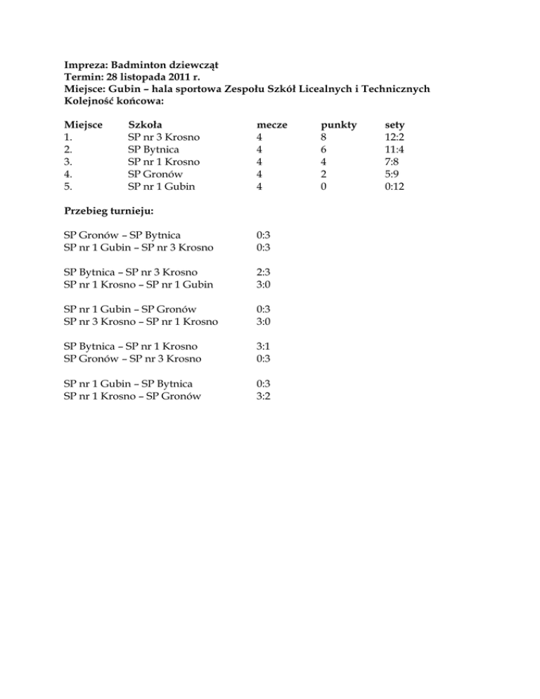 Impreza: Badminton dziewcząt Termin: 28 listopada 2011 r. Miejsce: Gubin – hala sportowa Zespołu Szkół Licealnych i Technicznych Kolejność końcowa: Miejsce 1. 2. 3. 4. 5. Szkoła SP nr 3 Krosno SP Bytnica SP nr 1 Krosno SP Gronów SP nr 1 Gubin mecze 4 4 4 4 4 Przebieg turnieju: SP Gronów – SP Bytnica SP nr 1 Gubin – SP nr 3 Krosno 0:3 0:3 SP Bytnica – SP nr 3 Krosno SP nr 1 Krosno – SP nr 1 Gubin 2:3 3:0 SP nr 1 Gubin – SP Gronów SP nr 3 Krosno – SP nr 1 Krosno 0:3 3:0 SP Bytnica – SP nr 1 Krosno SP Gronów – SP nr 3 Krosno 3:1 0:3 SP nr 1 Gubin – SP Bytnica SP nr 1 Krosno – SP Gronów 0:3 3:2 punkty 8 6 4 2 0 sety 12:2 11:4 7:8 5:9 0:12 Impreza: Badminton chłopców Termin: 28 listopada 2011 r. Miejsce: Gubin – hala sportowa Zespołu Szkół Licealnych i Technicznych Kolejność końcowa: Miejsce 1. 2. 3. 4. 5. Szkoła SP nr 3 Krosno SP Bobrowice SP nr 1 Krosno SP Bytnica SP nr 1 Gubin mecze 4 4 4 4 4 Przebieg turnieju: SP Bytnica – SP nr 1 Gubin SP nr 3 Krosno – SP Bobrowice 3:1 3:1 SP nr 1 Gubin – SP nr 1 Krosno SP Bytnica – SP nr 3 Krosno 0:3 0:3 SP nr 3 Krosno – SP nr 1 Gubin SP nr 1 Krosno – SP Bobrowice 3:0 1:3 SP nr 1 Gubin – SP Bobrowice SP Bytnica – SP nr 1 Krosno 0:3 0:3 SP nr 1 Krosno – SP nr 3 Krosno SP Bobrowice – SP Bytnica 1:3 3:0 punkty 8 6 4 2 0 sety 12:2 10:4 8:6 3:10 1:12