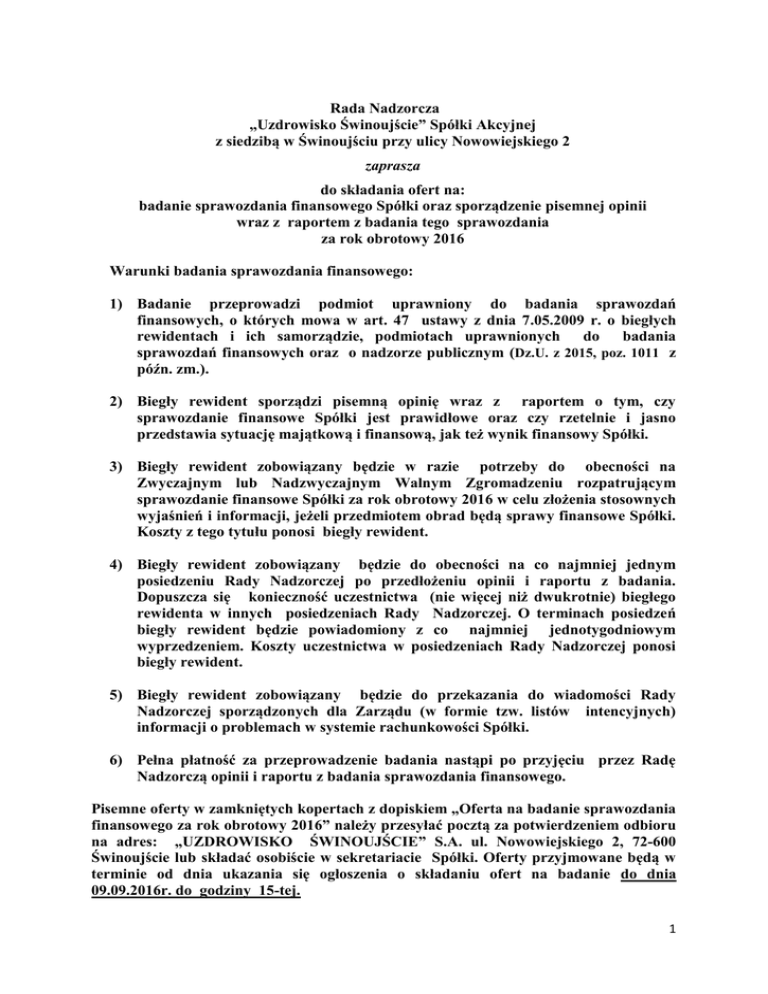 Rada Nadzorcza „Uzdrowisko Świnoujście” Spółki Akcyjnej z siedzibą w Świnoujściu przy ulicy Nowowiejskiego 2 zaprasza do składania ofert na: badanie sprawozdania finansowego Spółki oraz sporządzenie pisemnej opinii wraz z raportem z badania tego sprawozdania za rok obrotowy 2016 Warunki badania sprawozdania finansowego: 1) Badanie przeprowadzi podmiot uprawniony do badania sprawozdań finansowych, o których mowa w art. 47 ustawy z dnia 7.05.2009 r. o biegłych rewidentach i ich samorządzie, podmiotach uprawnionych do badania sprawozdań finansowych oraz o nadzorze publicznym (Dz.U. z 2015, poz. 1011 z późn. zm.). 2) Biegły rewident sporządzi pisemną opinię wraz z raportem o tym, czy sprawozdanie finansowe Spółki jest prawidłowe oraz czy rzetelnie i jasno przedstawia sytuację majątkową i finansową, jak też wynik finansowy Spółki. 3) Biegły rewident zobowiązany będzie w razie potrzeby do obecności na Zwyczajnym lub Nadzwyczajnym Walnym Zgromadzeniu rozpatrującym sprawozdanie finansowe Spółki za rok obrotowy 2016 w celu złożenia stosownych wyjaśnień i informacji, jeżeli przedmiotem obrad będą sprawy finansowe Spółki. Koszty z tego tytułu ponosi biegły rewident. 4) Biegły rewident zobowiązany będzie do obecności na co najmniej jednym posiedzeniu Rady Nadzorczej po przedłożeniu opinii i raportu z badania. Dopuszcza się konieczność uczestnictwa (nie więcej niż dwukrotnie) biegłego rewidenta w innych posiedzeniach Rady Nadzorczej. O terminach posiedzeń biegły rewident będzie powiadomiony z co najmniej jednotygodniowym wyprzedzeniem. Koszty uczestnictwa w posiedzeniach Rady Nadzorczej ponosi biegły rewident. 5) Biegły rewident zobowiązany będzie do przekazania do wiadomości Rady Nadzorczej sporządzonych dla Zarządu (w formie tzw. listów intencyjnych) informacji o problemach w systemie rachunkowości Spółki. 6) Pełna płatność za przeprowadzenie badania nastąpi po przyjęciu przez Radę Nadzorczą opinii i raportu z badania sprawozdania finansowego. Pisemne oferty w zamkniętych kopertach z dopiskiem „Oferta na badanie sprawozdania finansowego za rok obrotowy 2016” należy przesyłać pocztą za potwierdzeniem odbioru na adres: „UZDROWISKO ŚWINOUJŚCIE” S.A. ul. Nowowiejskiego 2, 72-600 Świnoujście lub składać osobiście w sekretariacie Spółki. Oferty przyjmowane będą w terminie od dnia ukazania się ogłoszenia o składaniu ofert na badanie do dnia 09.09.2016r. do godziny 15-tej. 1 Oferta powinna zawierać: 1) informacje o oferencie (określenie firmy i siedziby oraz formy prowadzenia działalności, wpis do rejestru biegłych rewidentów z podaniem numeru i daty wpisu, wpis na listę podmiotów uprawnionych do badania sprawozdań finansowych z podaniem numeru i daty wpisu, liczba zatrudnionych biegłych rewidentów); 2) oświadczenie o spełnieniu przez biegłego rewidenta ustawowo określonych warunków do wyrażania bezstronnej i niezależnej opinii o badanym sprawozdaniu finansowym; 3) oświadczenie o przyjęciu zobowiązania uczestnictwa – w razie zaistnienia takiej konieczności - w Zwyczajnym/Nadzwyczajnym Walnym Zgromadzeniu lub posiedzeniach Rady Nadzorczej na warunkach określonych w ogłoszeniu; 4) cenę za badanie sprawozdania finansowego i sporządzenie pisemnej opinii o badanym sprawozdaniu wraz z raportem z badania sprawozdania; cena powinna uwzględniać wszelkie koszty związane z przeprowadzeniem badania; 5) wskazanie metod i terminów badania sprawozdania finansowego; 6) określenie składu zespołu przeprowadzającego badanie, z wyszczególnieniem osób posiadających uprawnienia biegłego rewidenta; 7) informacje o przeprowadzonych badaniach sprawozdania finansowego w spółkach prawa handlowego, w tym spółkach branży uzdrowiskowej; 8) referencje. Kryterium oceny ofert będą: cena, doświadczenie w badaniu sprawozdań finansowych spółek prawa handlowego, w tym spółek branży uzdrowiskowej oraz referencje. Otwarcie ofert i wybór podmiotu/biegłego rewidenta do badania sprawozdania finansowego Spółki za rok 2016 nastąpi w siedzibie Spółki do dnia 30.09.2016 r. Oferty złożone po upływie terminu określonego do ich przyjmowania nie podlegają rozpatrzeniu. Rada Nadzorcza zastrzega sobie prawo unieważnienia postępowania ofertowego na każdym etapie bez konieczności uzasadnienia unieważnienia. 2