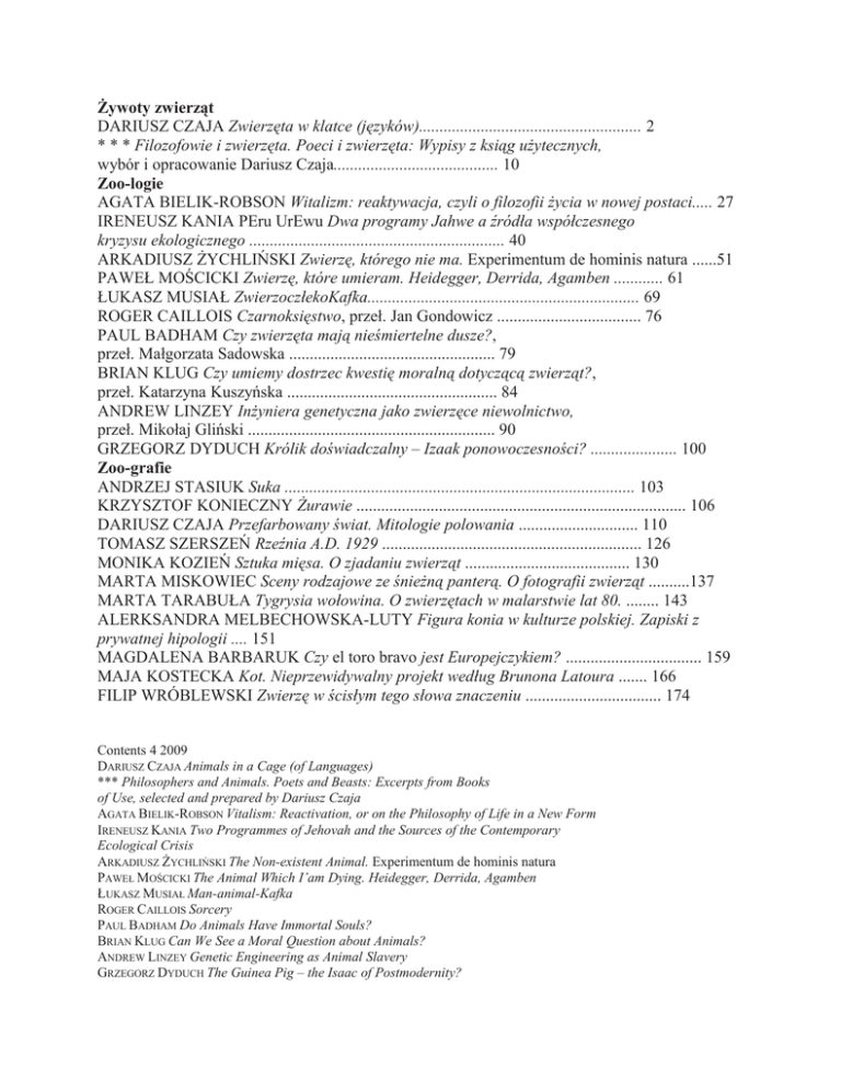 Żywoty zwierząt DARIUSZ CZAJA Zwierzęta w klatce (języków)...................................................... 2 * * * Filozofowie i zwierzęta. Poeci i zwierzęta: Wypisy z ksiąg użytecznych, wybór i opracowanie Dariusz Czaja........................................ 10 Zoo-logie AGATA BIELIK-ROBSON Witalizm: reaktywacja, czyli o filozofii życia w nowej postaci..... 27 IRENEUSZ KANIA PEru UrEwu Dwa programy Jahwe a źródła współczesnego kryzysu ekologicznego .............................................................. 40 ARKADIUSZ ŻYCHLIŃSKI Zwierzę, którego nie ma. Experimentum de hominis natura ......51 PAWEŁ MOŚCICKI Zwierzę, które umieram. Heidegger, Derrida, Agamben ............ 61 ŁUKASZ MUSIAŁ ZwierzoczłekoKafka.................................................................. 69 ROGER CAILLOIS Czarnoksięstwo, przeł. Jan Gondowicz ................................... 76 PAUL BADHAM Czy zwierzęta mają nieśmiertelne dusze?, przeł. Małgorzata Sadowska .................................................. 79 BRIAN KLUG Czy umiemy dostrzec kwestię moralną dotyczącą zwierząt?, przeł. Katarzyna Kuszyńska ................................................... 84 ANDREW LINZEY Inżyniera genetyczna jako zwierzęce niewolnictwo, przeł. Mikołaj Gliński ............................................................ 90 GRZEGORZ DYDUCH Królik doświadczalny – Izaak ponowoczesności? ..................... 100 Zoo-grafie ANDRZEJ STASIUK Suka ..................................................................................... 103 KRZYSZTOF KONIECZNY Żurawie ................................................................................ 106 DARIUSZ CZAJA Przefarbowany świat. Mitologie polowania ............................. 110 TOMASZ SZERSZEŃ Rzeźnia A.D. 1929 ............................................................... 126 MONIKA KOZIEŃ Sztuka mięsa. O zjadaniu zwierząt ........................................ 130 MARTA MISKOWIEC Sceny rodzajowe ze śnieżną panterą. O fotografii zwierząt ..........137 MARTA TARABUŁA Tygrysia wołowina. O zwierzętach w malarstwie lat 80. ........ 143 ALERKSANDRA MELBECHOWSKA-LUTY Figura konia w kulturze polskiej. Zapiski z prywatnej hipologii .... 151 MAGDALENA BARBARUK Czy el toro bravo jest Europejczykiem? ................................. 159 MAJA KOSTECKA Kot. Nieprzewidywalny projekt według Brunona Latoura ....... 166 FILIP WRÓBLEWSKI Zwierzę w ścisłym tego słowa znaczeniu ................................. 174 Contents 4 2009 DARIUSZ CZAJA Animals in a Cage (of Languages) *** Philosophers and Animals. Poets and Beasts: Excerpts from Books of Use, selected and prepared by Dariusz Czaja AGATA BIELIK-ROBSON Vitalism: Reactivation, or on the Philosophy of Life in a New Form IRENEUSZ KANIA Two Programmes of Jehovah and the Sources of the Contemporary Ecological Crisis ARKADIUSZ ŻYCHLIŃSKI The Non-existent Animal. Experimentum de hominis natura PAWEŁ MOŚCICKI The Animal Which I’am Dying. Heidegger, Derrida, Agamben ŁUKASZ MUSIAŁ Man-animal-Kafka ROGER CAILLOIS Sorcery PAUL BADHAM Do Animals Have Immortal Souls? BRIAN KLUG Can We See a Moral Question about Animals? ANDREW LINZEY Genetic Engineering as Animal Slavery GRZEGORZ DYDUCH The Guinea Pig – the Isaac of Postmodernity? ANDRZEJ STASIUK Bitch KRZYSZTOF KONIECZNY Cranes DARIUSZ CZAJA A Painted World. The Mythologies of the Hunt TOMASZ SZERSZEŃ The Abattoir, 1929 A.D. MONIKA KOZIEŃ A Piece of Meat. On Eating Animals MARTA MISKOWIEC Genre Scenes with a Snow Panther. On Animal Photography MARTA TARABUŁA Tiger Cuts of Beef ALEKSANDRA MELBECHOWSKA-LUTY The Figure of the Horse in Polish Culture. Notes from Private Hypology MAGDALENA BARBARUK Is el toro bravo a European? MAJA KOSTECKA The Cat. An Unforeseeable Project According to Bruno Latour FILIP WRÓBLEWSKI An Animal in the Exact Meaning of the Word