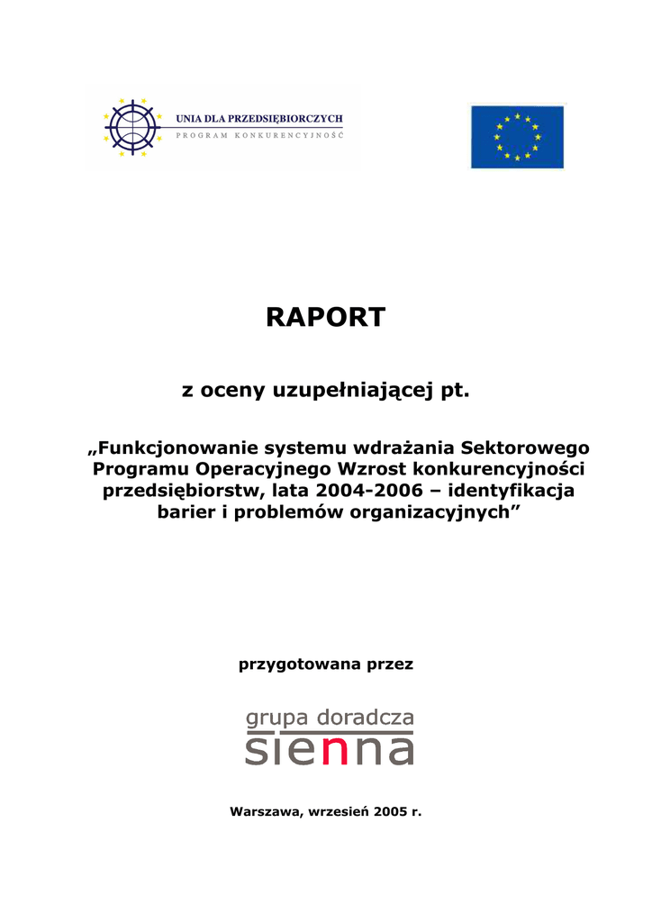 RAPORT z oceny uzupełniającej pt. „Funkcjonowanie systemu wdraŜania Sektorowego Programu Operacyjnego Wzrost konkurencyjności przedsiębiorstw, lata 2004-2006 – identyfikacja barier i problemów organizacyjnych” przygotowana przez Warszawa, wrzesień 2005 r. 1. WSTĘP................................................................................................................... 3 2. OPIS PRZEDMIOTU EWALUACJI ........................................................................ 3 3. METODOLOGIA PRZEPROWADZENIA BADANIA.............................................. 5 3.1 Główne cele badania ................................................................................................................ 5 3.2 Przedmiot badania .................................................................................................................... 5 3.3 Szczegółowy zakres czynności badawczych........................................................................ 6 2.4 Kryteria oceny ........................................................................................................................... 7 3.5 Podejście metodologiczne – podstawowe załoŜenia ............................................................ 8 3.6 Opis przebiegu badania ........................................................................................................... 9 4. TEZY I PYTANIA BADAWCZE ............................................................................ 13 5. OPIS WYNIKÓW BADANIA ................................................................................ 16 5.1 Ocena systemu wdraŜania SPO-WKP, lata 2004 – 2006..................................................... 16 5.2 Analiza funkcjonowania instytucji zaangaŜowanych we wdraŜanie Programu w zakresie wyboru projektów ......................................................................................................................... 29 5.3 Ocena roli partnerów społeczno-ekonomicznych we wdraŜaniu Programu.................... 34 5.4 Identyfikacja barier i problemów organizacyjnych występujących w instytucjach ........ 36 6. WNIOSKI I REKOMENDACJE...................................................................... 39 6.1 Wnioski .................................................................................................................................... 39 6.2 Rekomendacje......................................................................................................................... 44 7. LISTA ZAŁĄCZNIKÓW........................................................................................ 48 2 1. Wstęp Niniejszy raport przedstawia wyniki badania ewaluacyjnego, którego celem była ocena uzupełniająca funkcjonowania systemu wdraŜania Sektorowego Programu Operacyjnego Wzrost konkurencyjności przedsiębiorstw, lata 2004-2006. Krótki termin przeznaczony na realizację zadań badawczych przy szeroko ujętym przez Zamawiającego obszarze badania pozwolił jedynie na zidentyfikowanie i zarysowanie obszarów problemowych dotyczących funkcjonowania systemu. Niektóre z nich dla wyciągnięcia bardziej szczegółowych wniosków wymagały by jeszcze dodatkowych, głębszych analiz. PowyŜsze uwarunkowania zdecydowały tez o wyborze technik badawczych – głównie oparto się na wywiadach indywidualnych i grupowych, co powoduje, ze wyniki analizy maja charakter jakościowy. Niemniej jednak udało się, mimo ograniczonego czasu badania uzupełnić techniki jakościowe, dwoma badaniami kwestionariuszowymi - kwestionariuszowym badaniem opinii pracowników oraz kwestionariuszowym badaniem telefonicznym Ostatecznych Odbiorców Programu. Raport rozpoczyna się prezentacją opisu przedmiotu ewaluacji i przyjętej metodologii przeprowadzenia badania. Główną część raportu stanowi opis wyników badania. Uzyskane wyniki zostały przedstawione w odniesieniu do przyjętych tez badawczych, które równieŜ stanowią część niniejszego raportu. Konkluzją raportu są rekomendacje do kaŜdego z zadań postawionych przez Zamawiającego, dotyczące zmian w funkcjonowaniu systemu wdraŜania Sektorowego Programu Operacyjnego Wzrost konkurencyjności przedsiębiorstw, lata 20042006. 2. Opis przedmiotu ewaluacji Przedmiotem ewaluacji jest system wdraŜania Sektorowego Programu Operacyjnego Wzrost konkurencyjności przedsiębiorstw, lata 2004-2006 (SPO-WKP). Celem SPO-WKP jest poprawa pozycji konkurencyjnej przedsiębiorstw działających na terenie Polski w warunkach Jednolitego Rynku Europejskiego. Sektorowy Program Operacyjny Wzrost konkurencyjności przedsiębiorstw, lata 2004-2006 realizowany jest poprzez przedstawione poniŜej Priorytety i działania, których szczegółowy opis znajduje się w załączniku do rozporządzenia Ministra Gospodarki i Pracy z dnia 1 lipca 2004 r. w sprawie przyjęcia Sektorowego Programu Operacyjnego Wzrost konkurencyjności przedsiębiorstw, lata 2004-2006 (Dz. U. Nr 166, poz. 1744). PRIORYTET 1 Rozwój przedsiębiorczości i wzrost innowacyjności poprzez wzmocnienie instytucji otoczenia biznesu. DZIAŁANIA 1.1 Wzmocnienie instytucji wspierających działalność przedsiębiorstw 1.2 Poprawa dostępności do zewnętrznego finansowania inwestycji przedsiębiorstw 1.3 Tworzenie korzystnych warunków dla rozwoju firm 1.4 Wzmocnienie współpracy między sferą badawczo-rozwojową a gospodarką 1.5 Rozwój systemu dostępu przedsiębiorców do informacji i usług publicznych on-line PRIORYTET 2 Bezpośrednie wsparcie przedsiębiorstw DZIAŁANIA 2.1 Wzrost konkurencyjności małych i średnich przedsiębiorstw poprzez doradztwo 2.2 Wsparcie konkurencyjności produktowej i technologicznej przedsiębiorstw 2.3 Wzrost konkurencyjności małych i średnich przedsiębiorstw poprzez inwestycje 3 2.4 Wsparcie dla przedsięwzięć w zakresie dostosowywania przedsiębiorstw do wymogów ochrony środowiska POMOC TECHNICZNA DZIAŁANIA 3.1 Wsparcie zarządzania SPO-WKP 3.2 Ko
