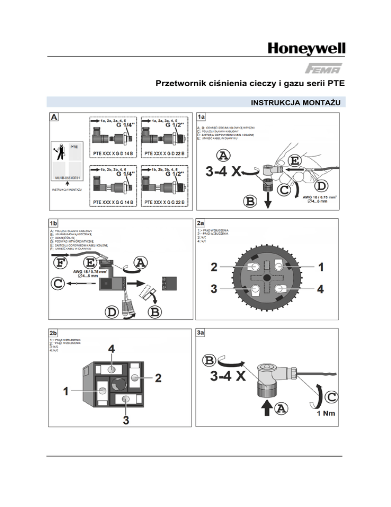 Przetwornik ciśnienia cieczy i gazu serii PTE INSTRUKCJA MONTAŻU PTE – INSTRUKCJA MONTAŻU INSTALACJA UWAGA Przed montażem lub demontażem urządzenia należy, upewnić się że system nie jest pod ciśnieniem, ani pod napięciem! Elementy przetwornika mogą być gorące! Istnieje niebezpieczeństwo poparzenie. Przed montażem/demontażem odczekaj chwilę, by urządzenie oraz rury przy urządzeniu zdążyły ostygnąć. MONTAŻ I POŁOŻENIE Urządzenie montuje się bezpośrednio na rurze poprzez gwint zewnętrzny G1/4" (PTE XXX B X X 14 B) lub G1/2" (PTE XXX B X X 22 B). Do podłączenia potrzebny jest klucz w rozmiarze 27 mm. Urządzenie może być zamontowane w dowolnym położeniu. PRZYŁĄCZE ELEKTRYCZNE Wszystkie przewody muszą być zgodne z obowiązującymi przepisami dotyczącymi instalacji elektrycznych oraz z lokalnymi przepisami (np. zgodne z przepisami VDE). Honeywell sp. z o.o. Ul. Domaniewska 39 B 02‐672 Warszawa Tel.: 22 6060 900 faks; 22 6060 983 www.honeywell.com.pl/automatyka_domow PTE‐m‐pl01rMW0316